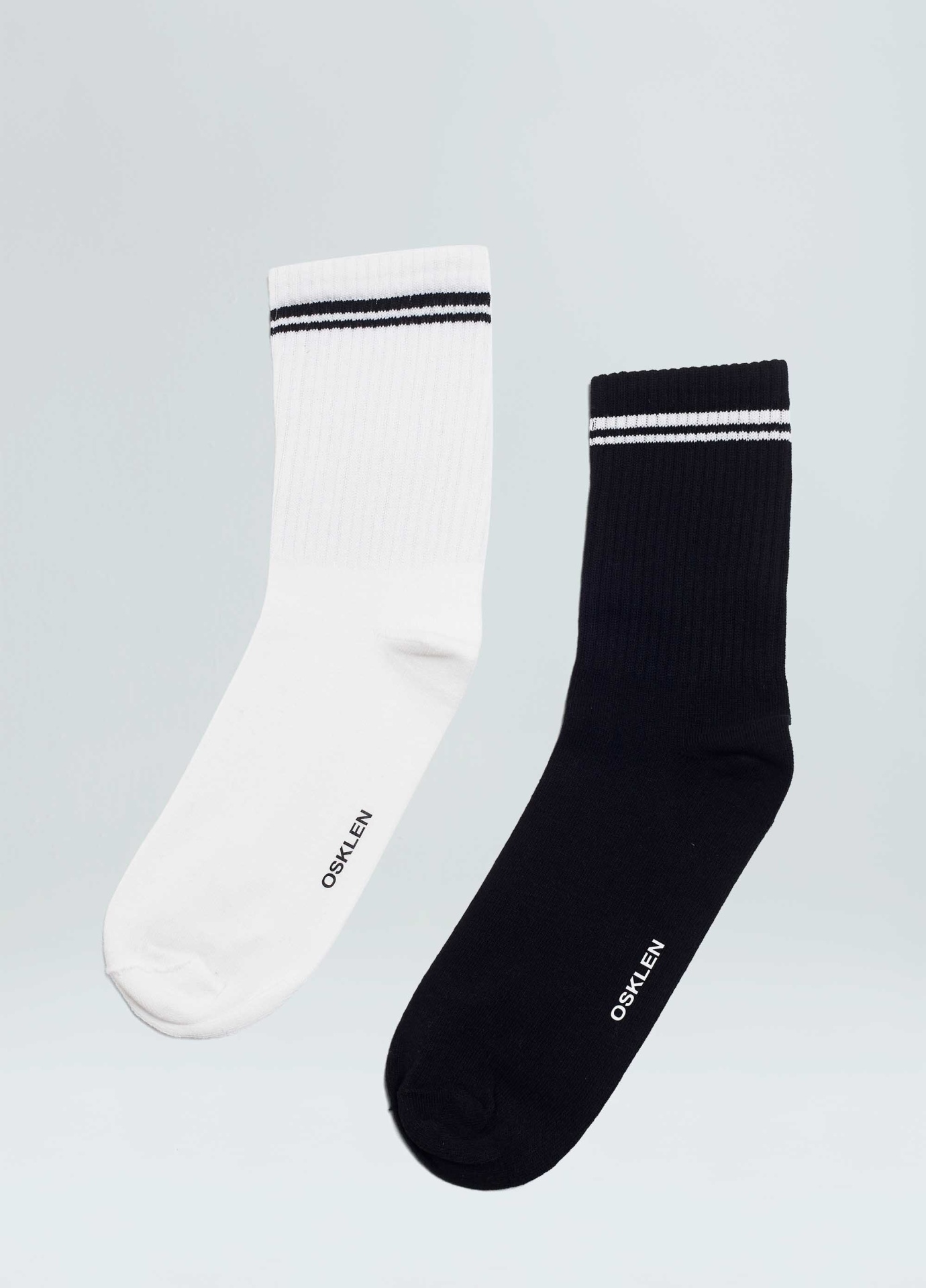 Meia cano alto unissex, desenvolvida em 69% algodão, 16% poliamida, 8% poliéster, 6% elastodieno, 1% elastano. Detalhe de listras finas no cano da meia. Pack possui dois pares de meias, um off White com preto, e o outro preto com off White.
