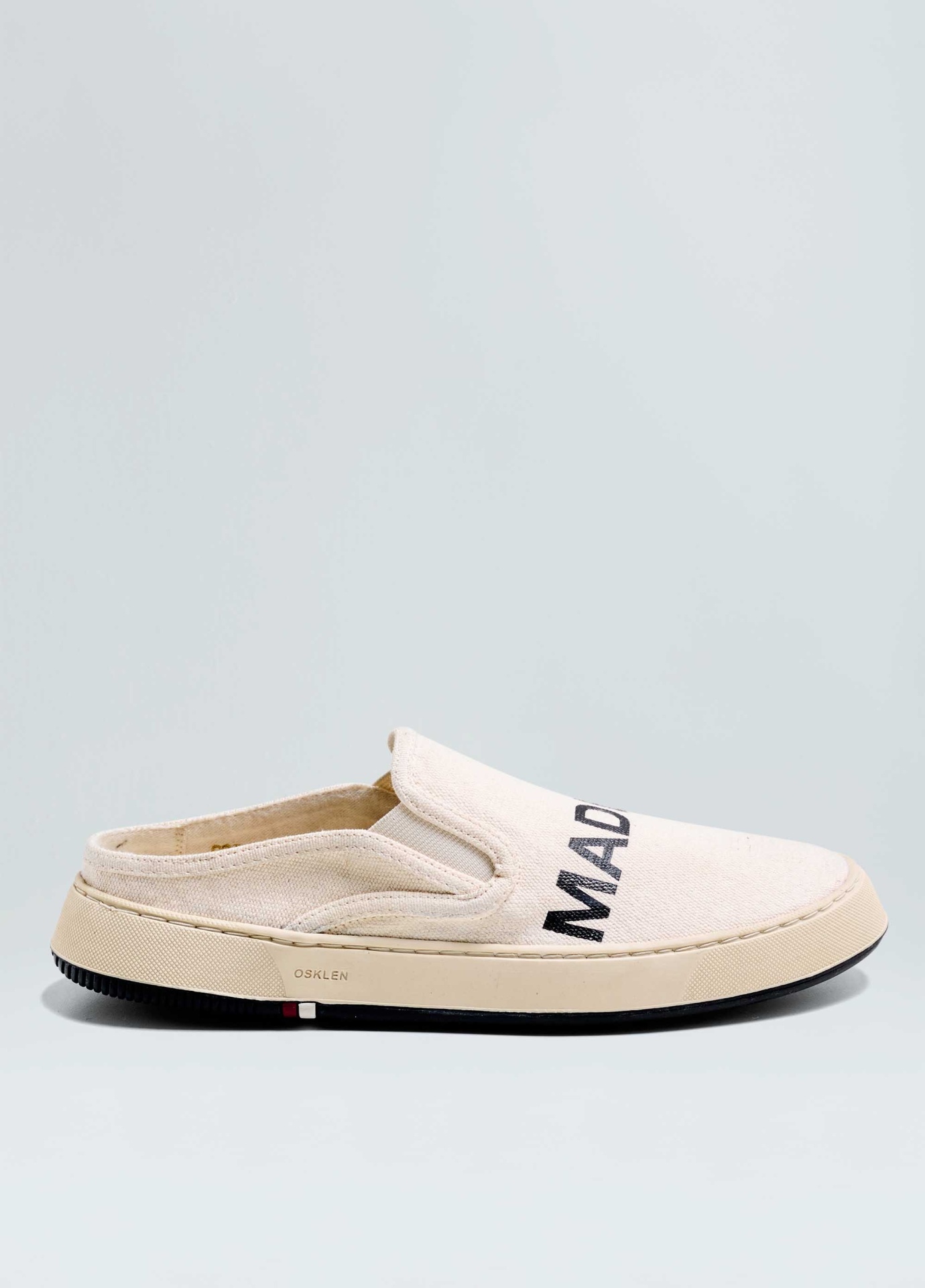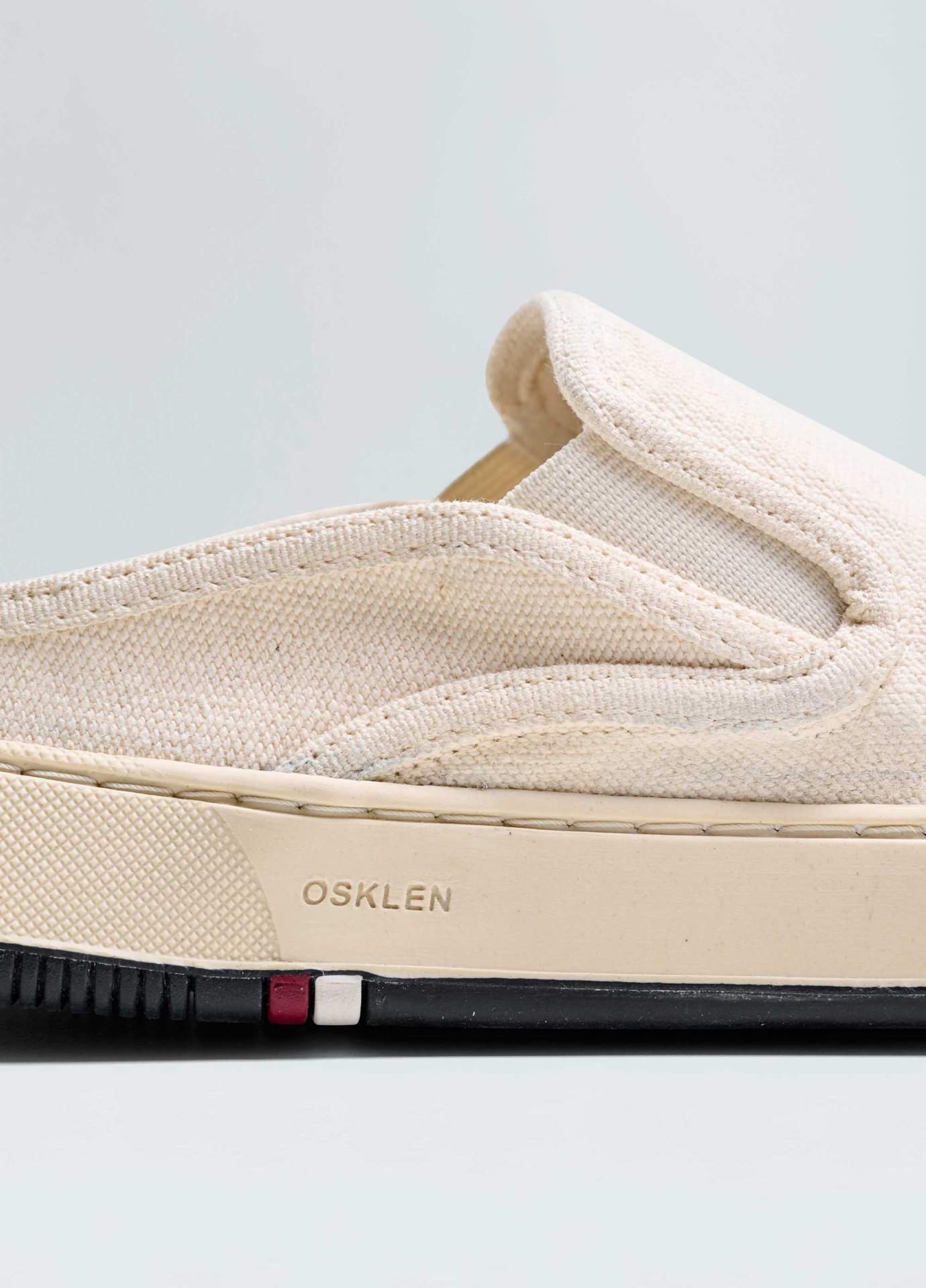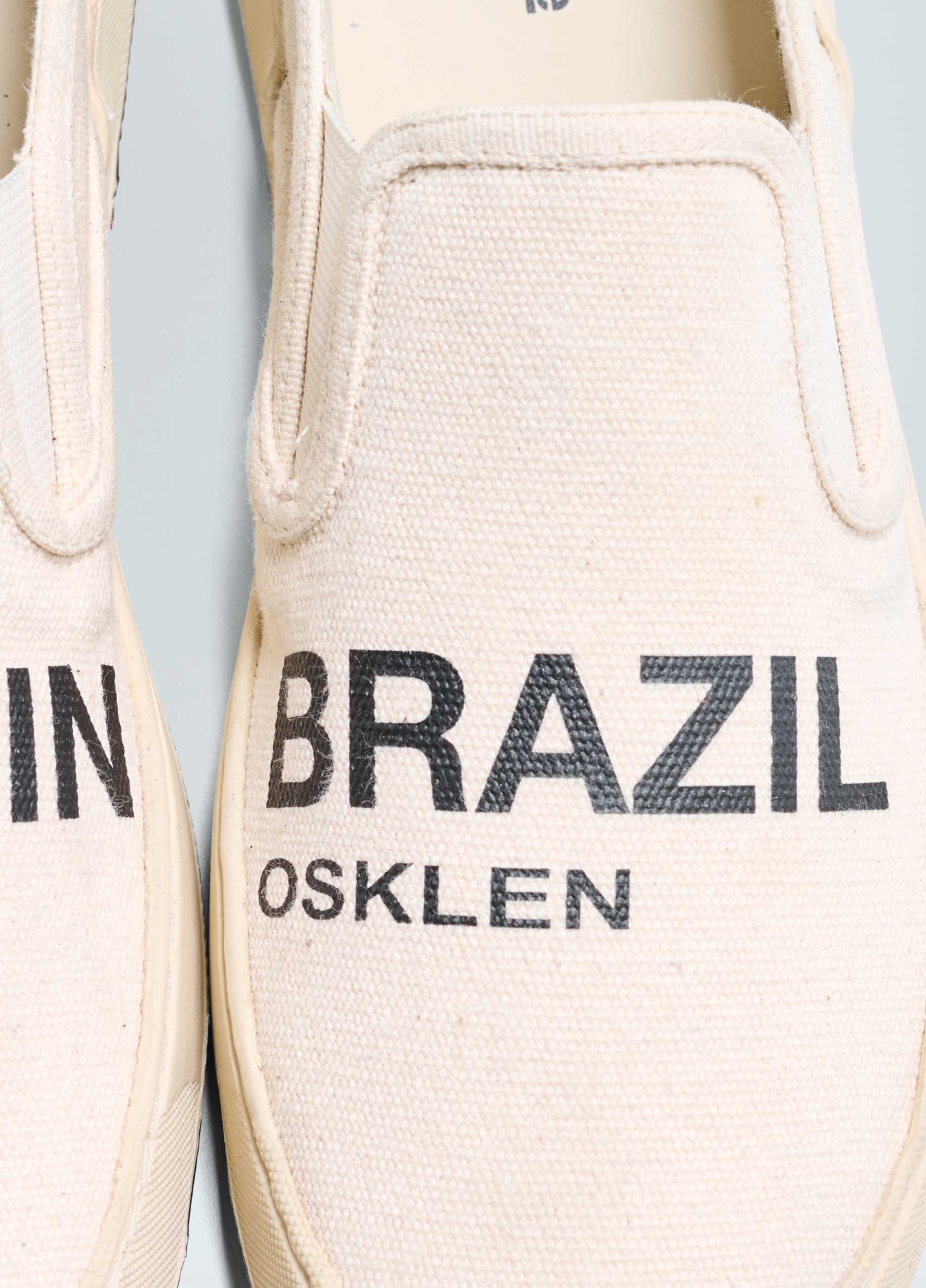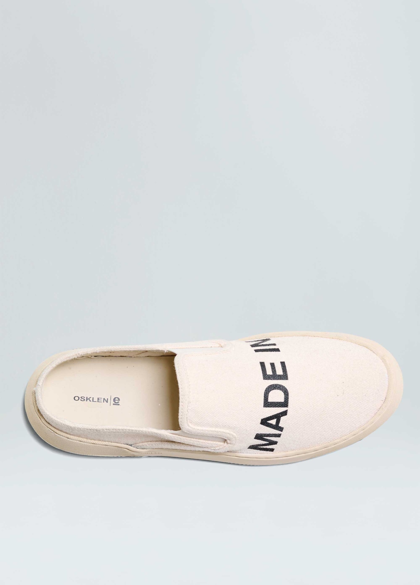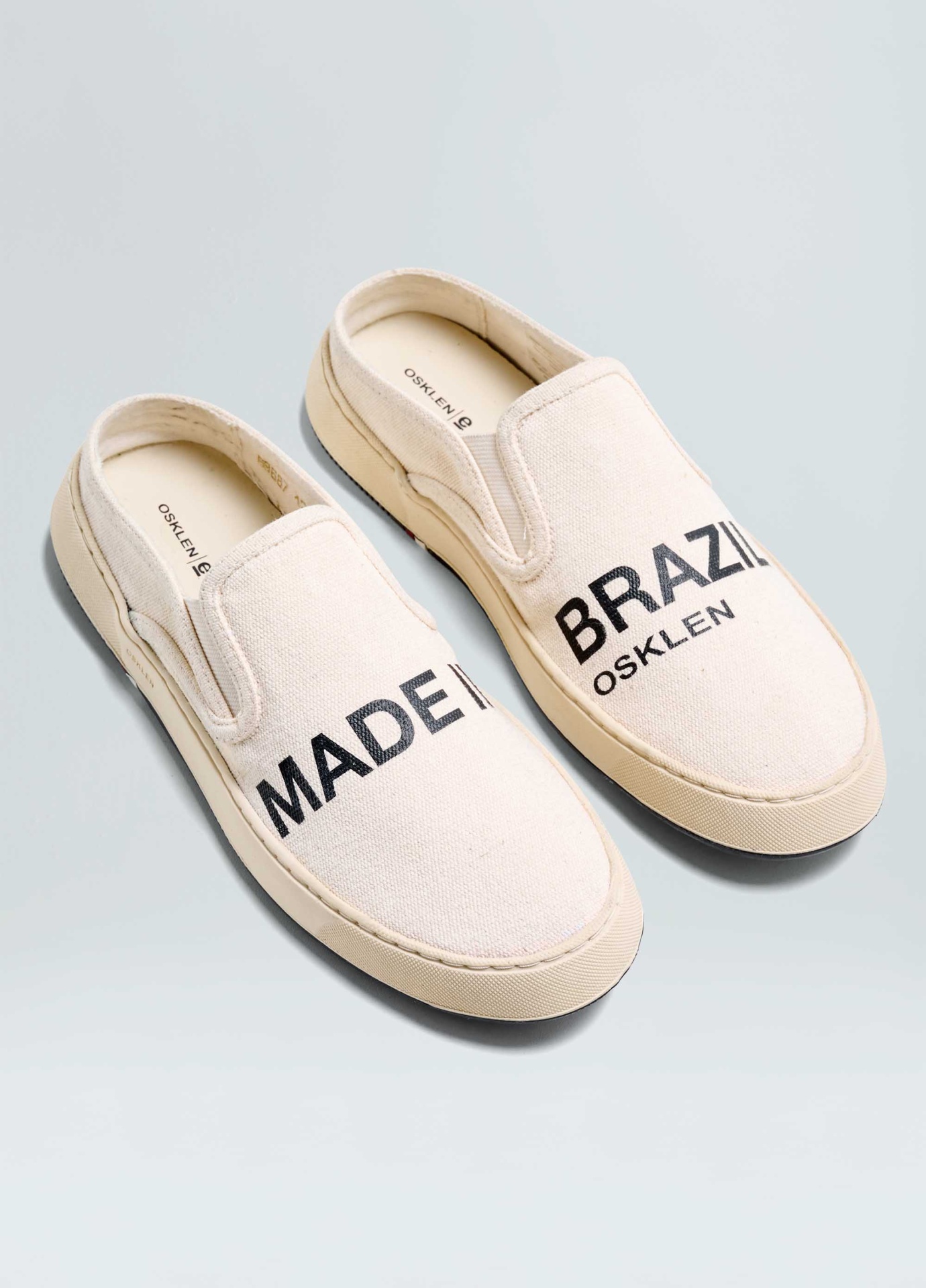 Tênis Soho tipo mule em lona de algodão com assinatura Made in Brazil. Modelo sem amarração com elásticos para facilitar o calce. Forro em sarja de algodão reciclado. Palmilha em couro bovino. Solado de borracha costurado ao cabedal com design exclusivo Osklen, produzido com no mínimo 10% de material reciclado. Produto Re-Design Waste.