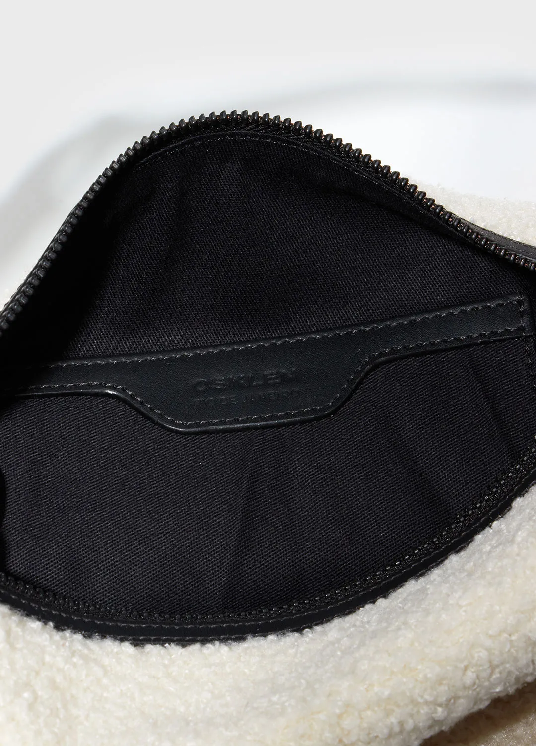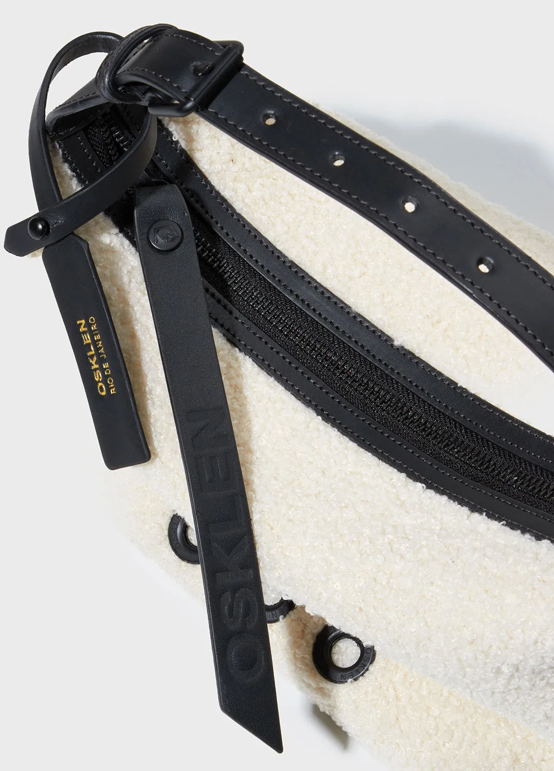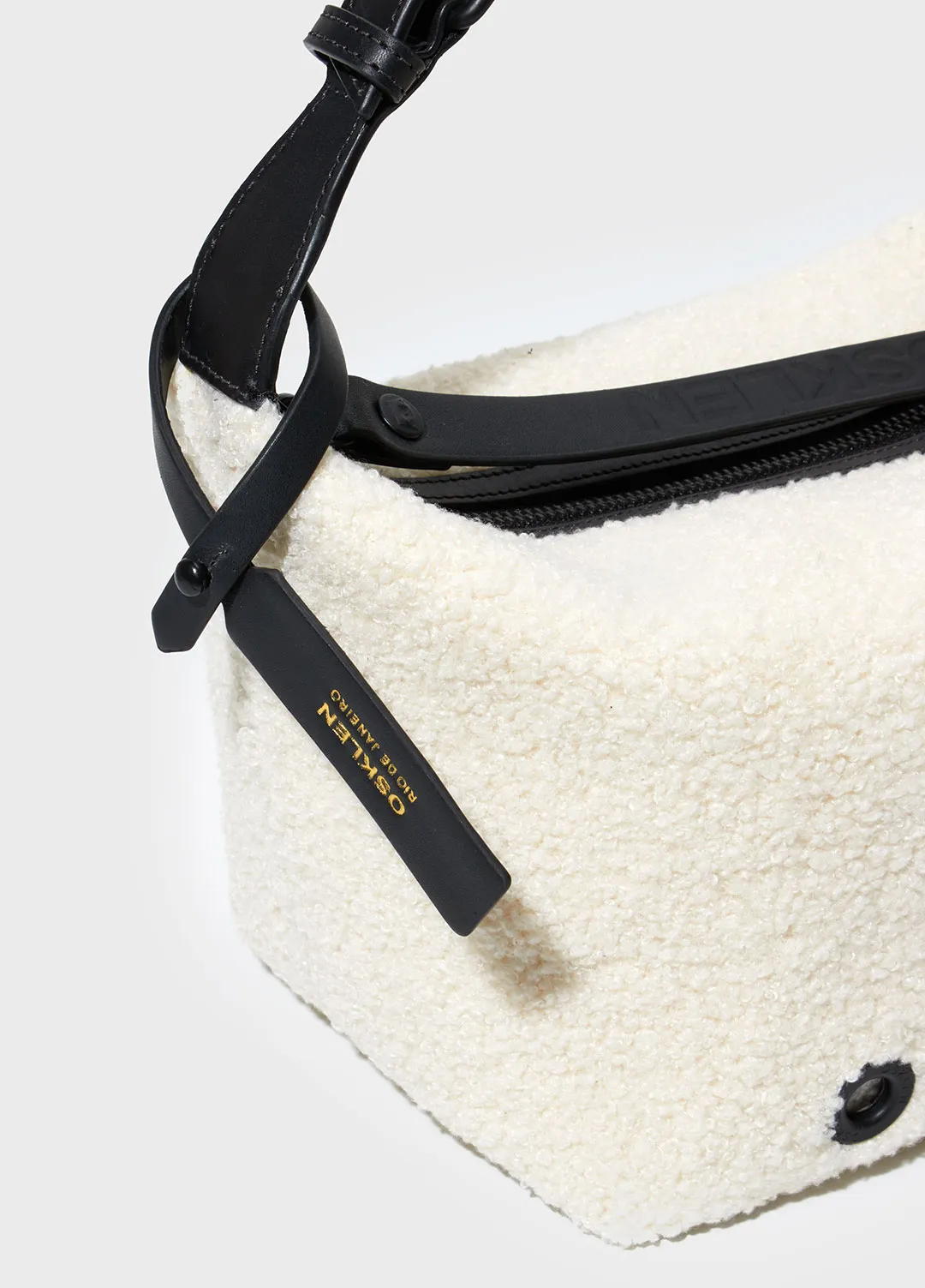 Bolsa de tamanho médio feita em malha felpuda, com detalhes em couro 100% bovino. forro em sarja 100% algodão e bolso interno no mesmo material. como assinaturas osklen, três ilhóses nas costas da bolsa, carimbo no tag de couro e na moldura do bolso inte