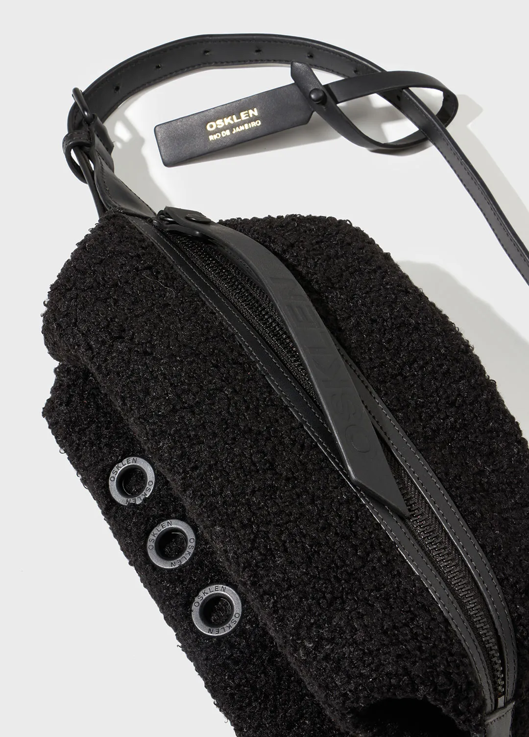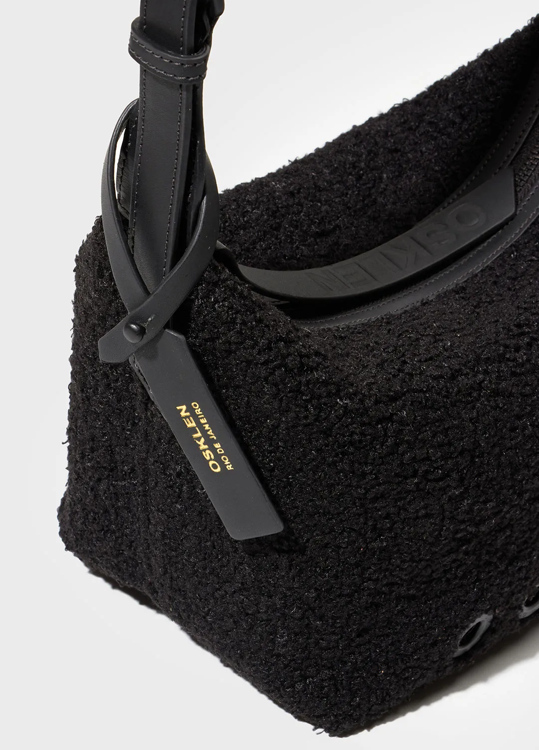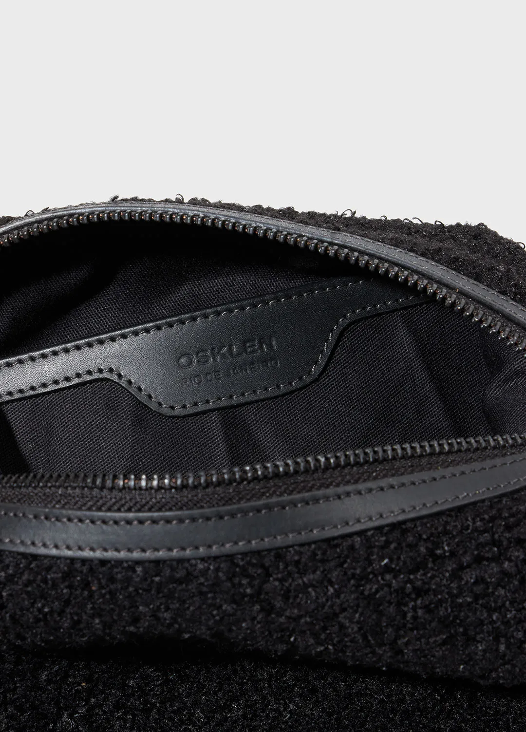 Bolsa de tamanho médio feita em malha felpuda, com detalhes em couro 100% bovino. forro em sarja 100% algodão e bolso interno no mesmo material. como assinaturas osklen, três ilhóses nas costas da bolsa, carimbo no tag de couro e na moldura do bolso inte