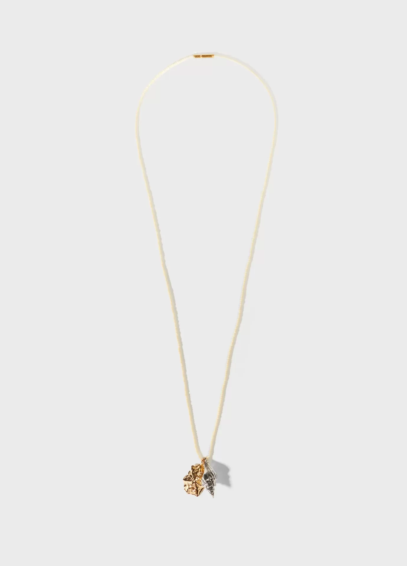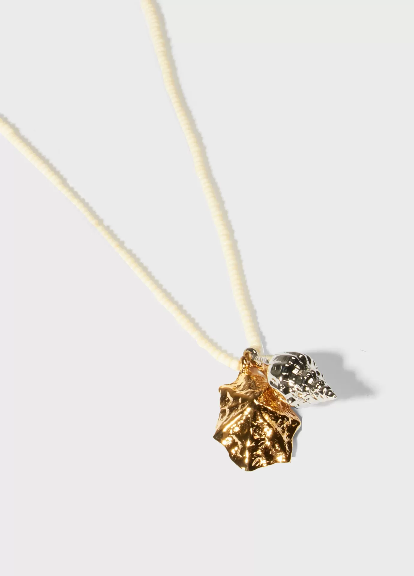Colar longo feito em miçangas com dois pingentes de conchas em metal, um no banho dourado e outro no banho prata. O colar tem fecho discreto de metal dourado.