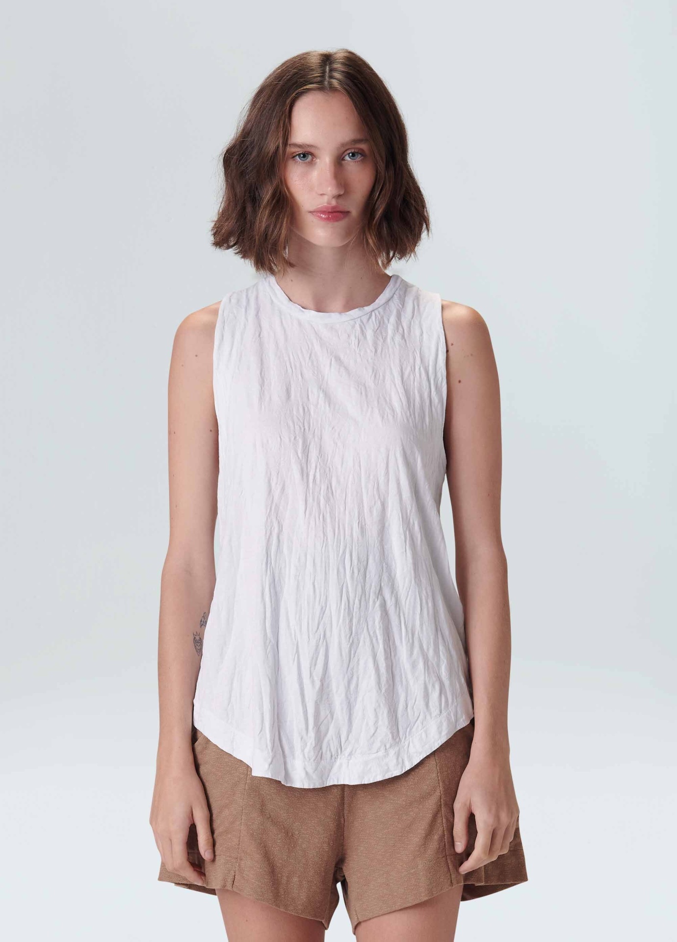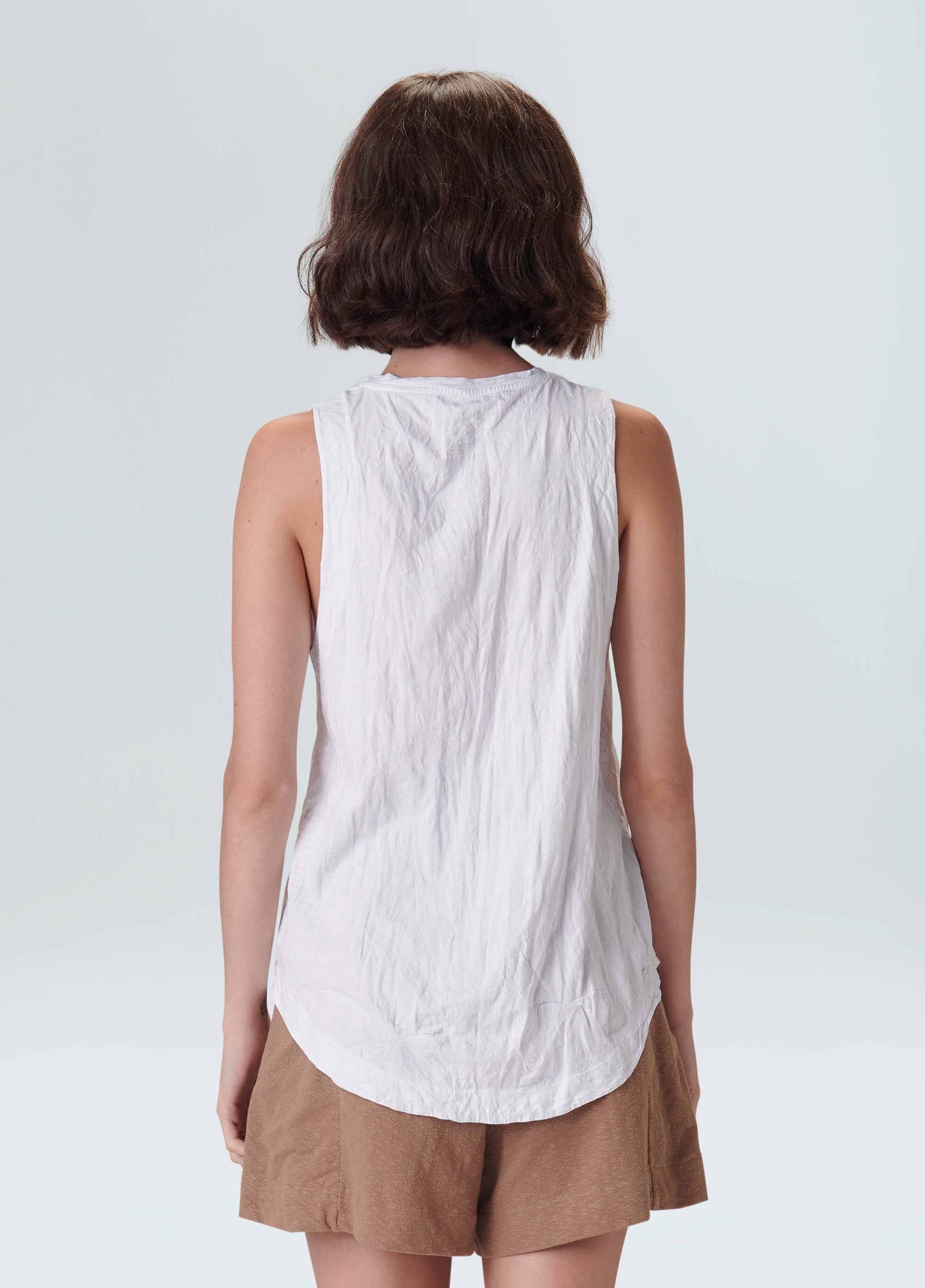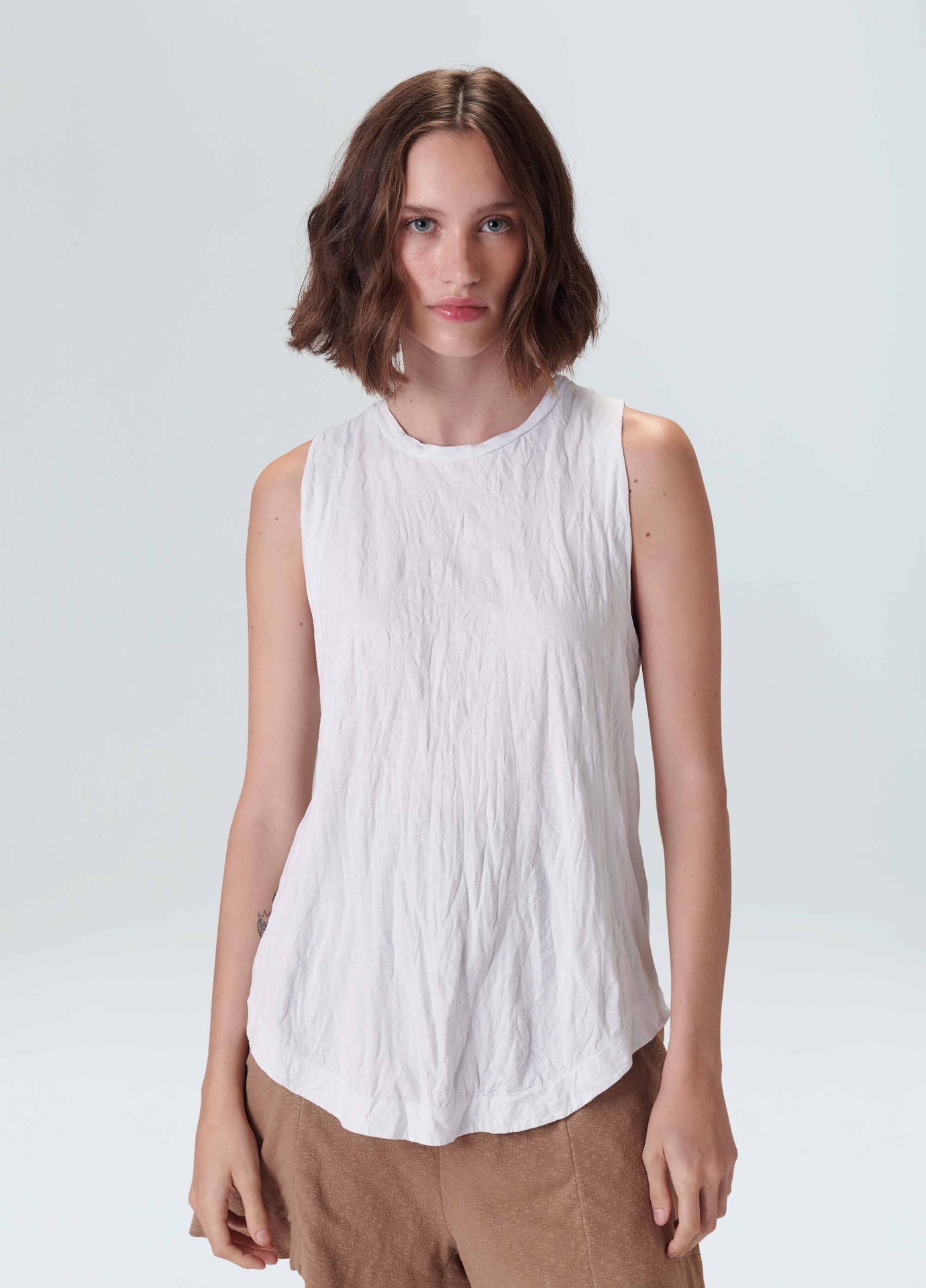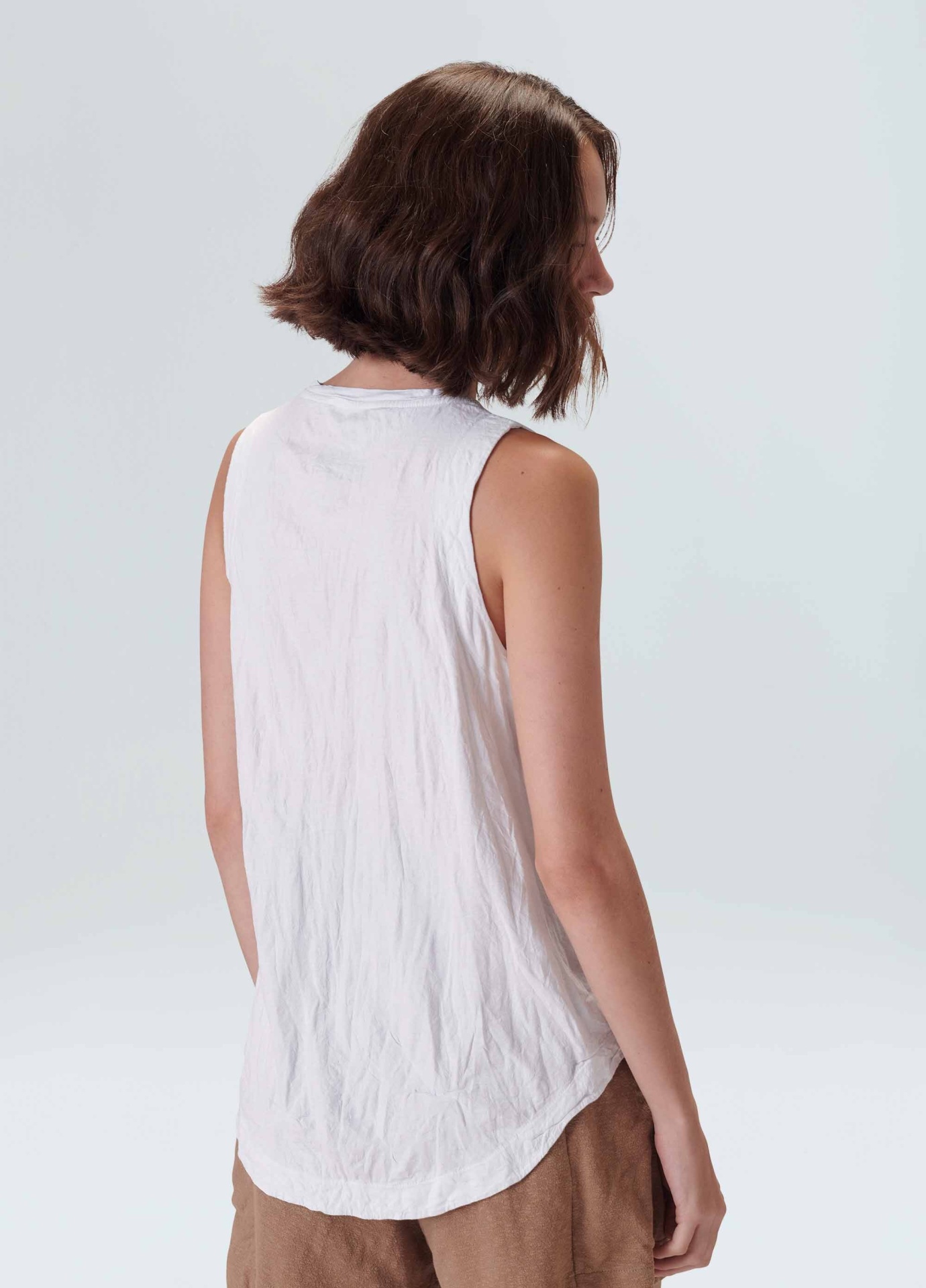 Regata feminina feita em meia malha de algodão. A peça tem gola de t-shirt e cavas no lugar. Sua modelagem é mais ajustada ao corpo no tórax, descendo reta até a barra. Seu diferencial é o amassado proposital, que começou no tecido plano e agora chegou na nossa malharia. Essa é uma peça Regenerate Life, pois foi produzida com algodão nacional certificado seguindo critérios minuciosos de redução dos impactos ambientais e sociais durante seu cultivo. Seu processo produtivo utiliza energia renovável, reduz o consumo de água e fomenta as cadeias produtivas brasileiras. Composição: 100% algodão.