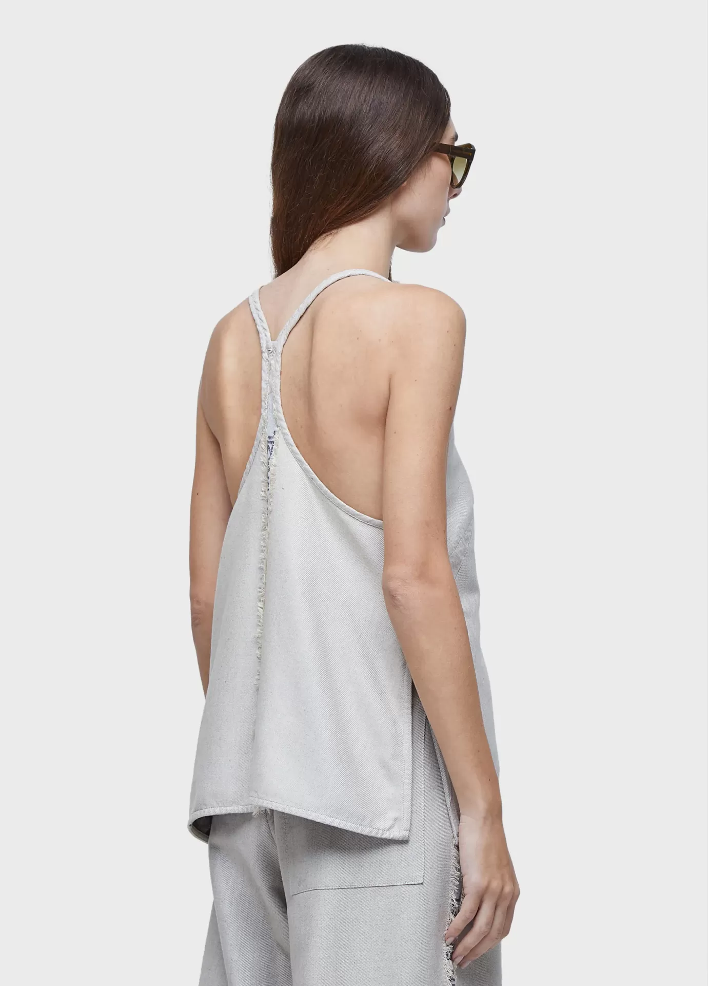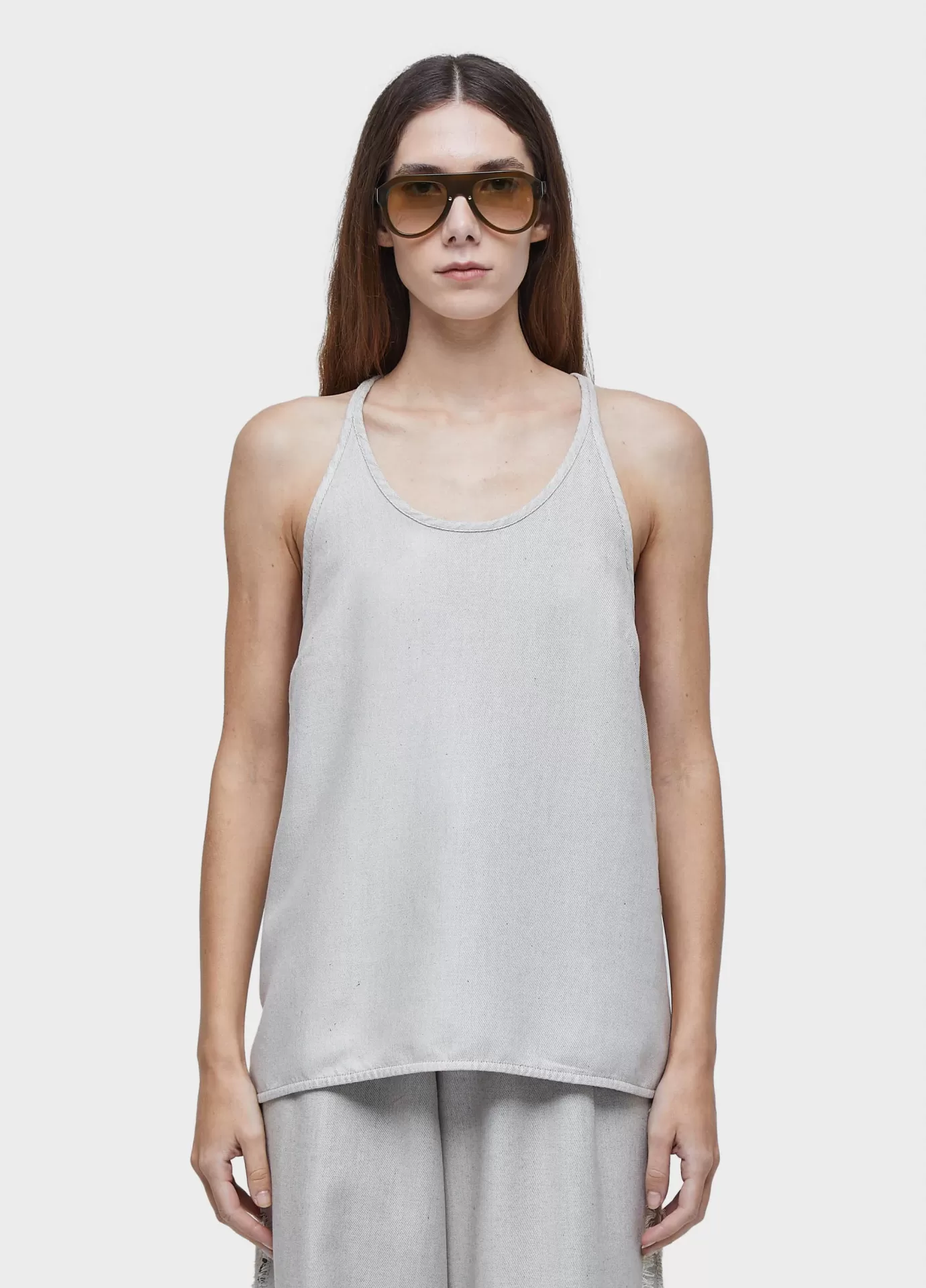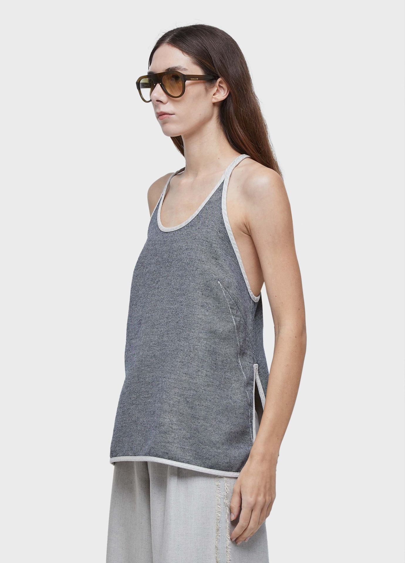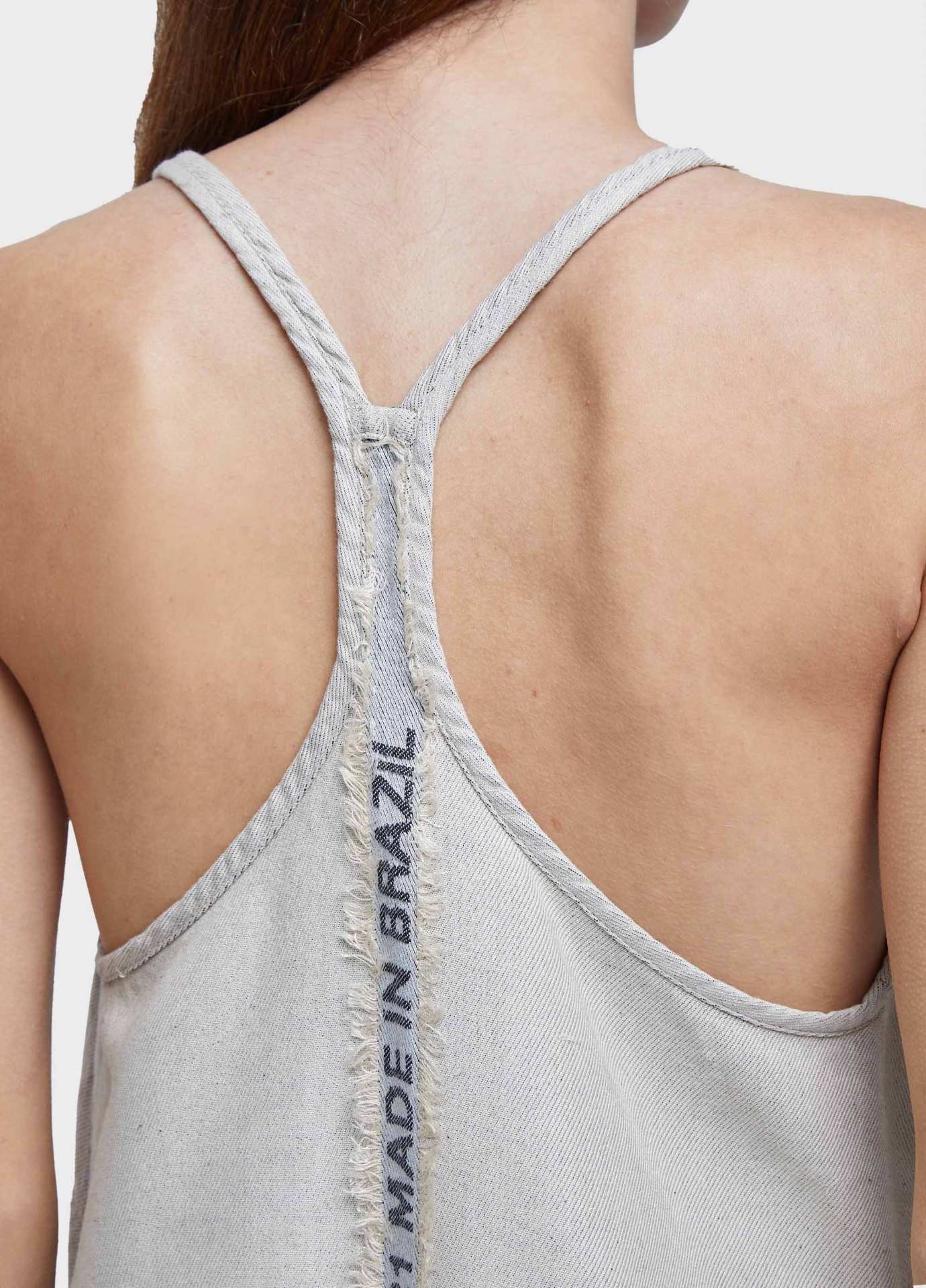 Regata de alcinha com decote nadador bem cavado. comprimento regular. peça dupla face. tecido com arte em jacquard. tecido de algodão com viscose.