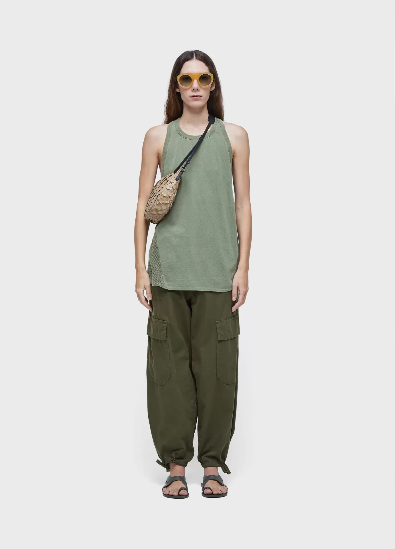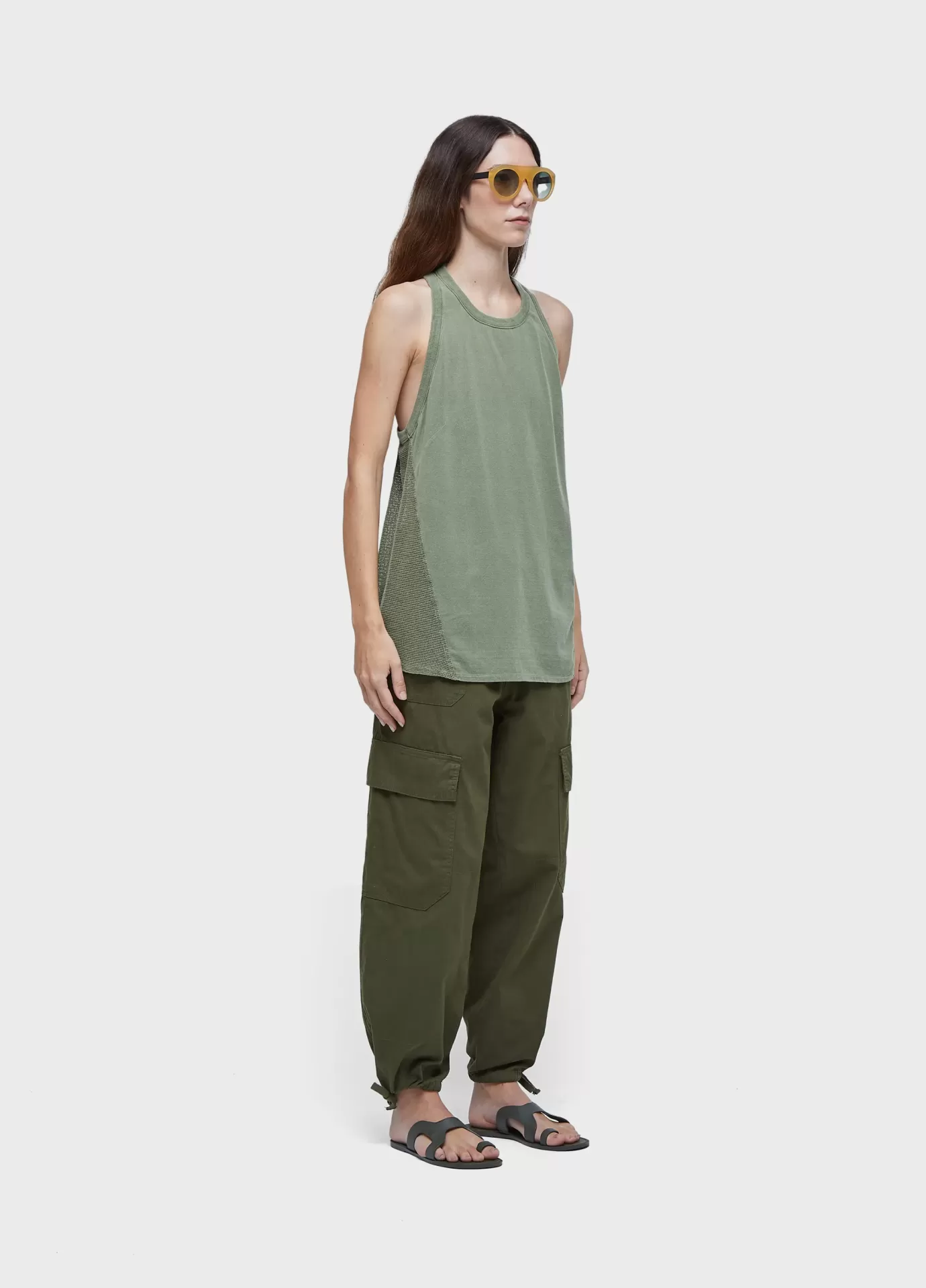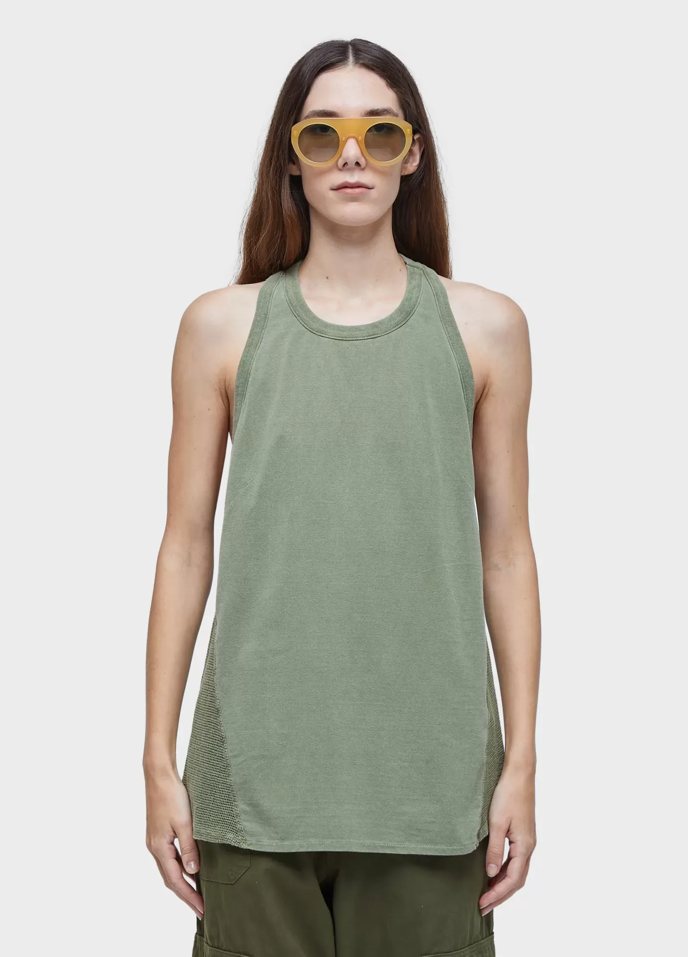 Regata nadador com comprimento longo. mistura de meia malha e tela de algodão. transparente nas costas. modelagem solta no corpo, abre em direção à barra. peça eco dye + andiroba oil.