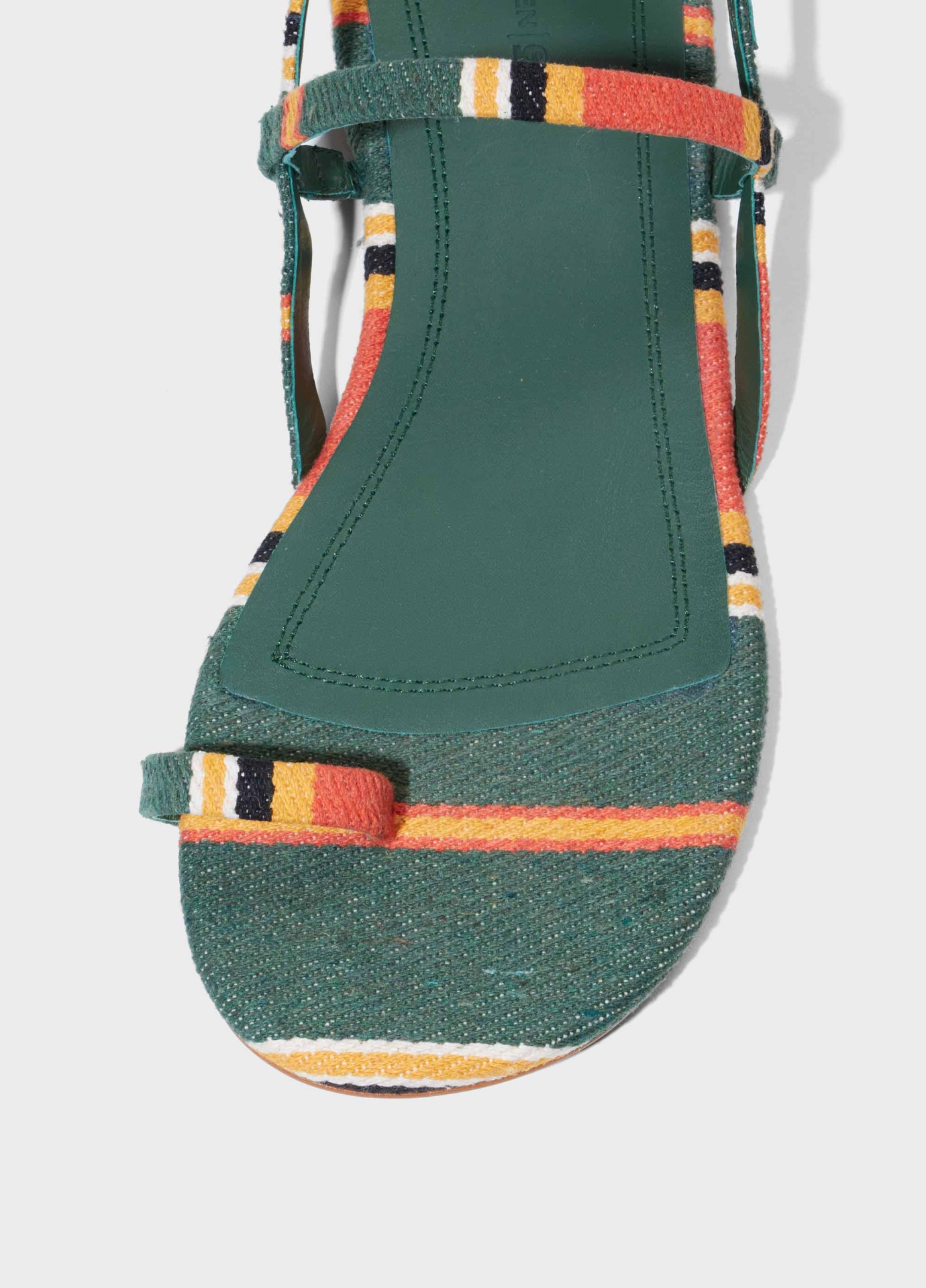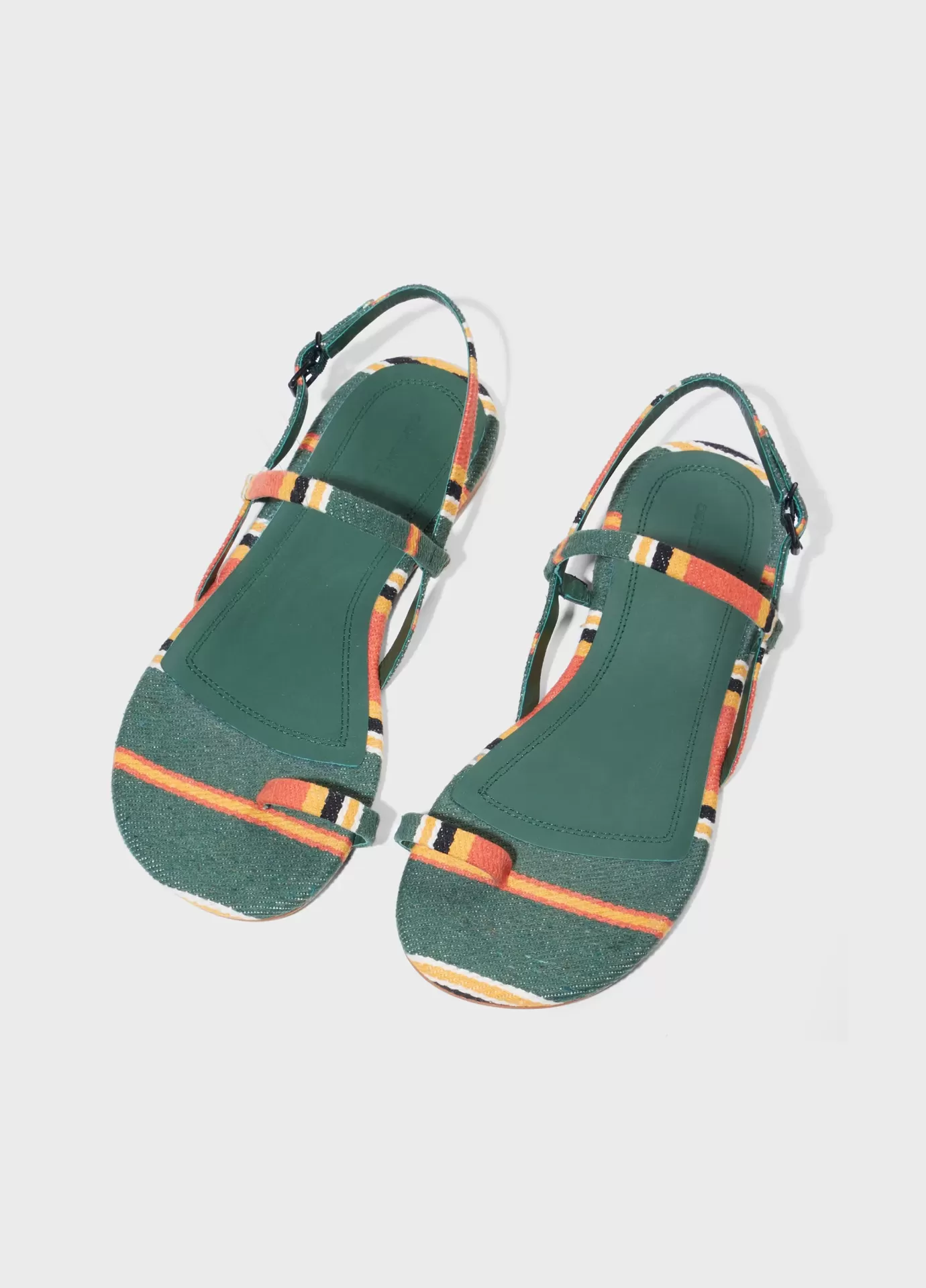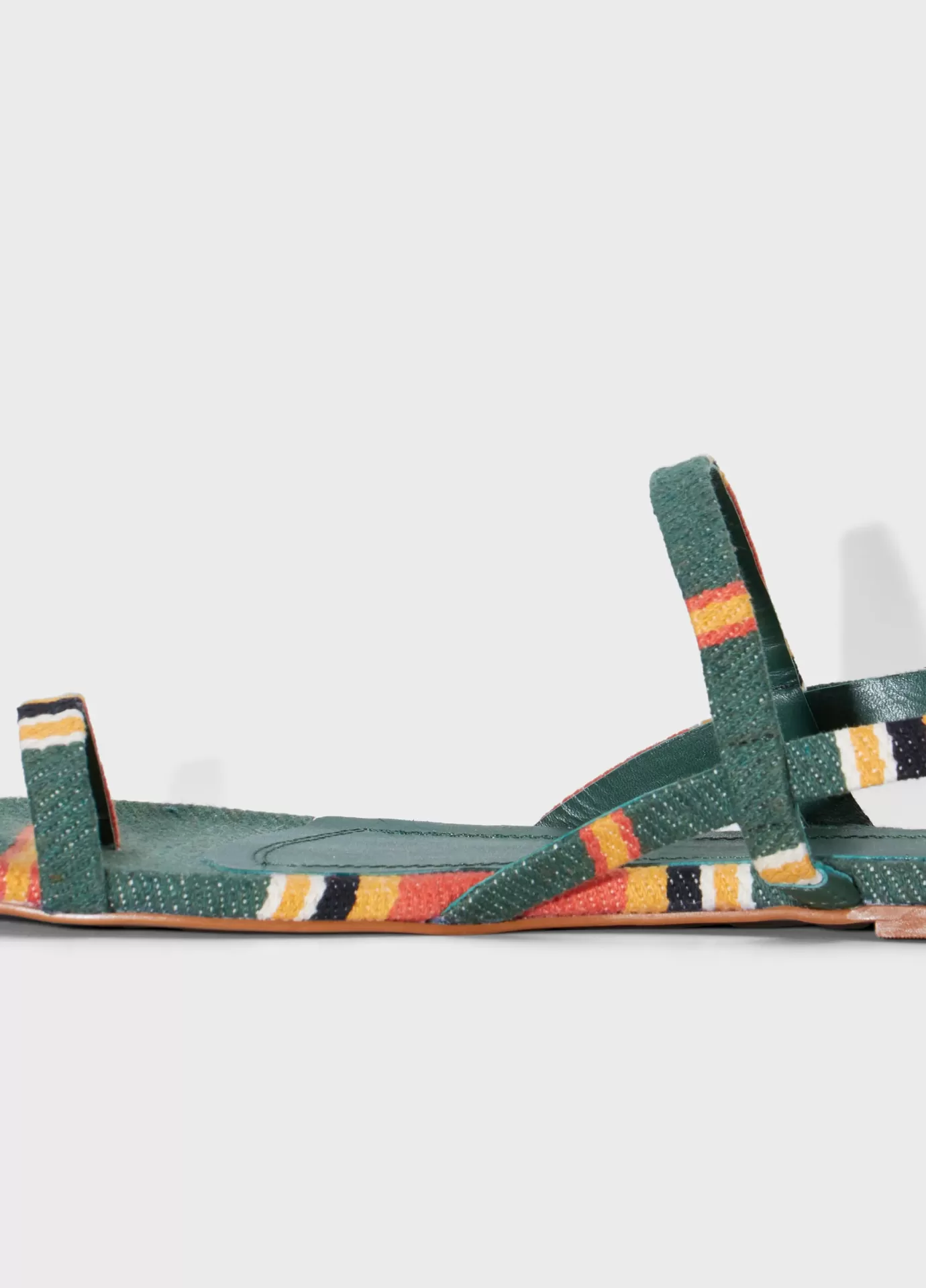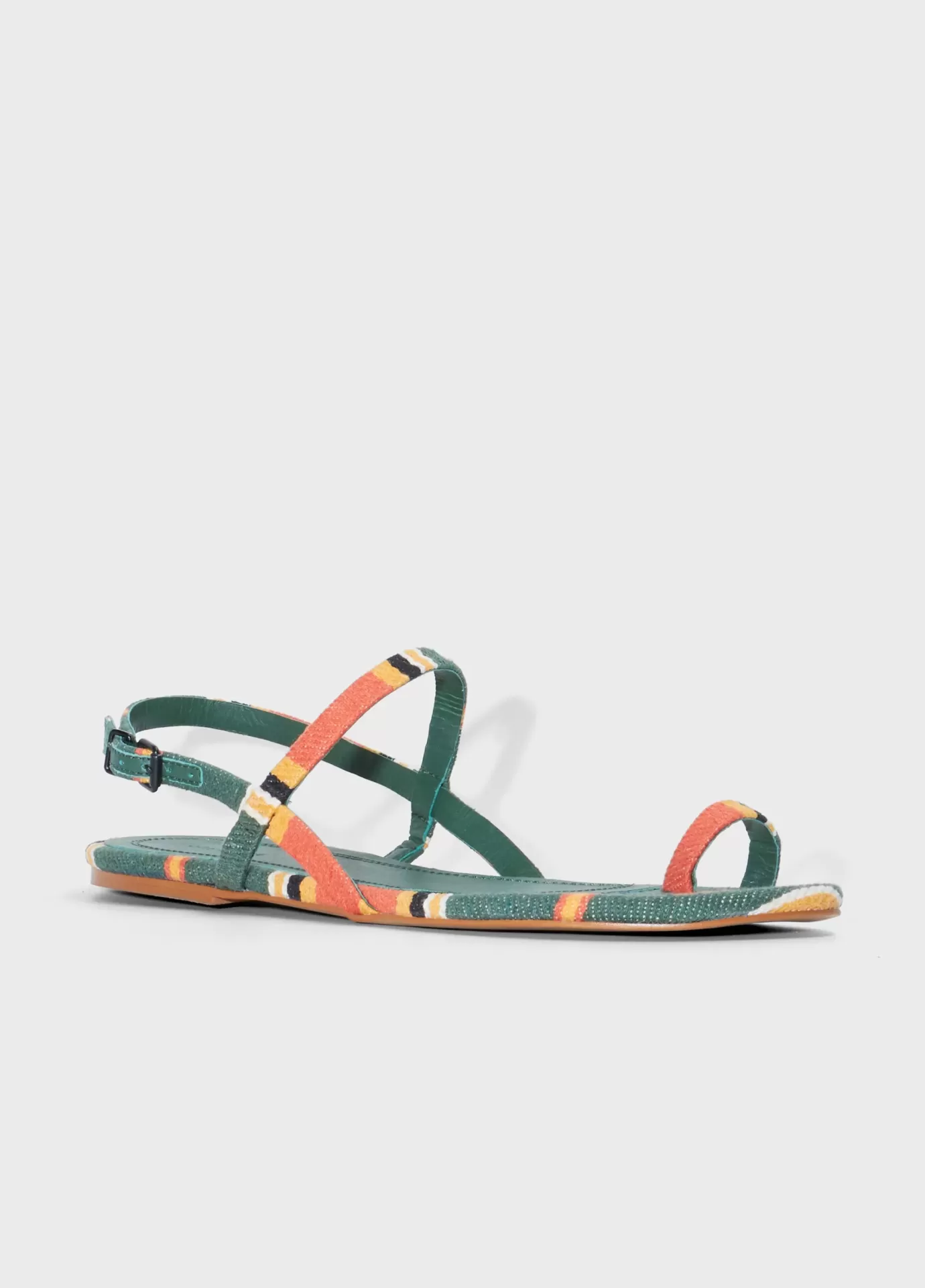 Sandália rasteira forrada em lona sustentável e fechamento por fivela de metal e tira