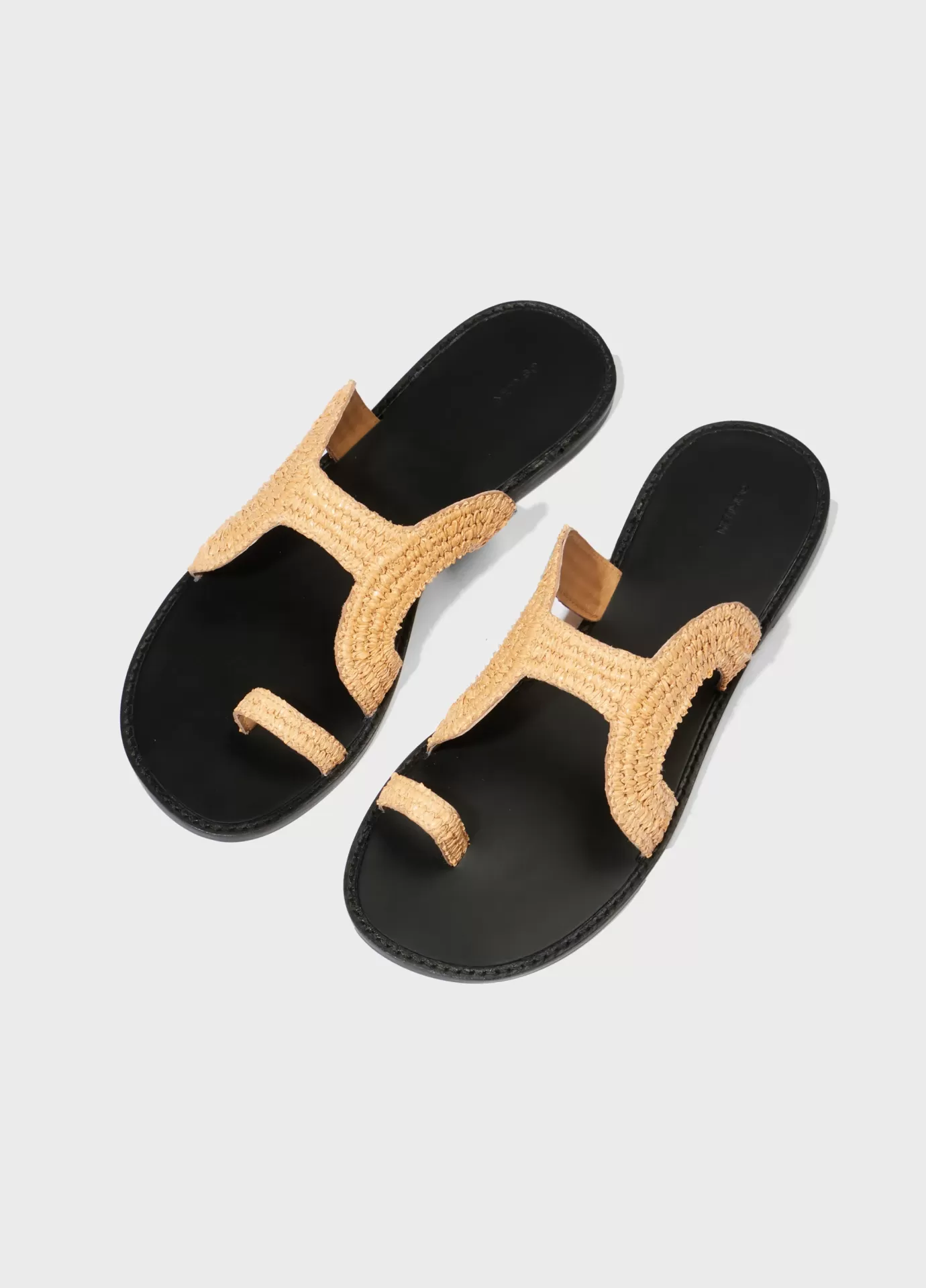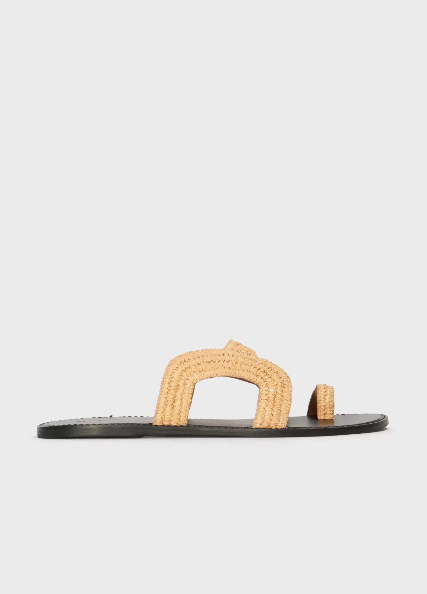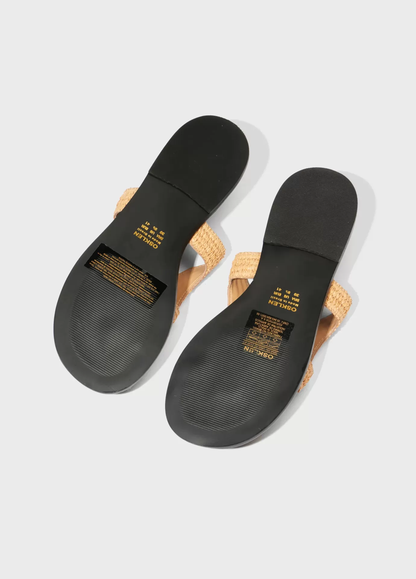 Sandália rasteira com palmilha em couro bovino e cabedal feito em ráfia com desenho i
