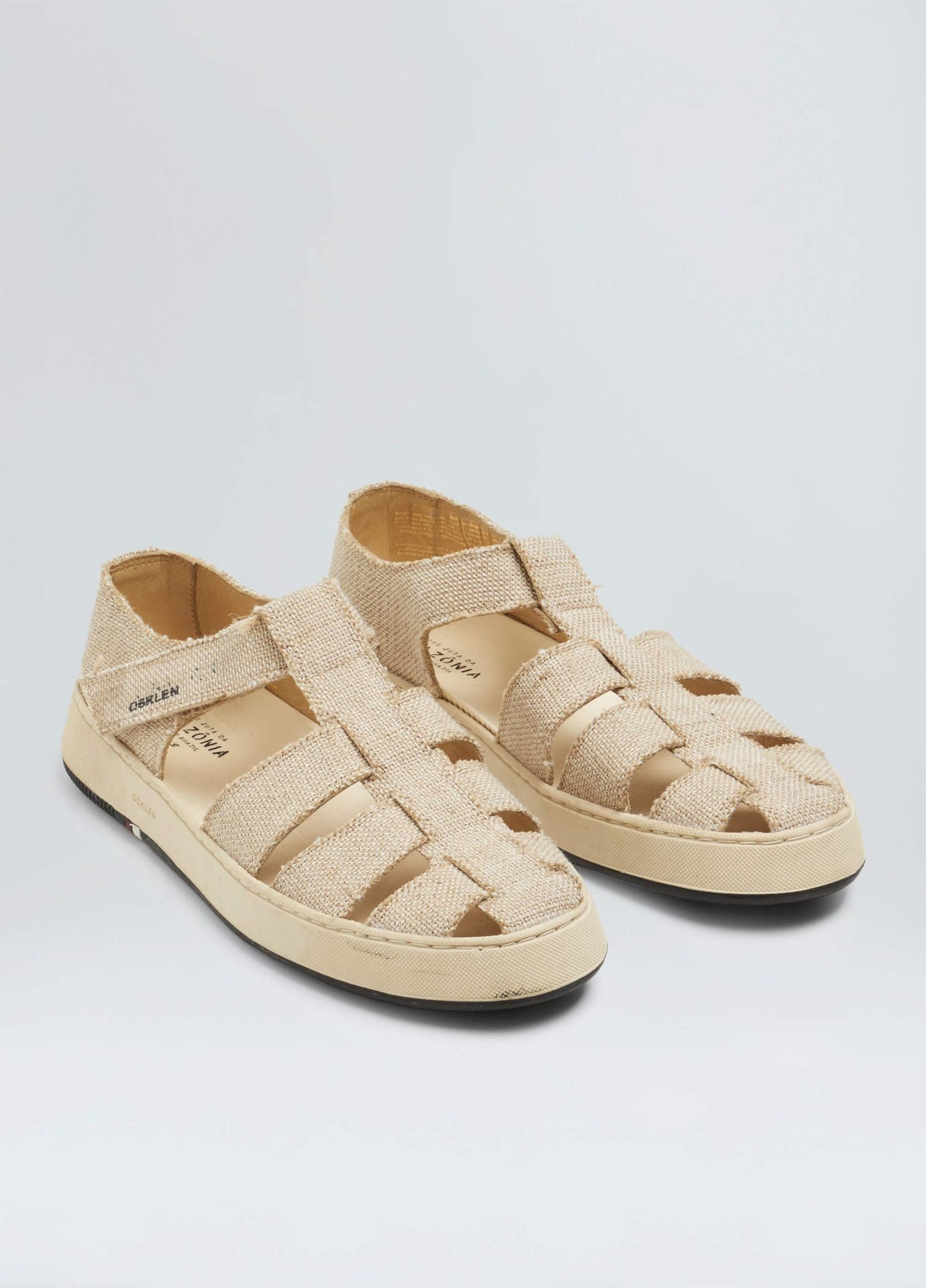 Sandália Soho em Juta da Amazônia. Modelo de fechamento por velcro. Produto Respect our People. A Juta da Amazônia é uma planta cultivada sem a utilização de agrotóxicos, herbicidas ou fungicidas e com adubação natural feita através do húmus deixado pelas cheias dos rios amazônicos. O plantio e a extração da juta gera renda para 15 mil famílias de agricultores e ribeirinhos. Forro em couro bovino e palmilha de EVA. Solado de borracha costurado ao cabedal com design exclusivo Osklen, produzido com no mínimo 10% de material reciclado. Produto Re-Design Waste.