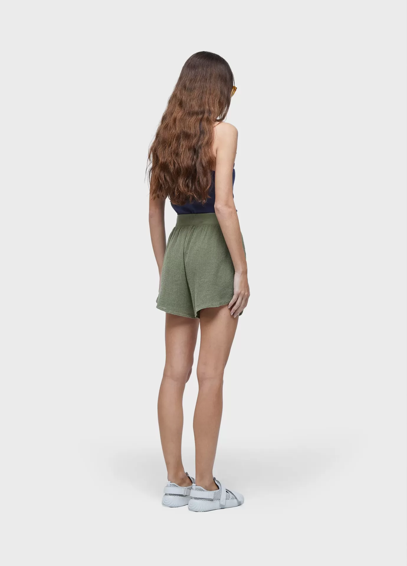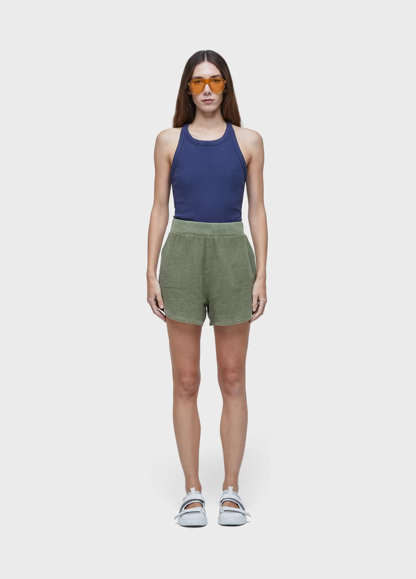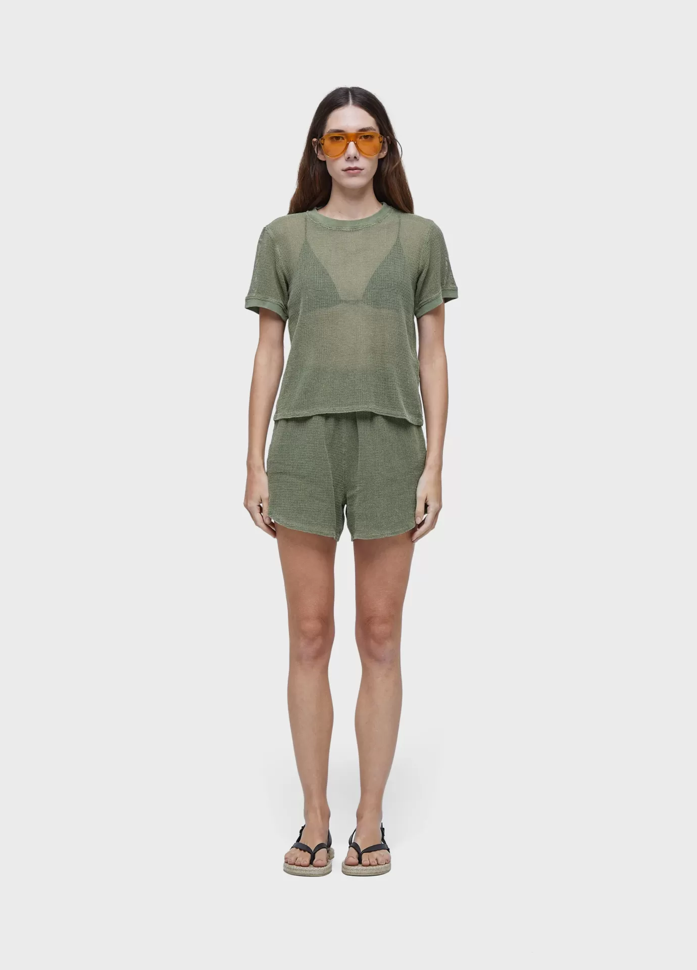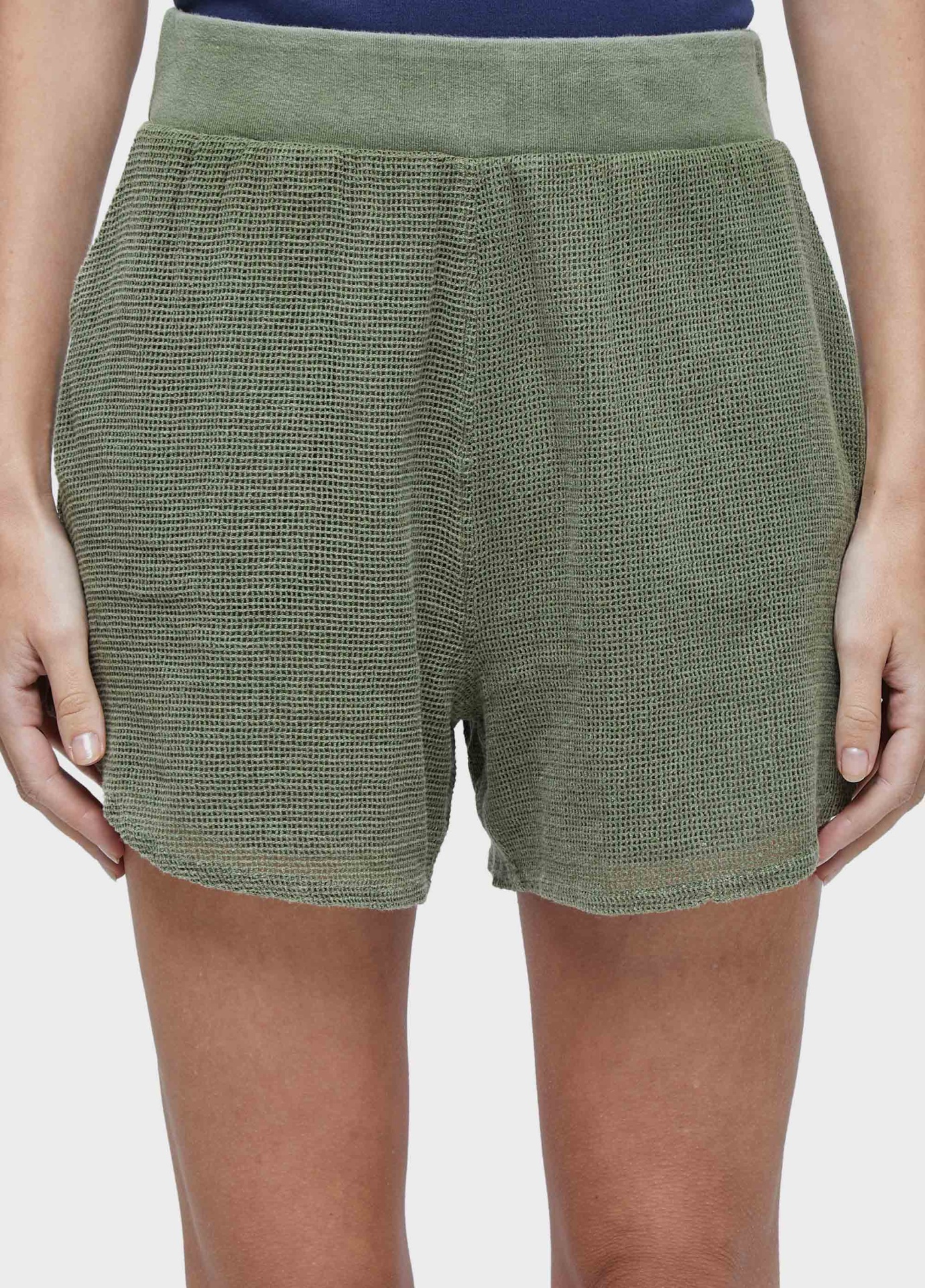 Short feito em meia malha e tela ed algodão. cintura alta e cós de elástico e bolsos faca. modelagem tipo running com caimento soltinho. peça eco dye + andiroba oil.