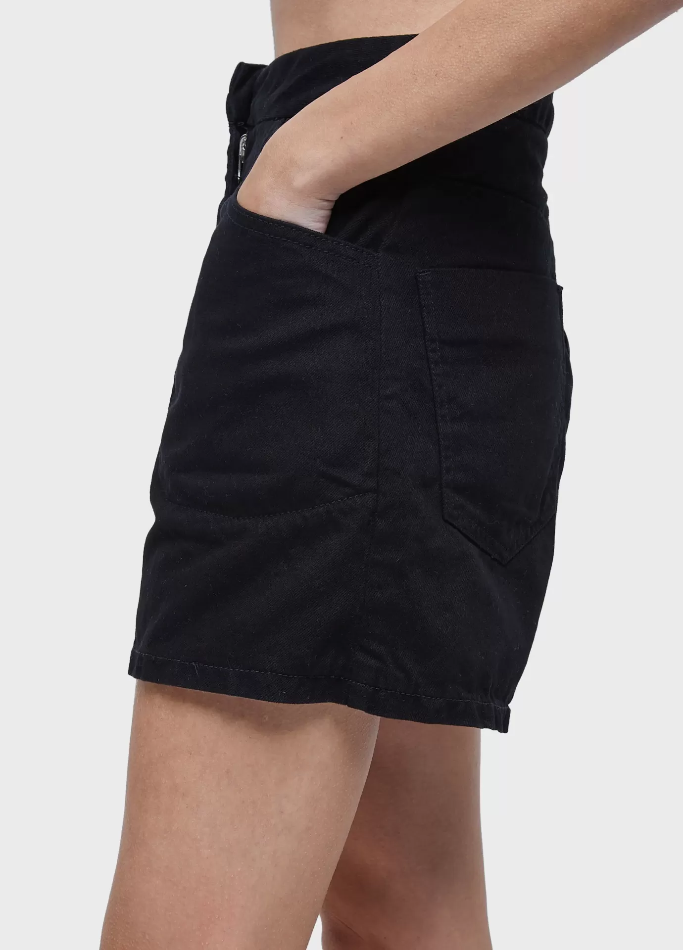 Short jeans regular fit com cintura alta e barra reta. essa peça é double face, pode
