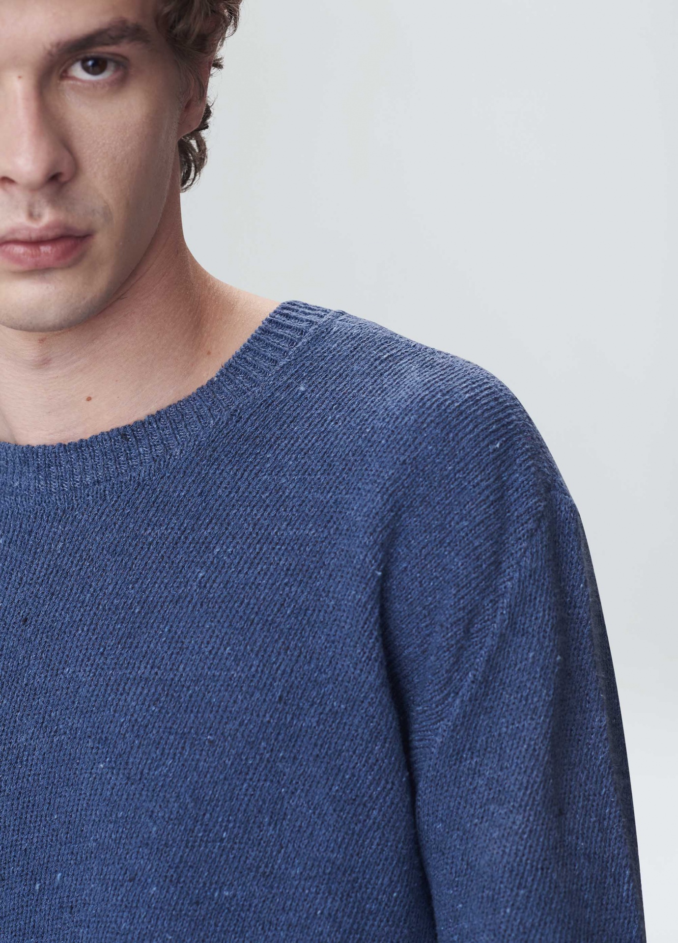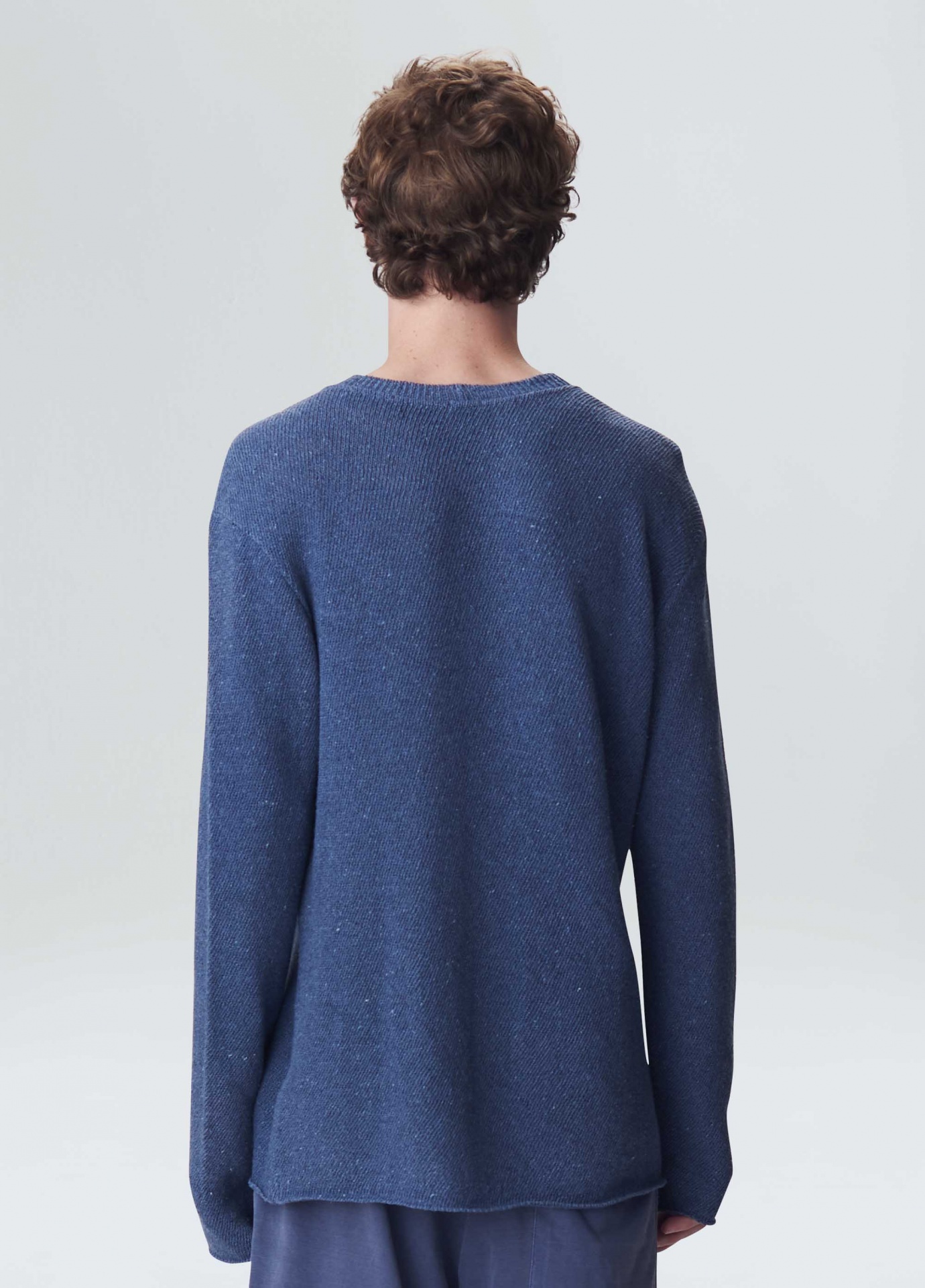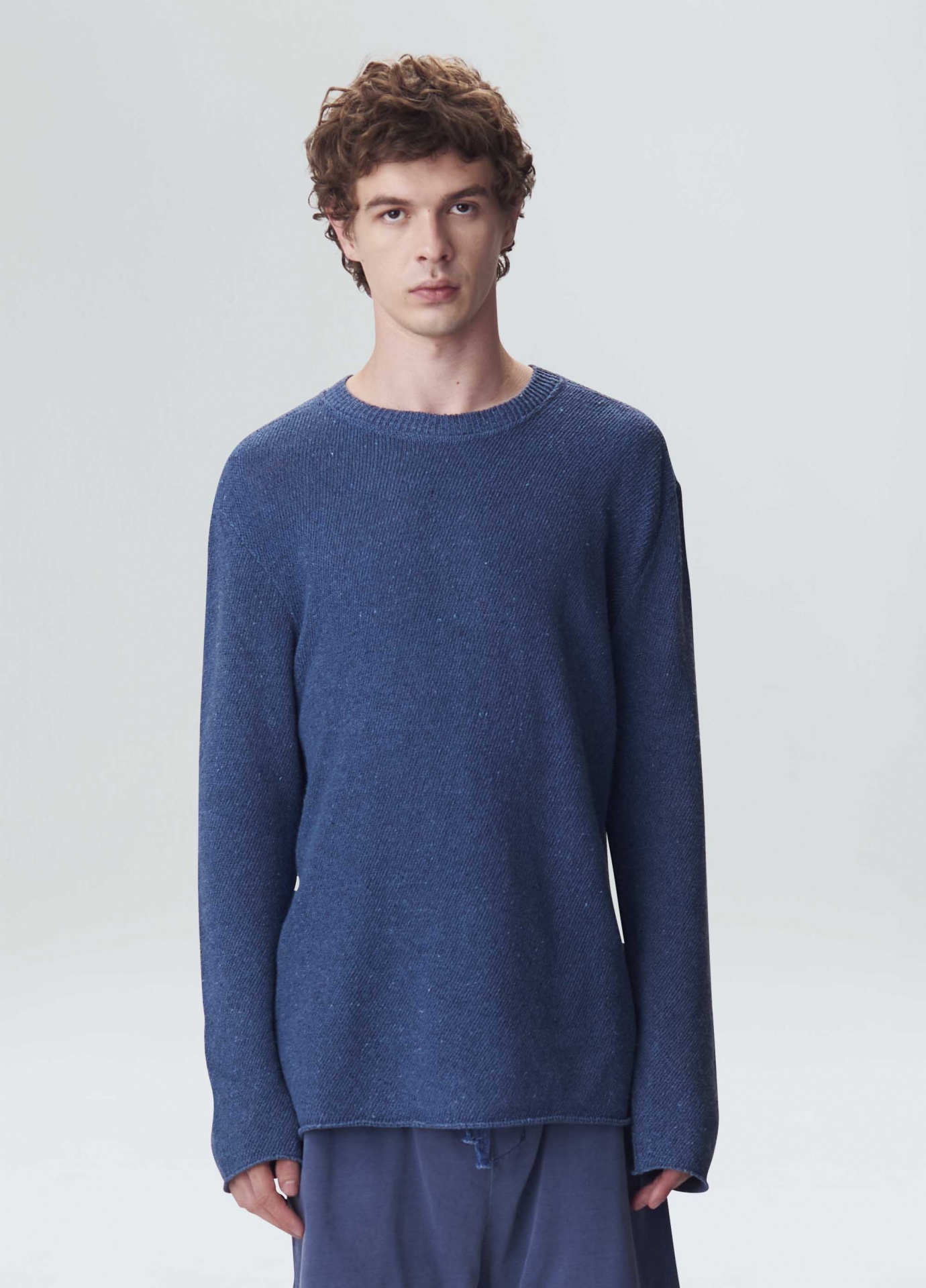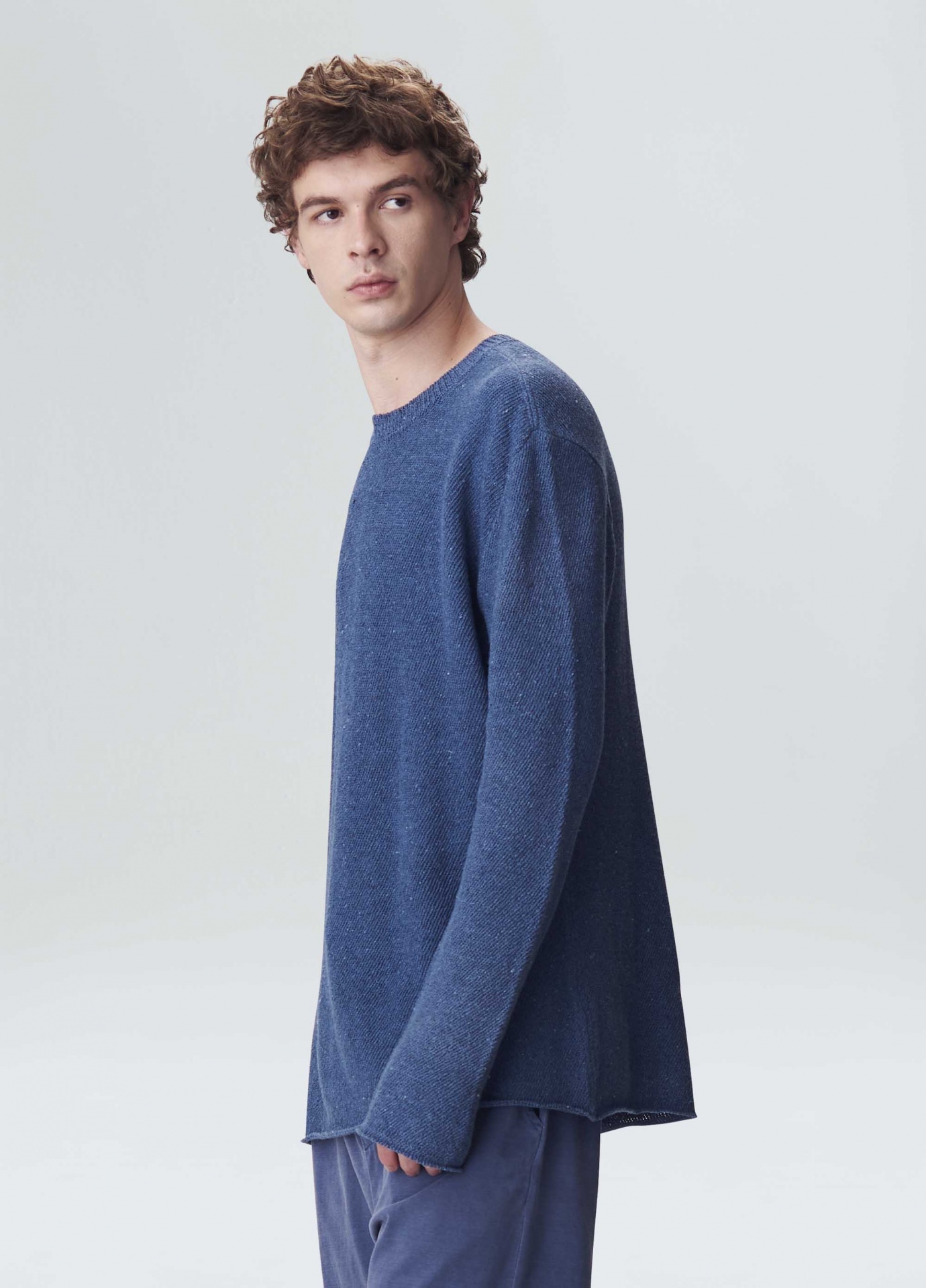Modelagem over; tricot de fio e-fabrics com algodão reciclado, evitando o descarte de resíduos no meio ambiente; peça lavada e amaciada; os fios podem ter variação de tonalidade que torna cada peça única;
