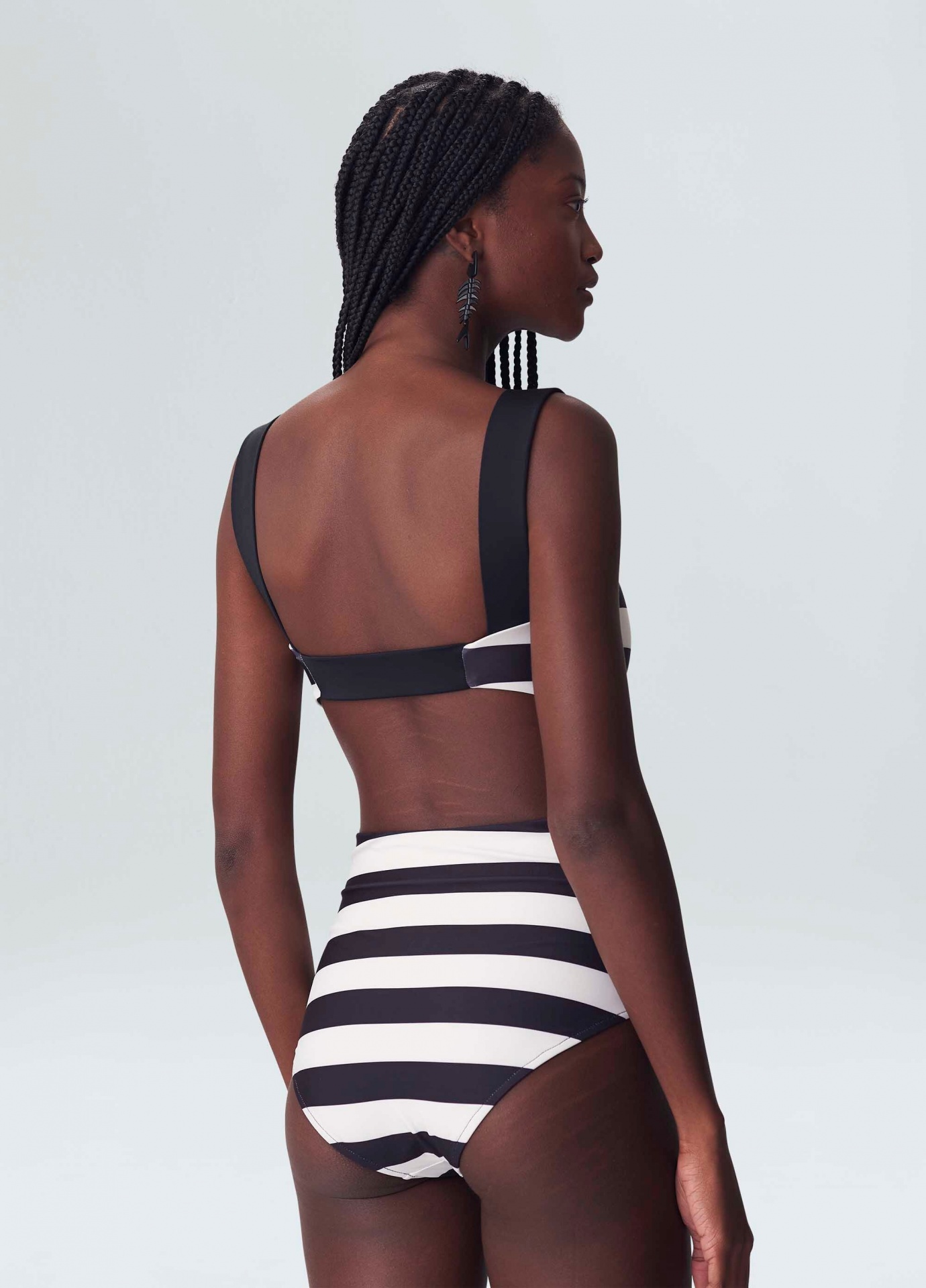 Maio frente única com decote nas costas. Estampa listrada. Feito em malha de poliester reciclado. Banderia Re-design Waste. Essa peça é uma exclusividade da nossa linha praia. Sua composição foi desenvolvida com mais de 80% de materiais reciclados em uma combinação de PET e resíduos da indústria têxtil. Uma iniciativa que promove impacto ambiental positivo através da economia circular e recebe a certificação do Global Recycled Standard (GRS).