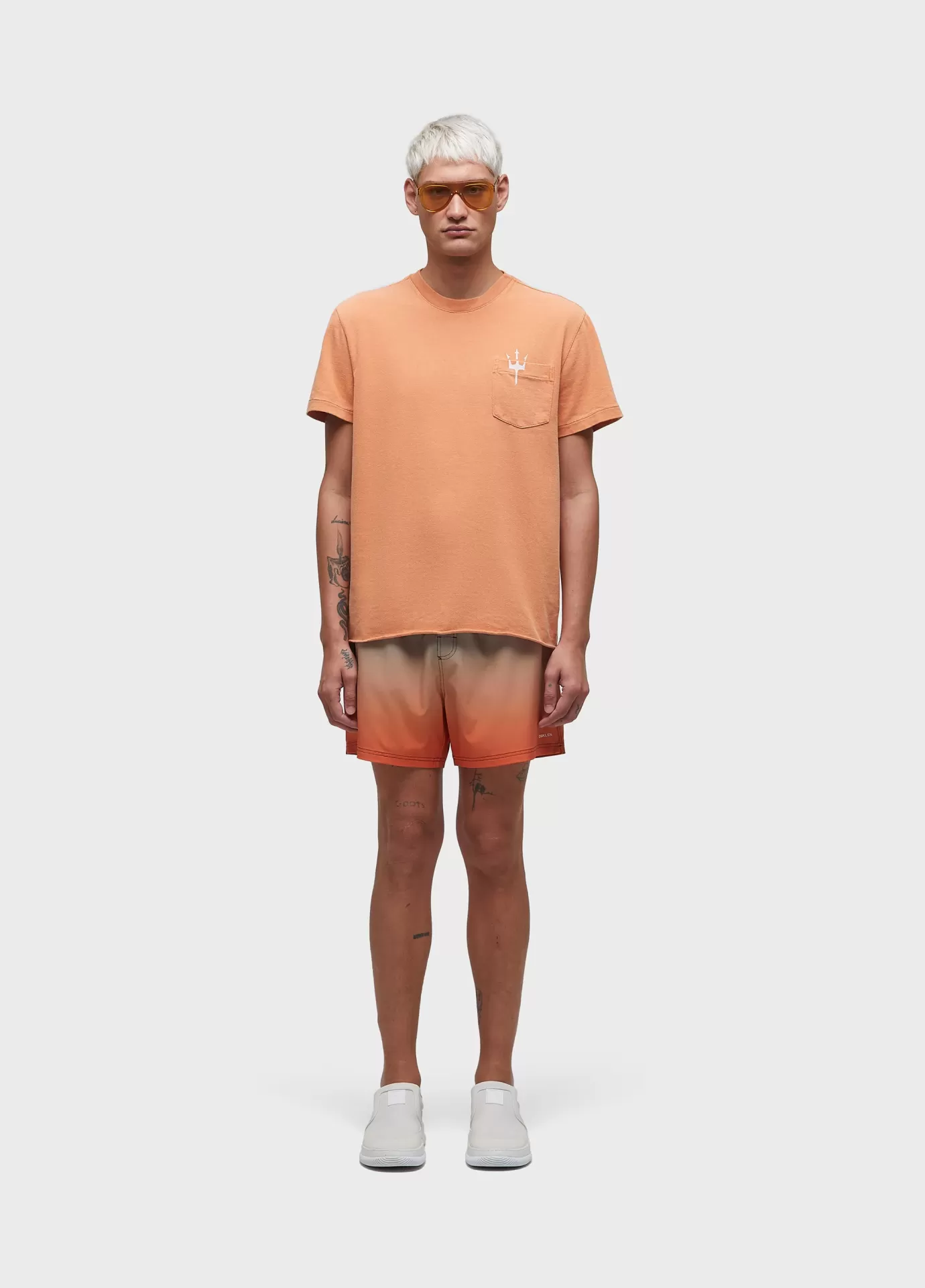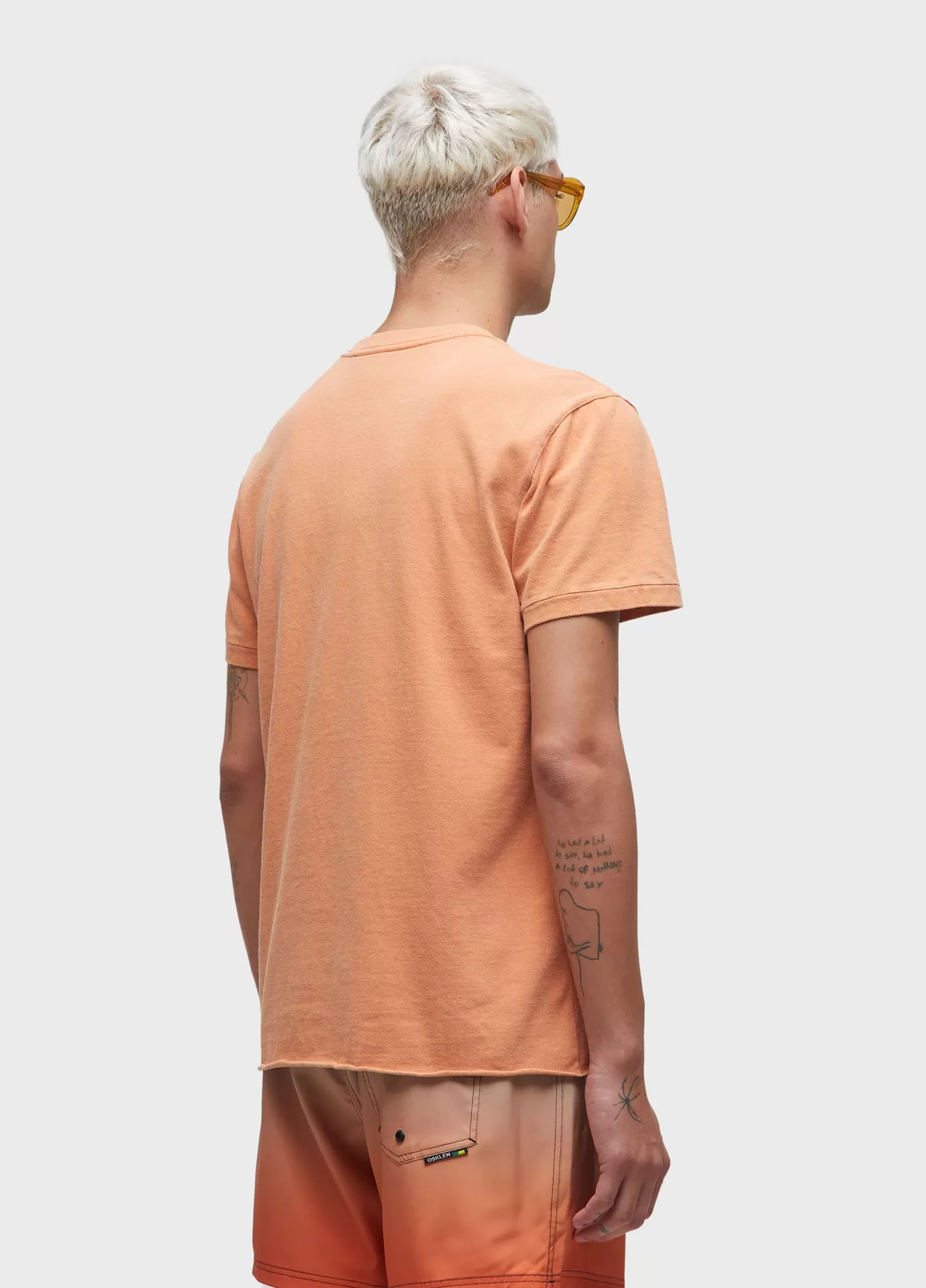 T shirt double face masculina com base regular. 100% algodão certificado. peça tingida com a técnica eco dye, processo que reduz aproximadamente 50% o consumo de água e amaciante natural a base de óleo essencial de menta orgânica. bandeira re-design waste.