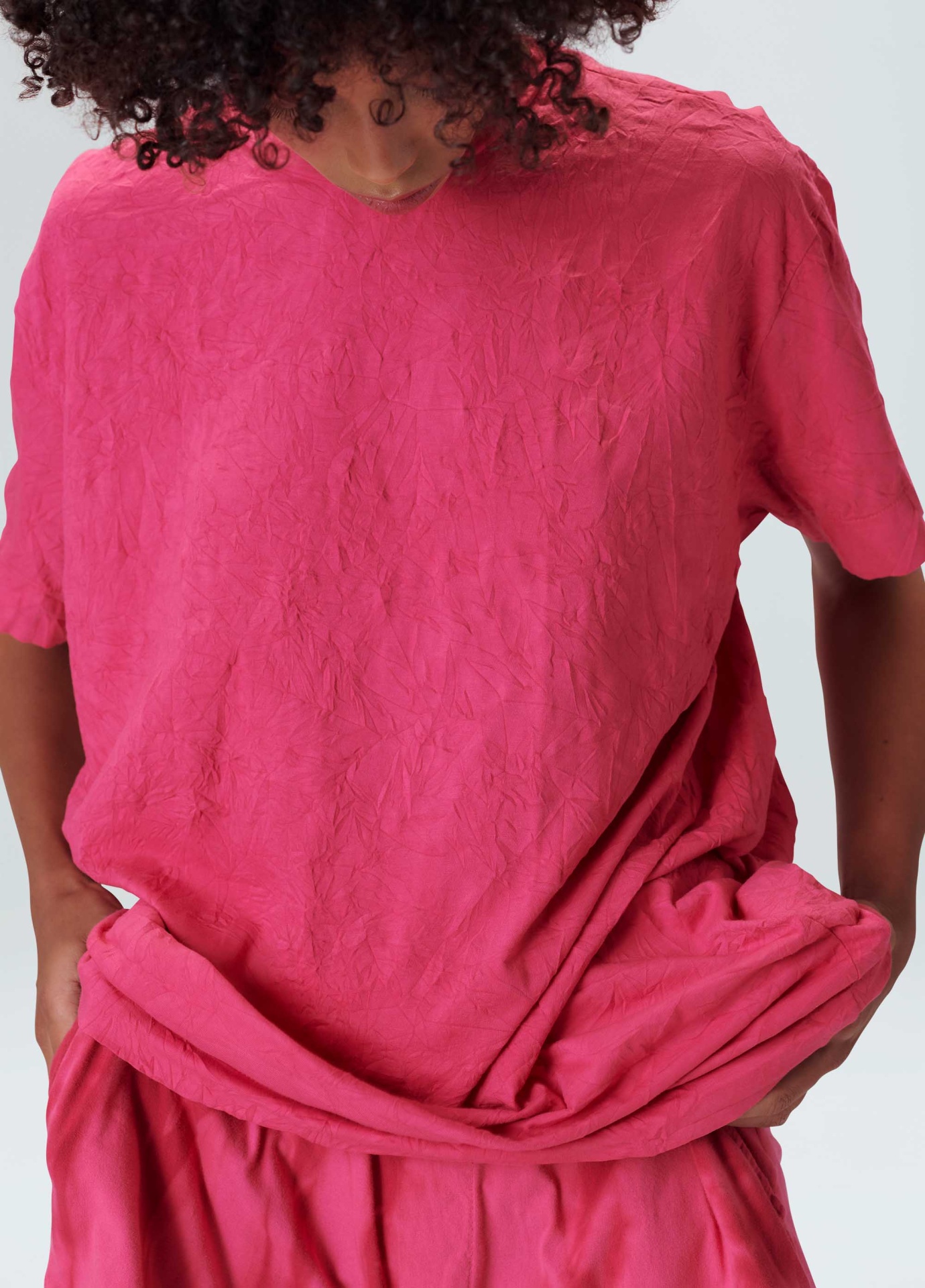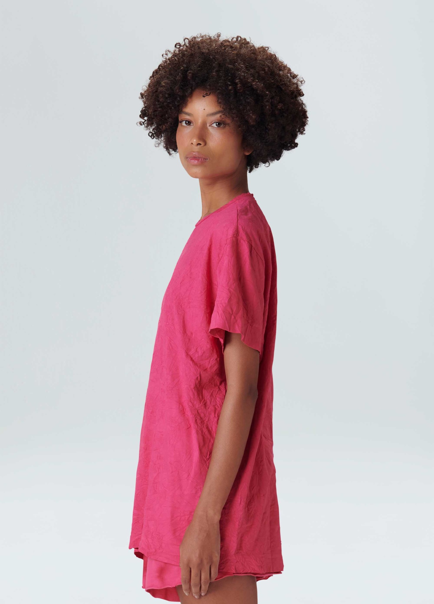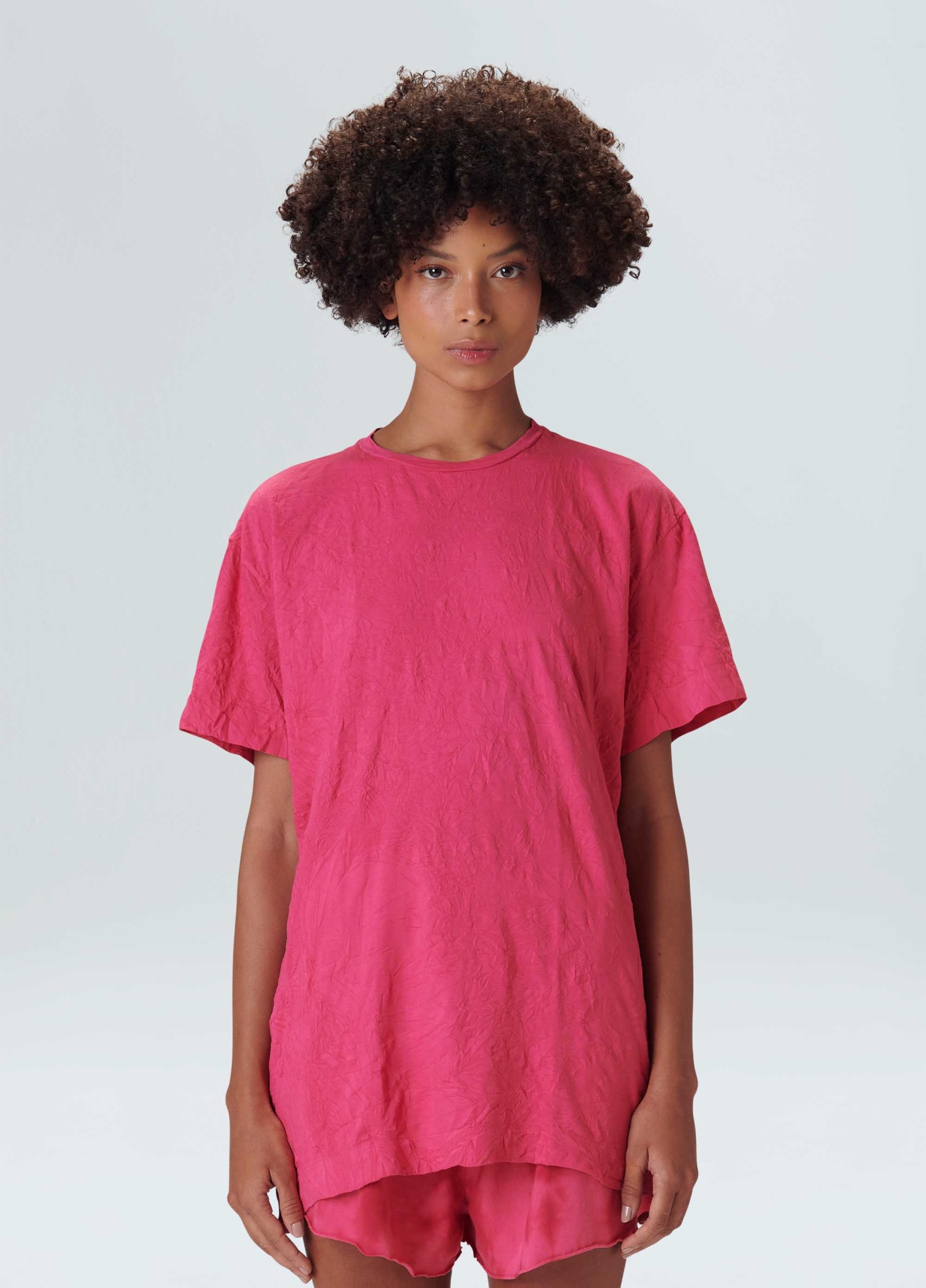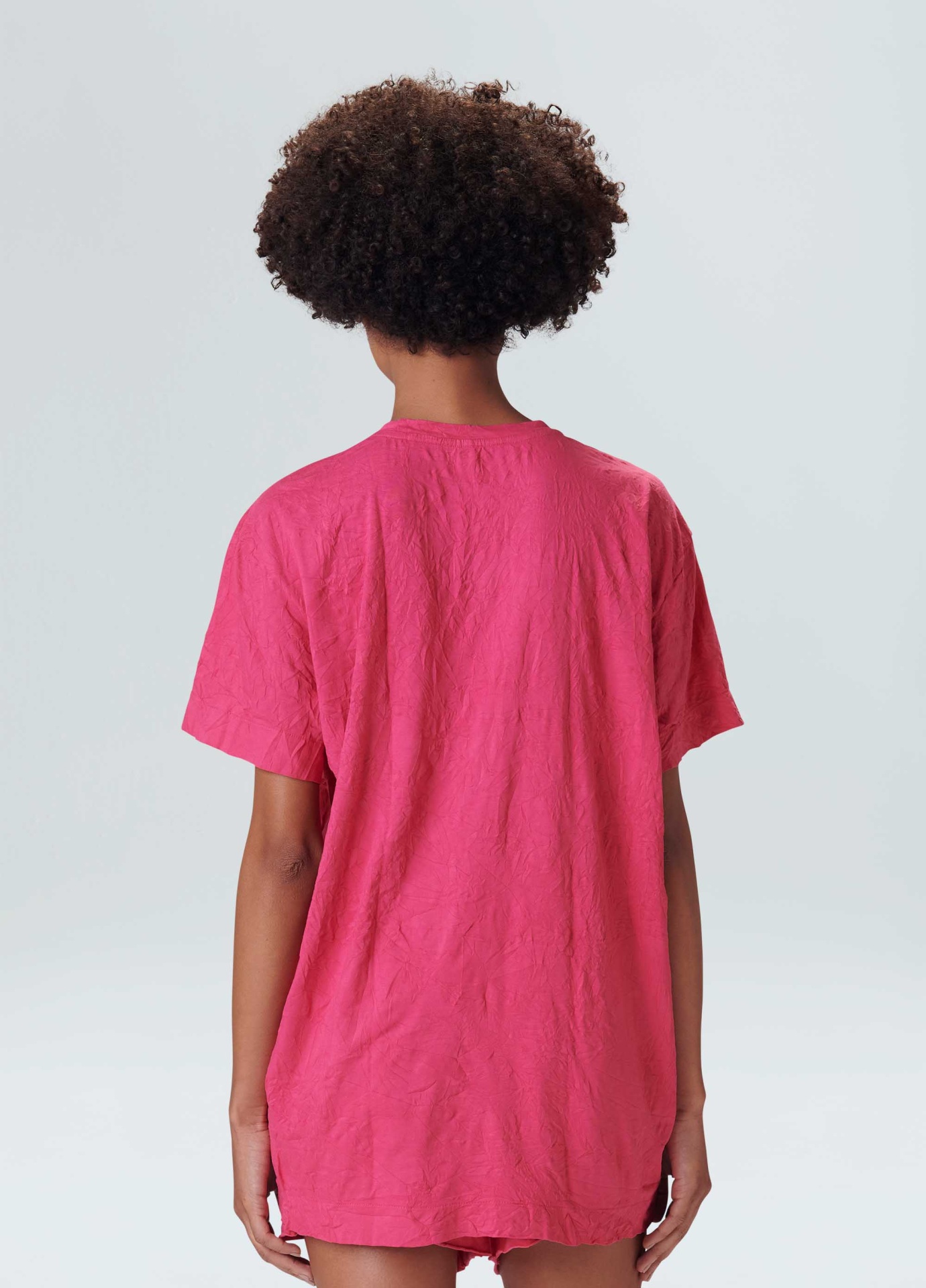 T-shirt feminina feita em malha de algodão. a peça tem modelagem oversized, com ombros deslocados, comprimento longo e caimento solto no corpo. a blusa é resinada amassada e vem em um saquinho de malha para guardar a peça enrolada em formato de nó, mantendo sua característica amassada. não passar a peça. essa é uma peça regenerate life, pois foi produzida com algodão nacional certificado seguindo critérios minuciosos de redução dos impactos ambientais e sociais durante seu cultivo. seu processo produtivo utiliza energia renovável, reduz o consumo de água e fomenta as cadeias produtivas brasileiras.