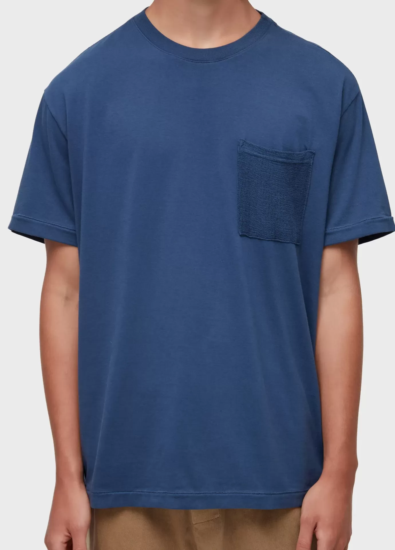 T-shirt masculina na base de modelagem Over, produzida em meia malha e tecido rústico