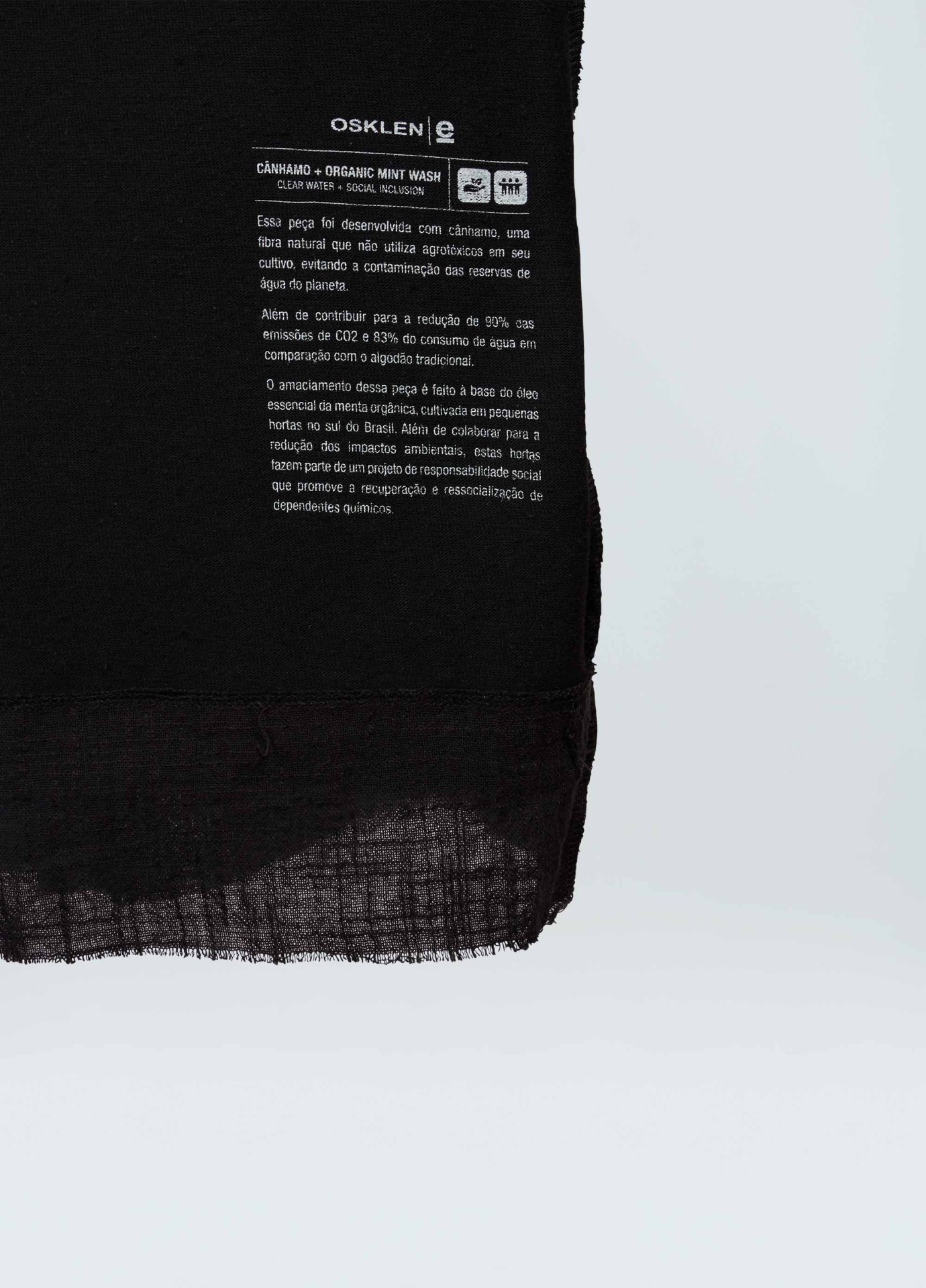 T-shirt masculina, E Frabric. Base de modelagem Over. Essa peça mistura malha e tecido plano, sendo parte da composição da malha desenvolvida com cânhamo, uma fibra natural que não utiliza agrotóxicos em seu cultivo, evitando a contaminação das reservas de água do planeta e também possui amaciamento Organic Mint Wash, um processo natural formulado à base do óleo essencial da menta orgânica, cultivada em pequenas hortas que fazem parte de um projeto social que promove a recuperação e ressocialização de dependentes químicos. Bandeira: Regenerate life.