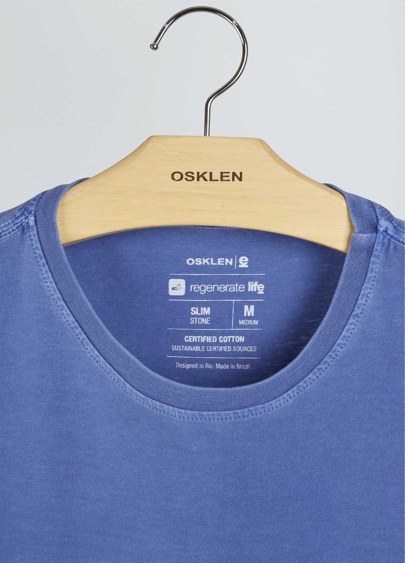 T Shirt masculina 1/2 malha 100% algodão certificado, base de modelagem Slim. Bandeira Regenerate Life. A produção do algodão nacional certificado contribui para redução dos impactos ambientais, utiliza energia renovável, reduz o consumo de água e fomenta o aprimoramento social e ambiental das cadeias produtivas brasileiras.