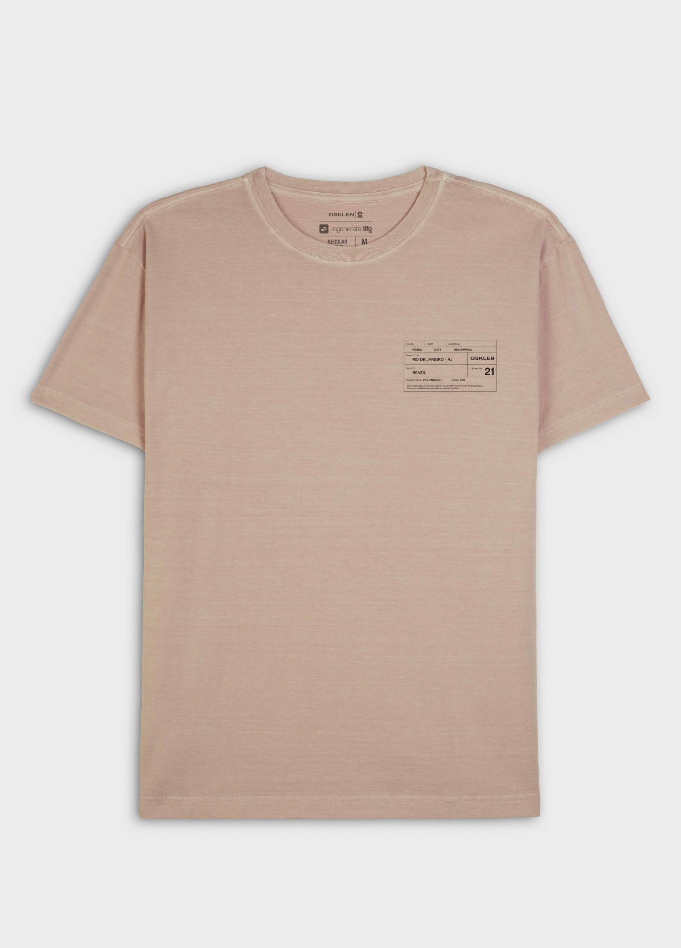 T-Shirt masculina 1/2 malha 100% algodão certificado, base de modelagem Regular, visual lavado, gastinha. A produção do algodão nacional certificado contribui para redução dos impactos ambientais, utiliza energia renovável, reduz o consumo de água e fomenta o aprimoramento social e ambiental das cadeias produtivas brasileiras. Bandeira Regenerate Life.