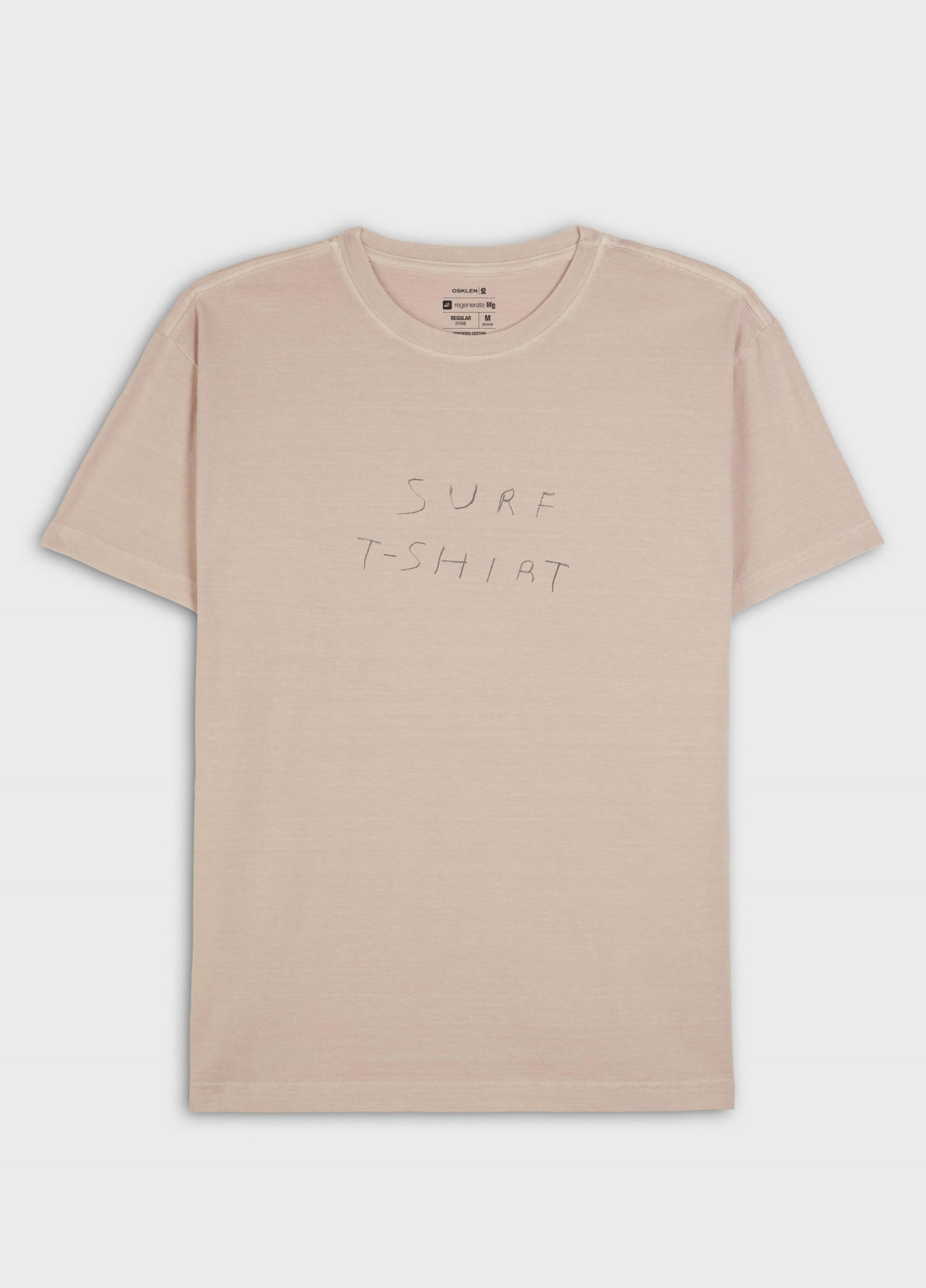 T-Shirt masculina 1/2 malha 100% algodão certificado, base de modelagem Regular, visual lavado, gastinha. A produção do algodão nacional certificado contribui para redução dos impactos ambientais, utiliza energia renovável, reduz o consumo de água e fomenta o aprimoramento social e ambiental das cadeias produtivas brasileiras. Bandeira Regenerate Life.