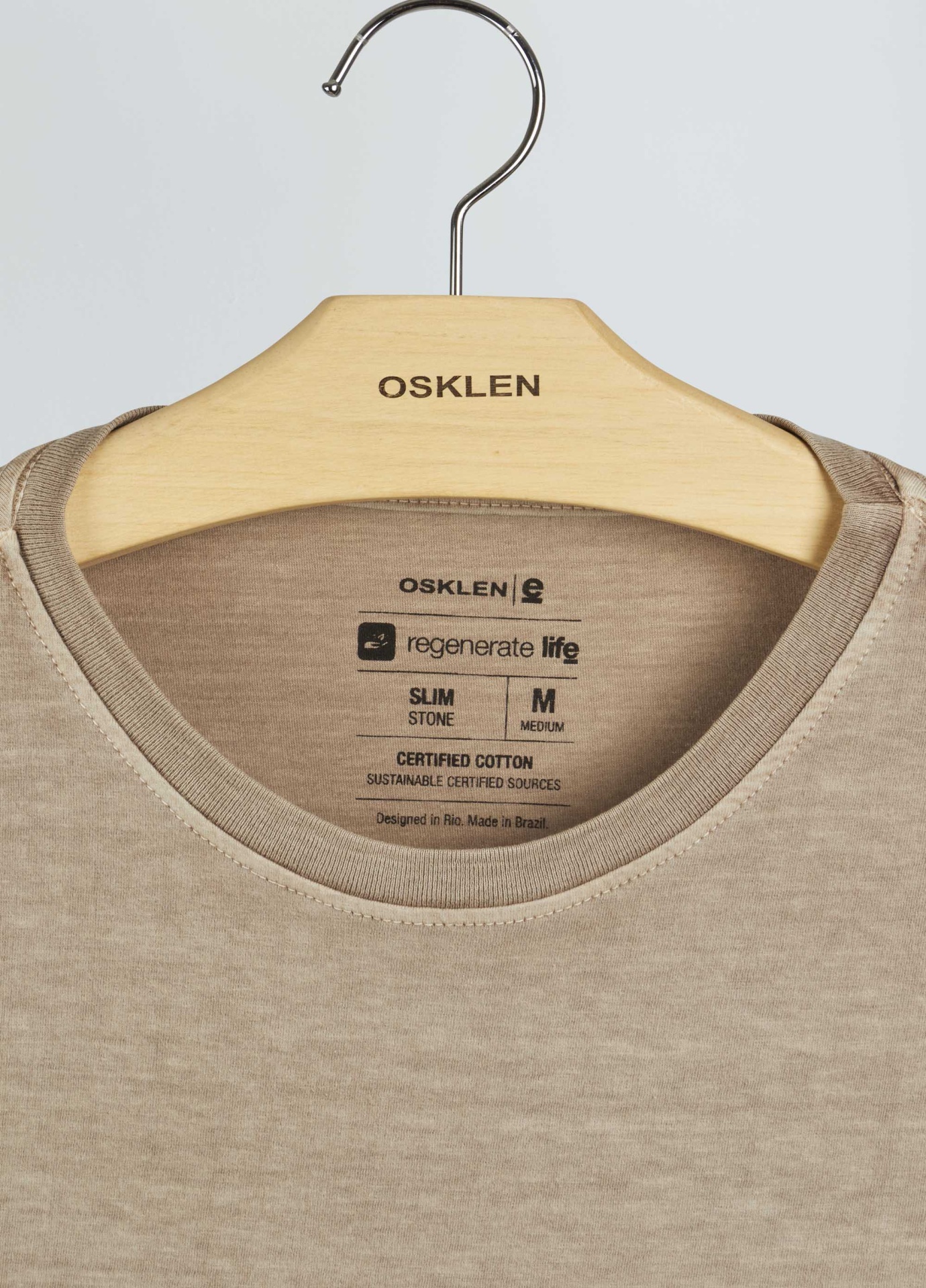 T Shirt masculina 1/2 malha 100% algodão certificado, base de modelagem Slim. Bandeira Regenerate Life. A produção do algodão nacional certificado contribui para redução dos impactos ambientais, utiliza energia renovável, reduz o consumo de água e fomenta o aprimoramento social e ambiental das cadeias produtivas brasileiras.