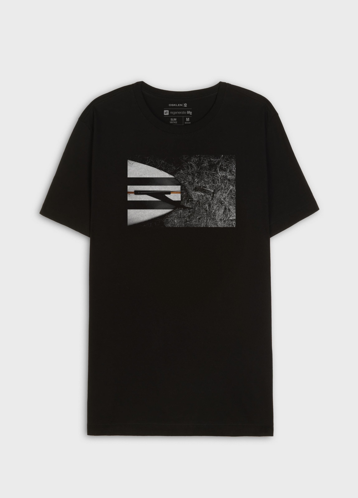 T-Shirt masculina 1/2 malha 100% algodão certificado, base de modelagem Slim, com visual gastinho, feito manualmente, peça a peça. A produção do algodão nacional certificado contribui para redução dos impactos ambientais, utiliza energia renovável, reduz o consumo de água e fomenta o aprimoramento social e ambiental das cadeias produtivas brasileiras. Bandeira Regenerate Life.