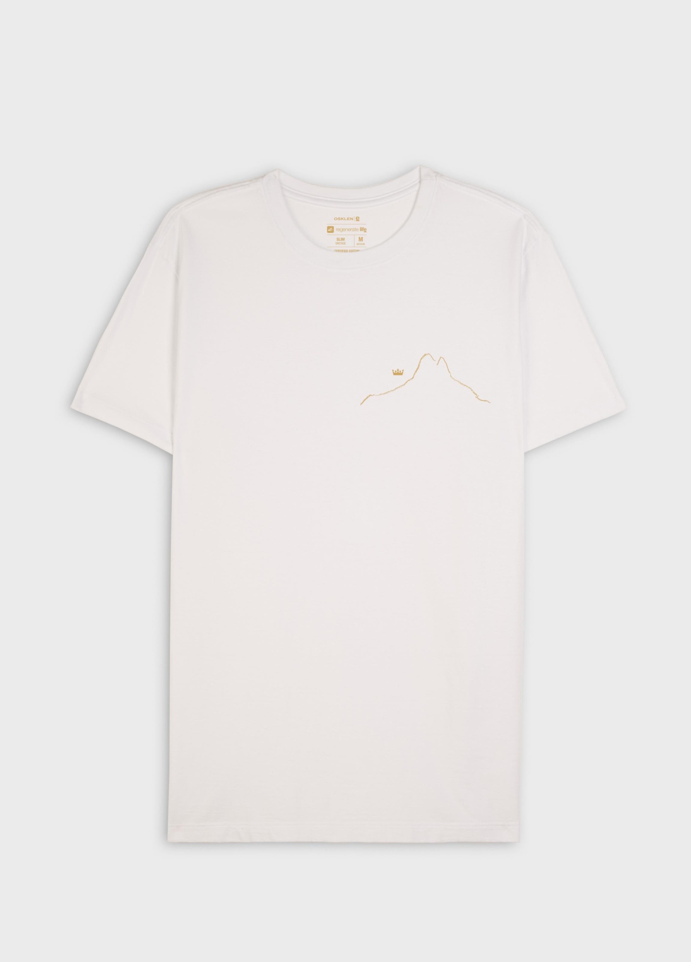T-Shirt masculina 1/2 malha 100% algodão certificado, base de modelagem Slim, com visual gastinho, feito manualmente, peça a peça. A produção do algodão nacional certificado contribui para redução dos impactos ambientais, utiliza energia renovável, reduz o consumo de água e fomenta o aprimoramento social e ambiental das cadeias produtivas brasileiras. Bandeira Regenerate Life.