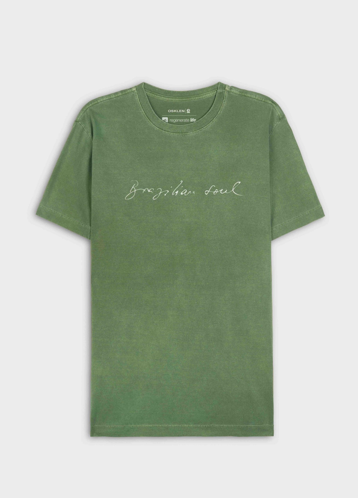 T-Shirt masculina 1/2 malha 100% algodão certificado, base de modelagem Slim, visual lavado, gastinha. A produção do algodão nacional certificado contribui para redução dos impactos ambientais, utiliza energia renovável, reduz o consumo de água e fomenta o aprimoramento social e ambiental das cadeias produtivas brasileiras. Bandeira Regenerate Life.