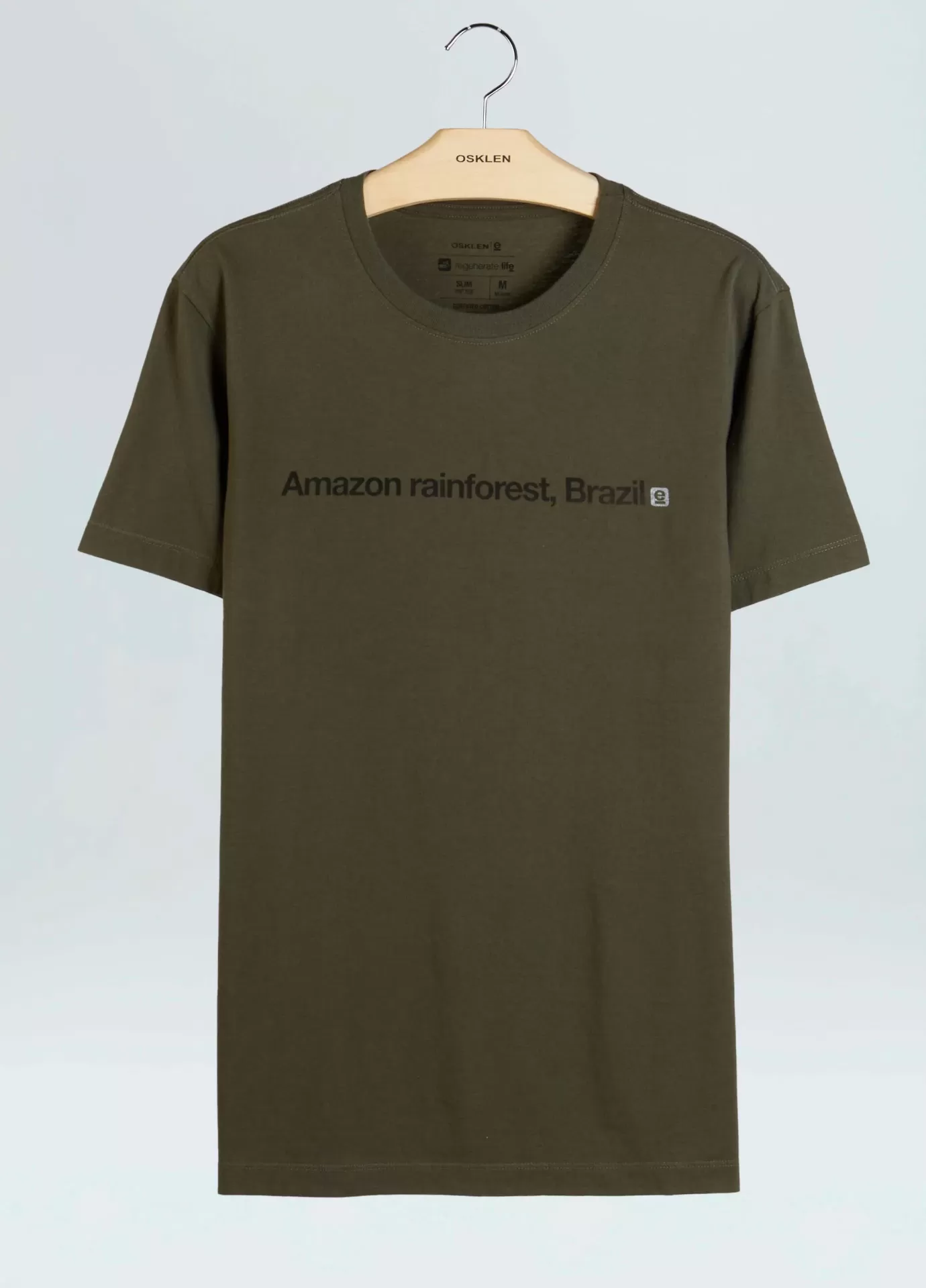T-shirt verde oliva com texto Amazon rainforest, Brazil pendurada num cabide de madeira