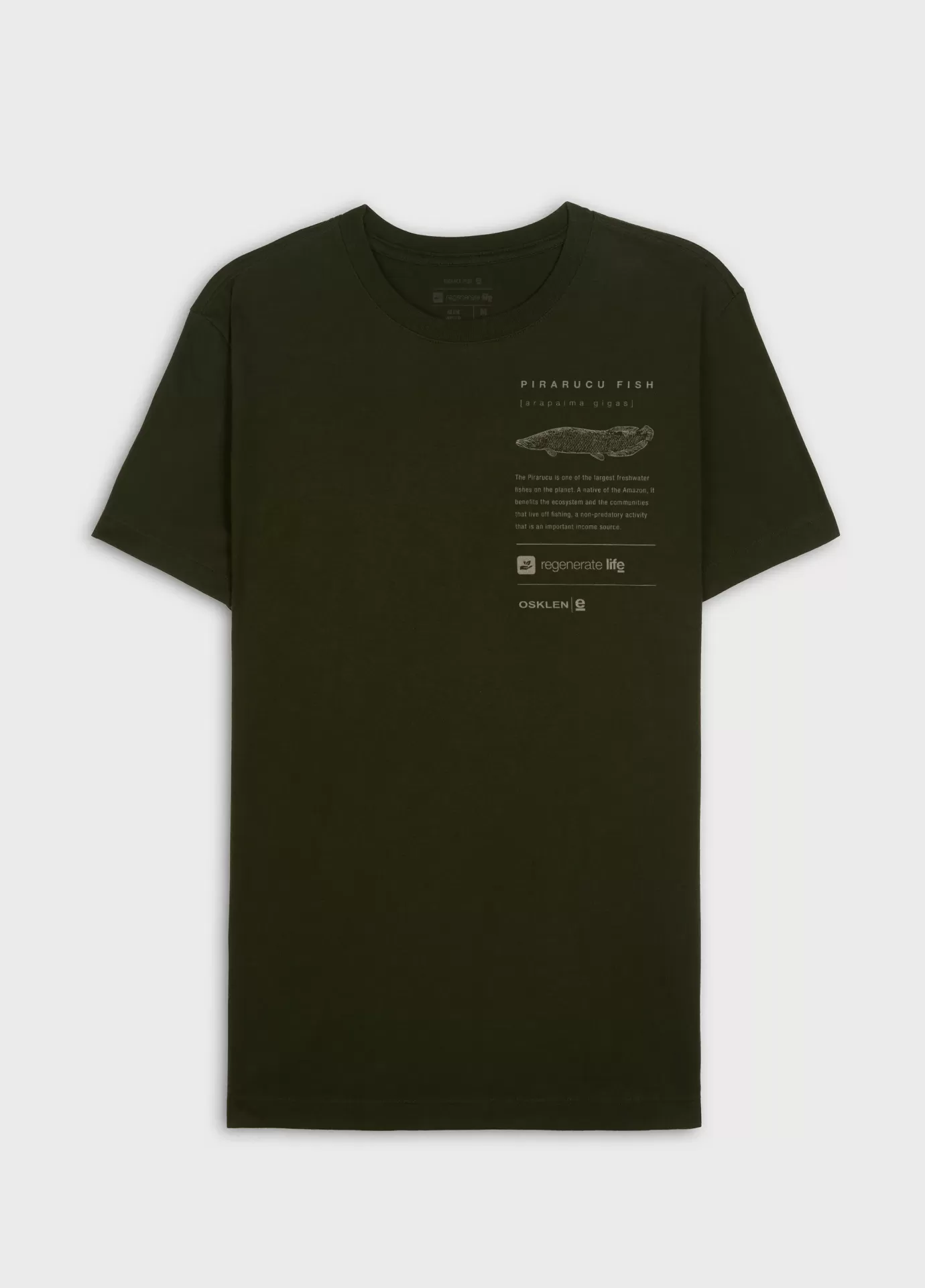 T-shirt verde escuro com estampa de texto e desenho do peixe pirarucu no peito.