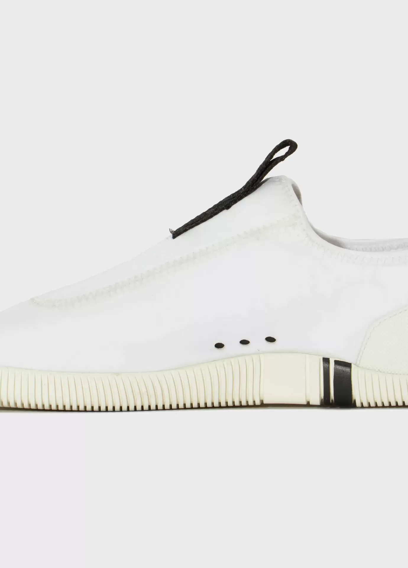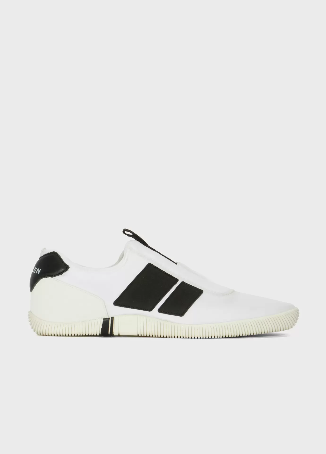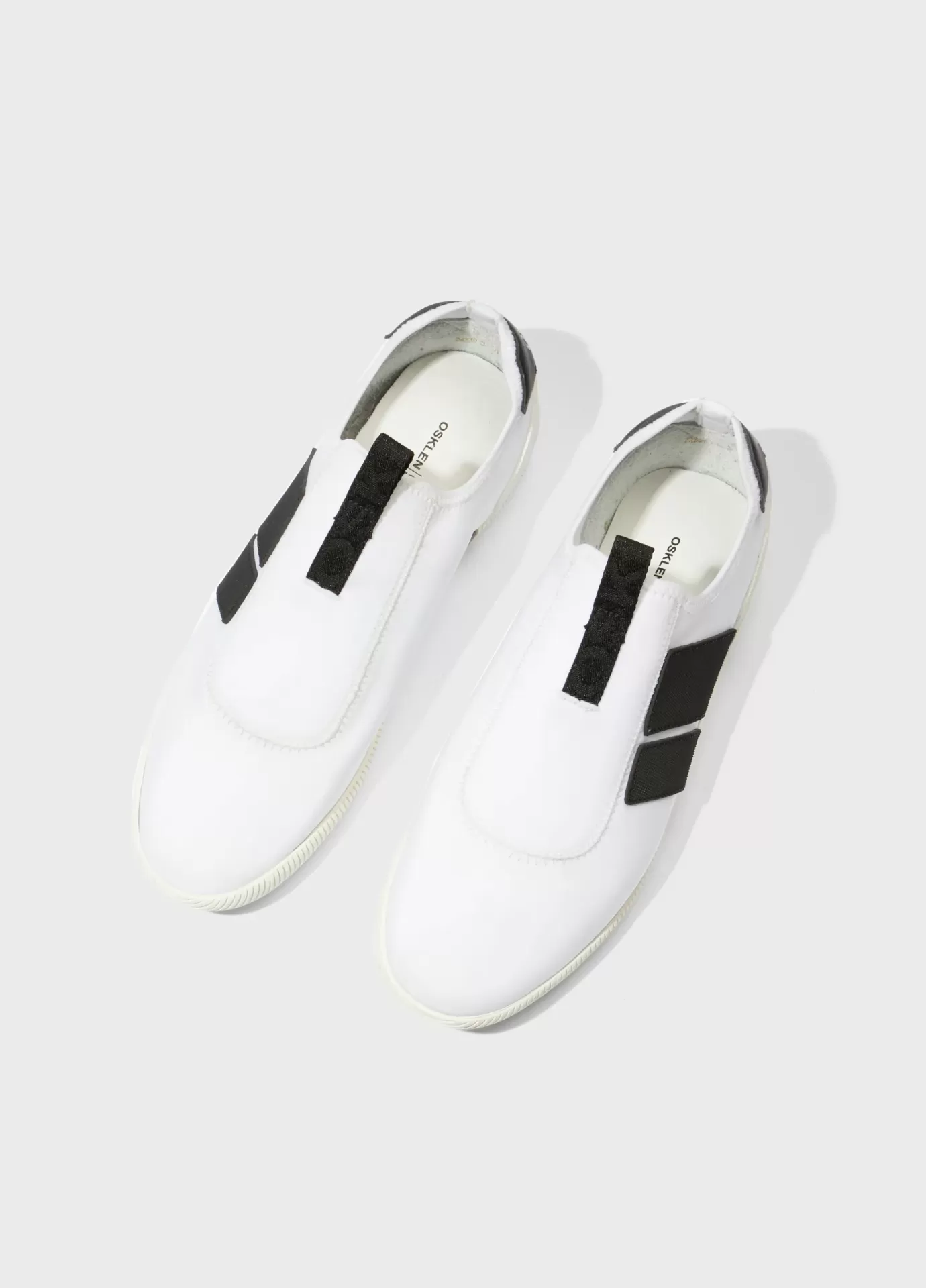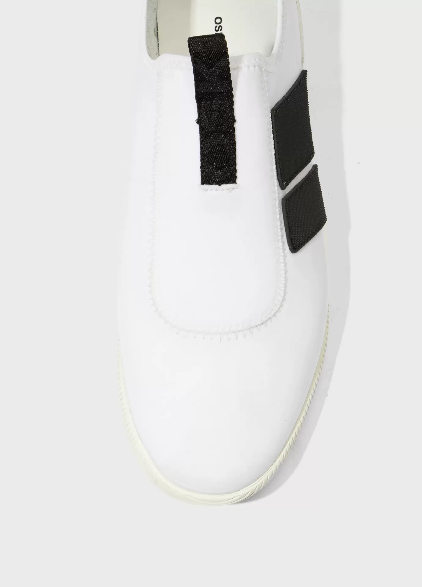 Tênis Arpoador em material elástico. Modelo slip on. Pamilha em couro bovino. Solado de borracha costurado ao cabedal com design exclusivo Osklen, produzido com no mínimo 10% de material reciclado. Produto Re-Design Waste.
