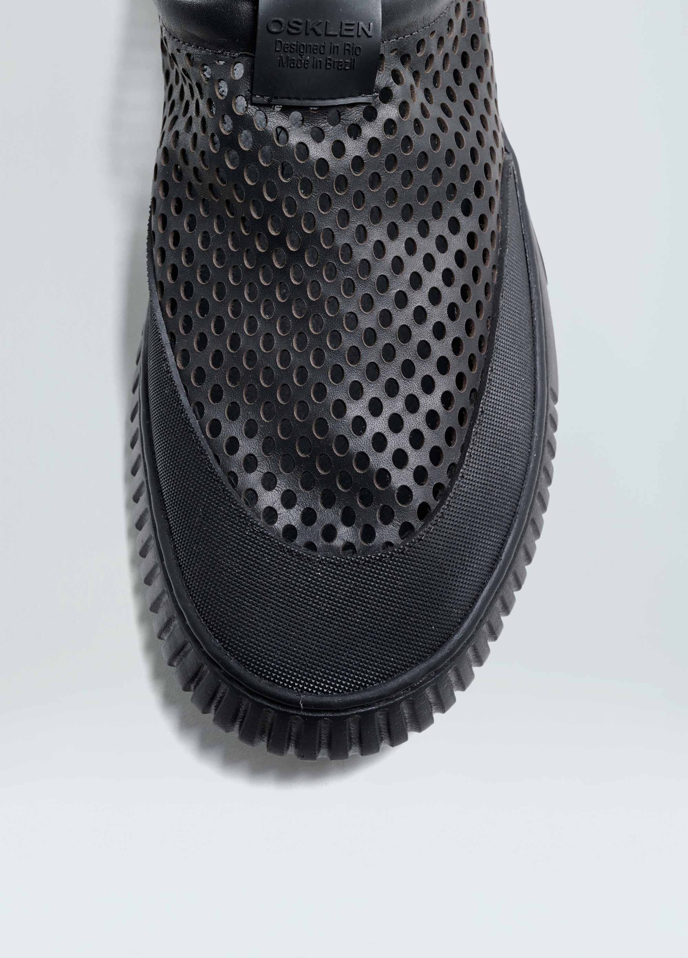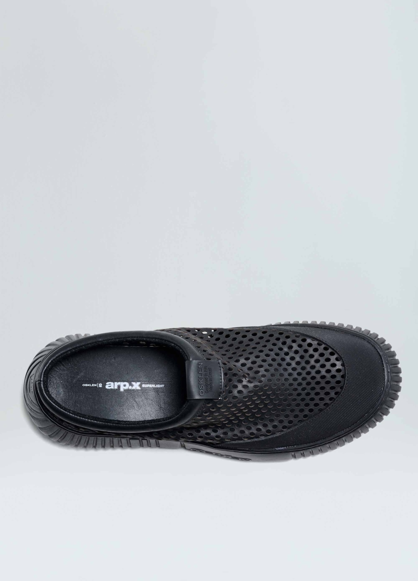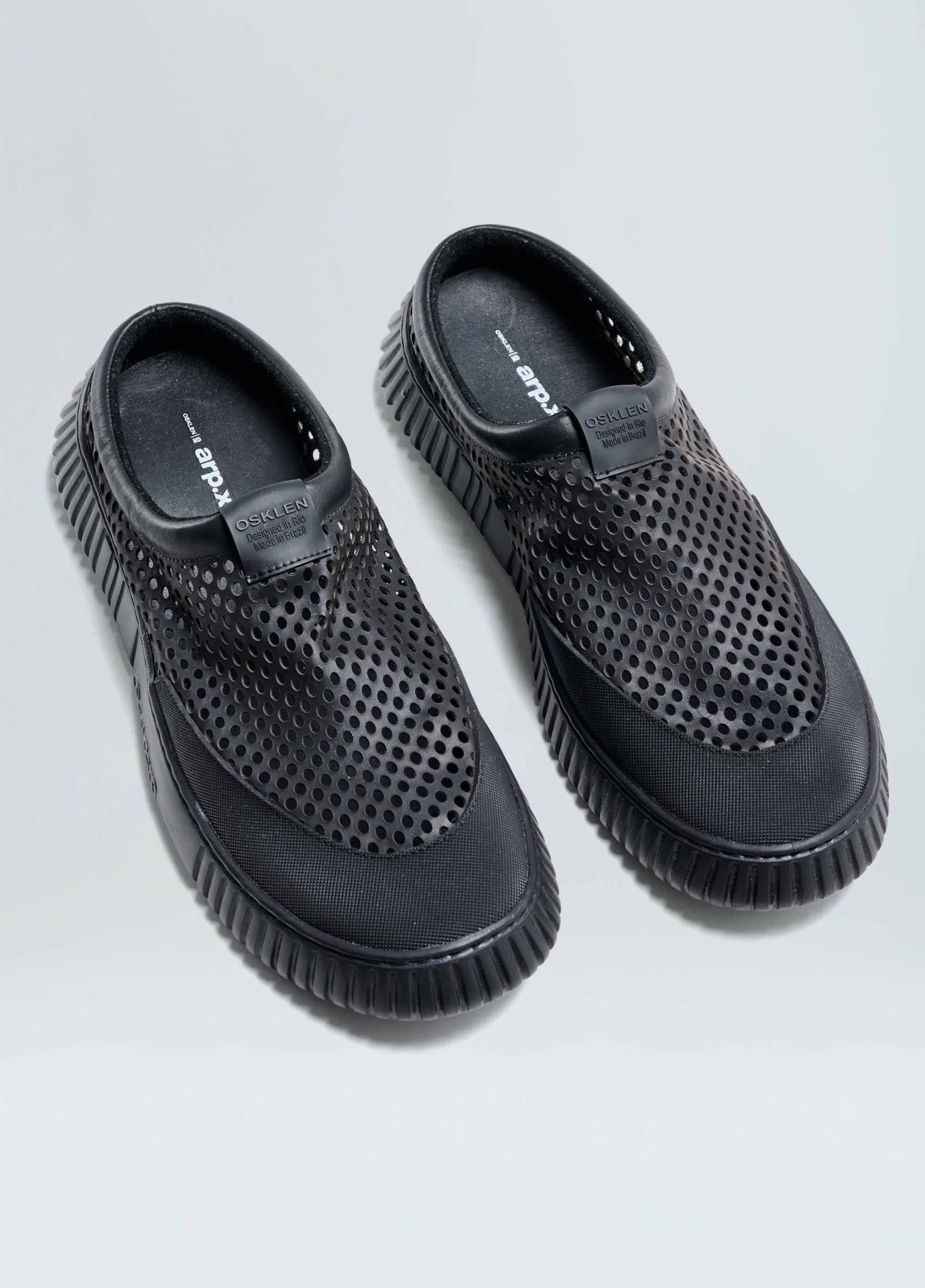 Tênis Arp(X) em couro bovino com microfuros feitos a laser. Recorte de borracha texturizada com recicle em sua composição no bico. Assinatura em etiqueta de borracha personalizada Osklen. Modelo mule slip-on com elástico para facilitar o calce. Forro parcial e palmilha em couro bovino. Solado de EVA costurado ao cabedal com design exclusivo Osklen, produzido com mais de 70% de carbono de base biológica, oriundo da cana de açúcar plantada e cultivada no Brasil. Produto Regenerate Life e Re-Design Waste.