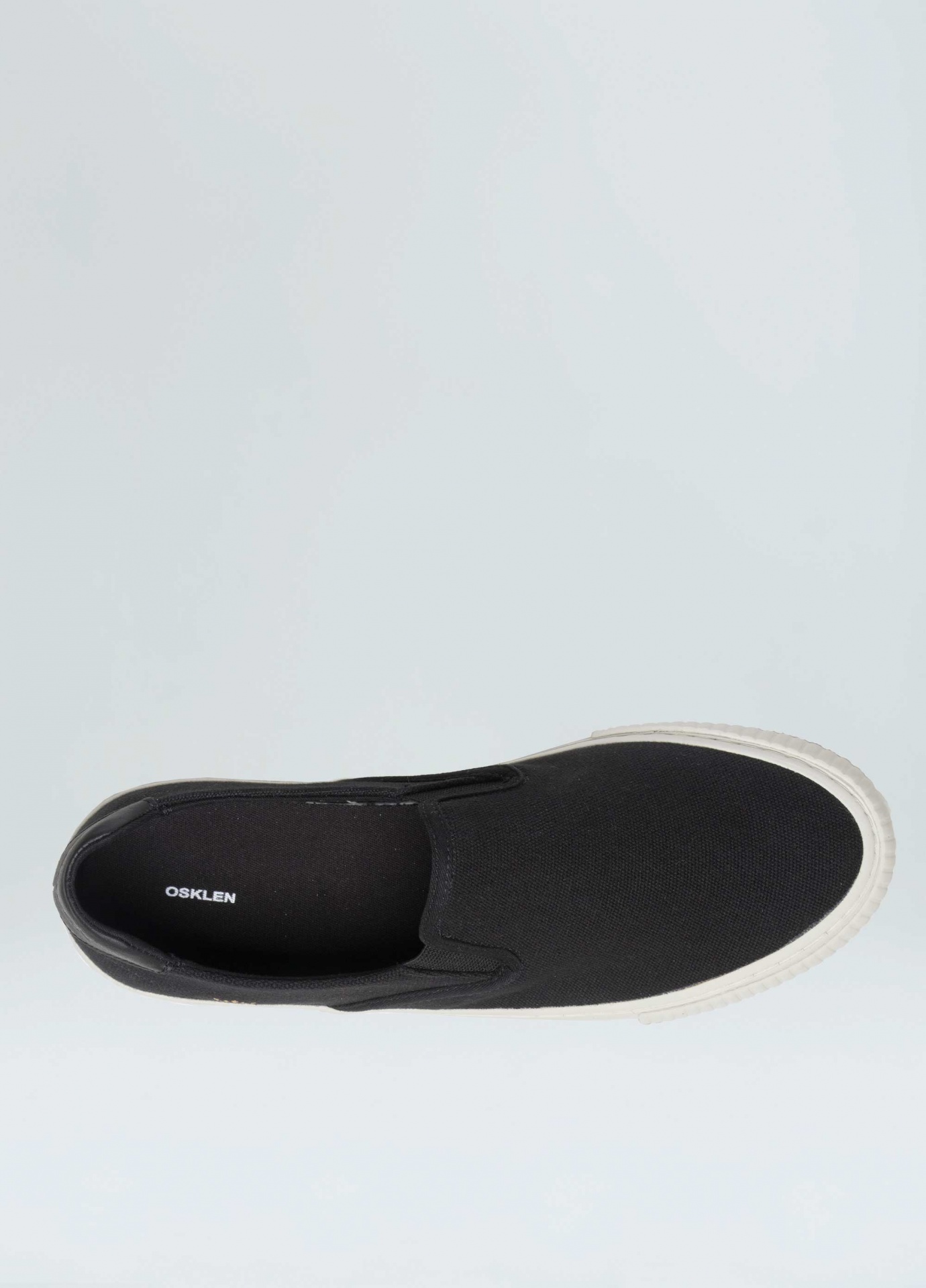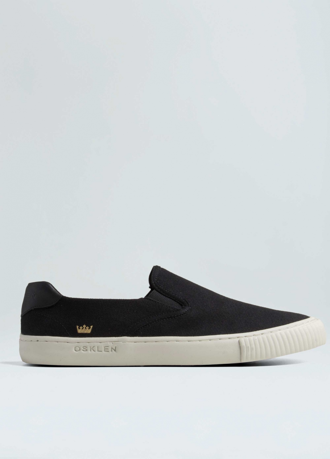 Tênis vulcanizado em lona 100% algodão com detalhe traseiro em couro bovino. Modelo slip on com elásticos para facilitar o calce. Forro e palmilha em sarja 100% algodão. Solado de borracha costurado ao cabedal com fundo inspirado no calçadão de ipanema, design exclusivo osklen. Produto re-design waste. A partir do inverno 21 o solado passou a ser produzido com no mínimo 10% de material reciclado.
