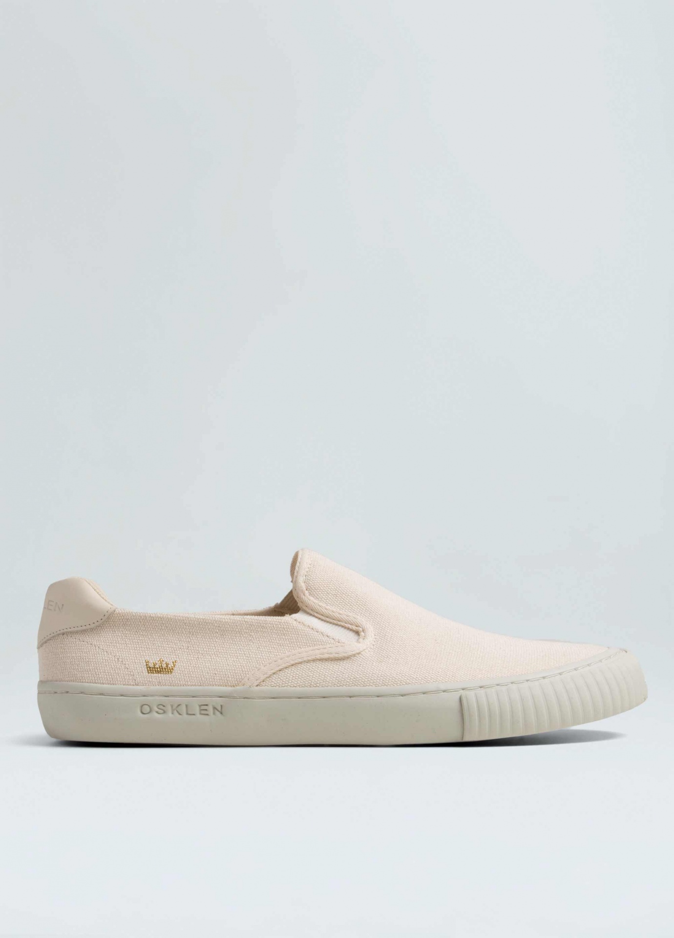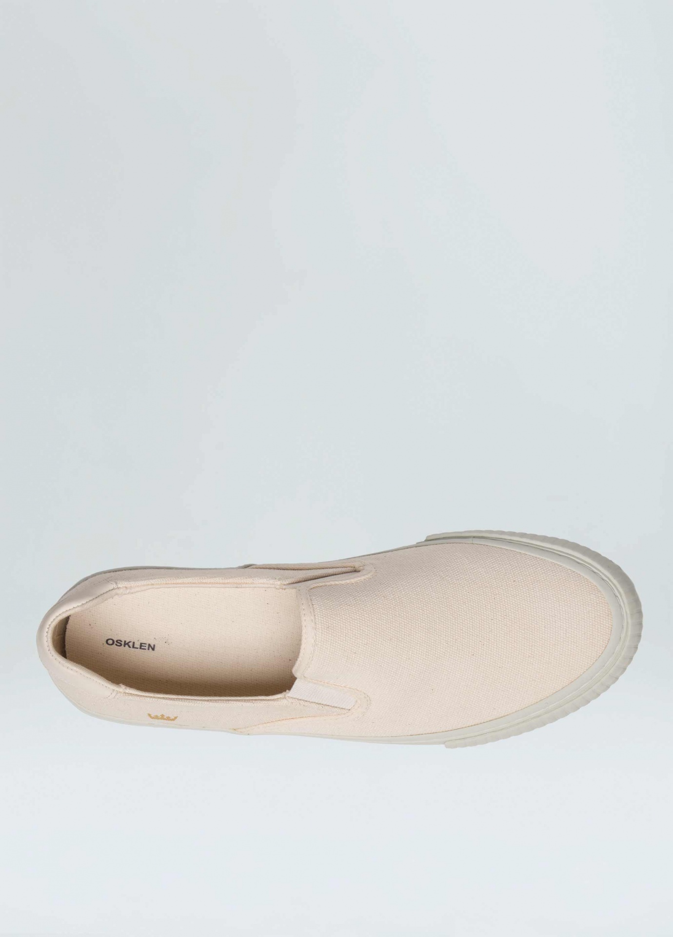 Tênis vulcanizado em lona 100% algodão com detalhe traseiro em couro bovino. Modelo slip on com elásticos para facilitar o calce. Forro e palmilha em sarja 100% algodão. Solado de borracha costurado ao cabedal com fundo inspirado no calçadão de ipanema, design exclusivo osklen. Produto re-design waste. A partir do inverno 21 o solado passou a ser produzido com no mínimo 10% de material reciclado.