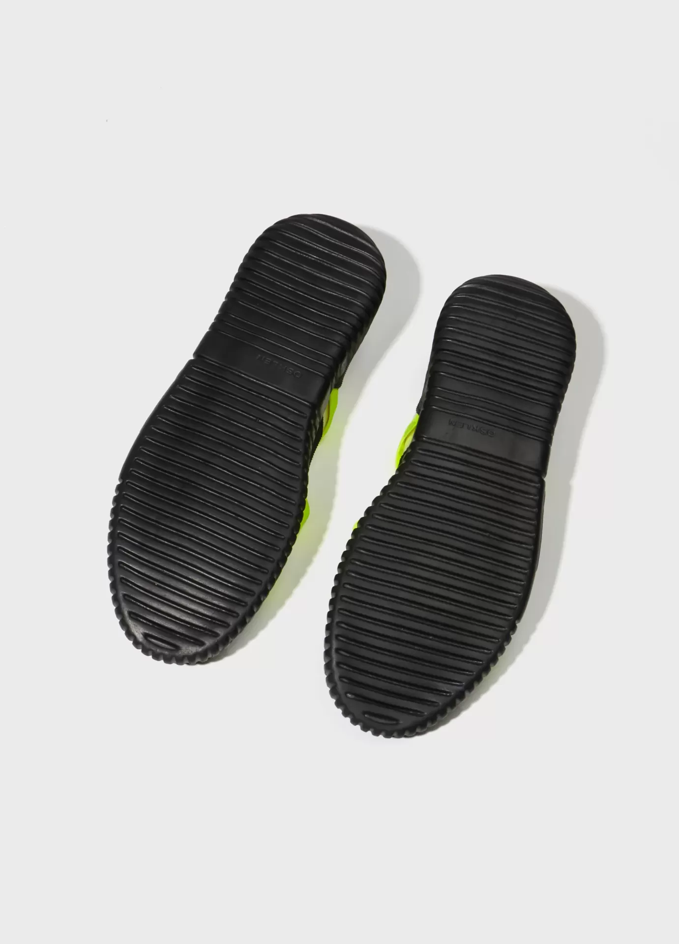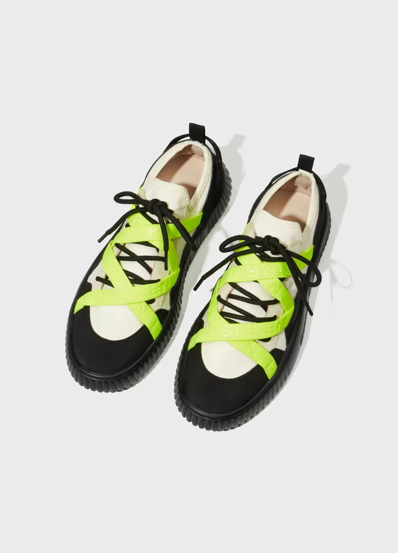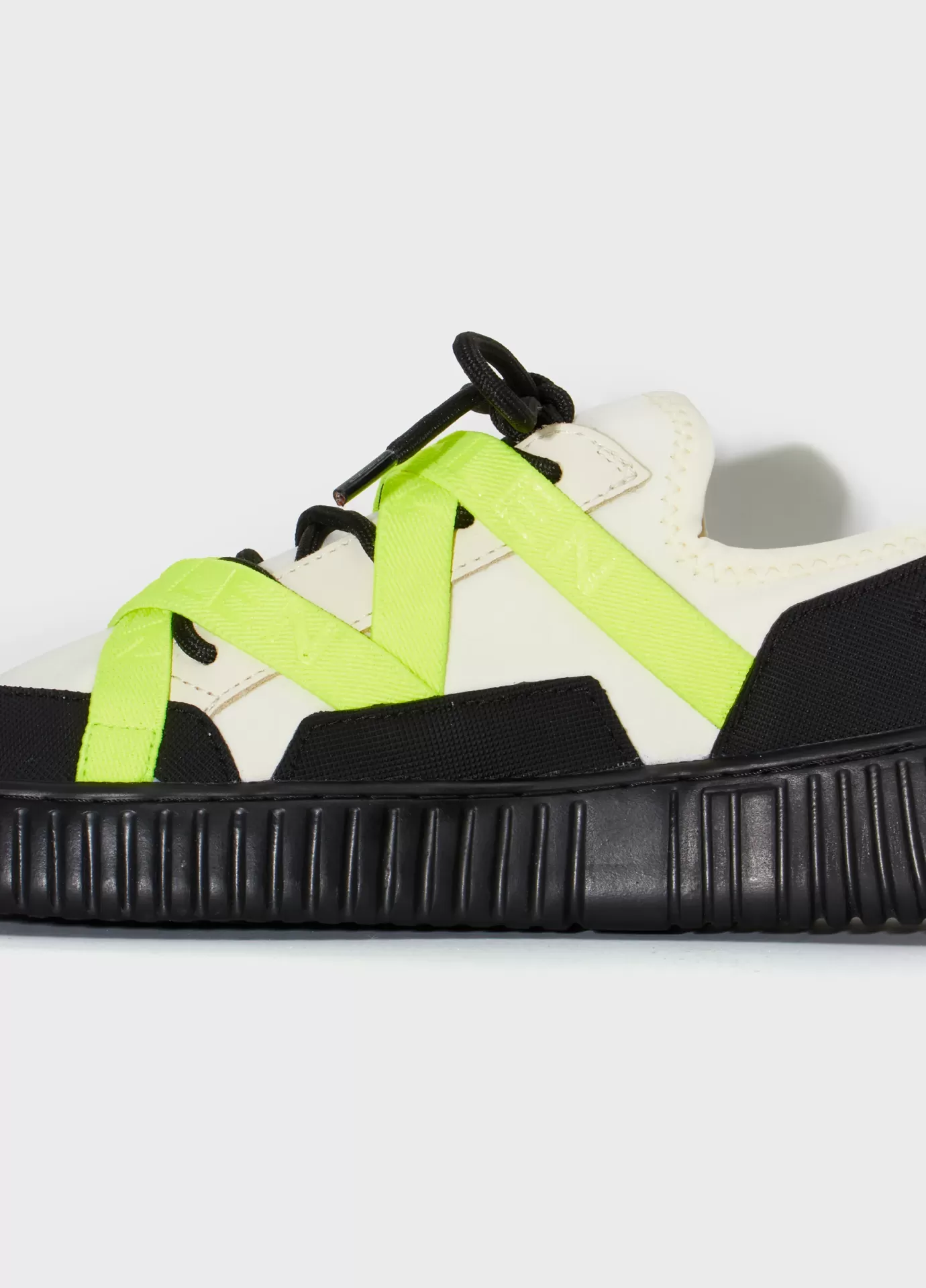 Tênis arp(x) em material elástico com recortes de borracha texturizada e detalhe em couro. elástico personalizado osklen cruzado no cabedal. modelo de amarração com cadarço esportivo. solado com eva verde costurado ao cabedal com design exclusivo