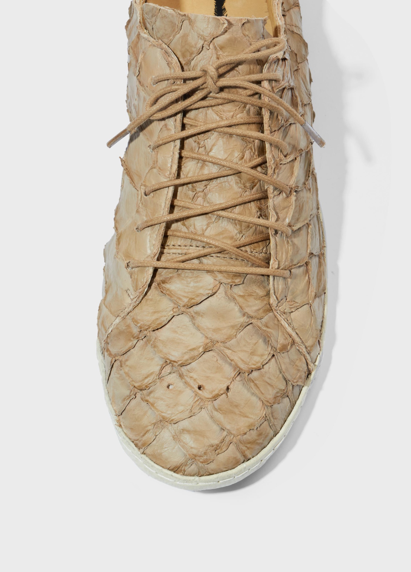 Tênis handmade em couro de pirarucu com visual desestruturado. produto regenerate life. a pele do peixe pirarucu usada pela osklen atende às normas rigorosas de manejo sustentável e protege a espécie do risco de extinção, além da própria floresta já que não envolve desmatamento. modelo de amarração com cadarço de algodão. forro parcial e palmilha em couro bovino. solado de borracha costurado ao cabedal com design exclusivo osklen, produzido com no mínimo 10% de material reciclado. produto re-design waste.