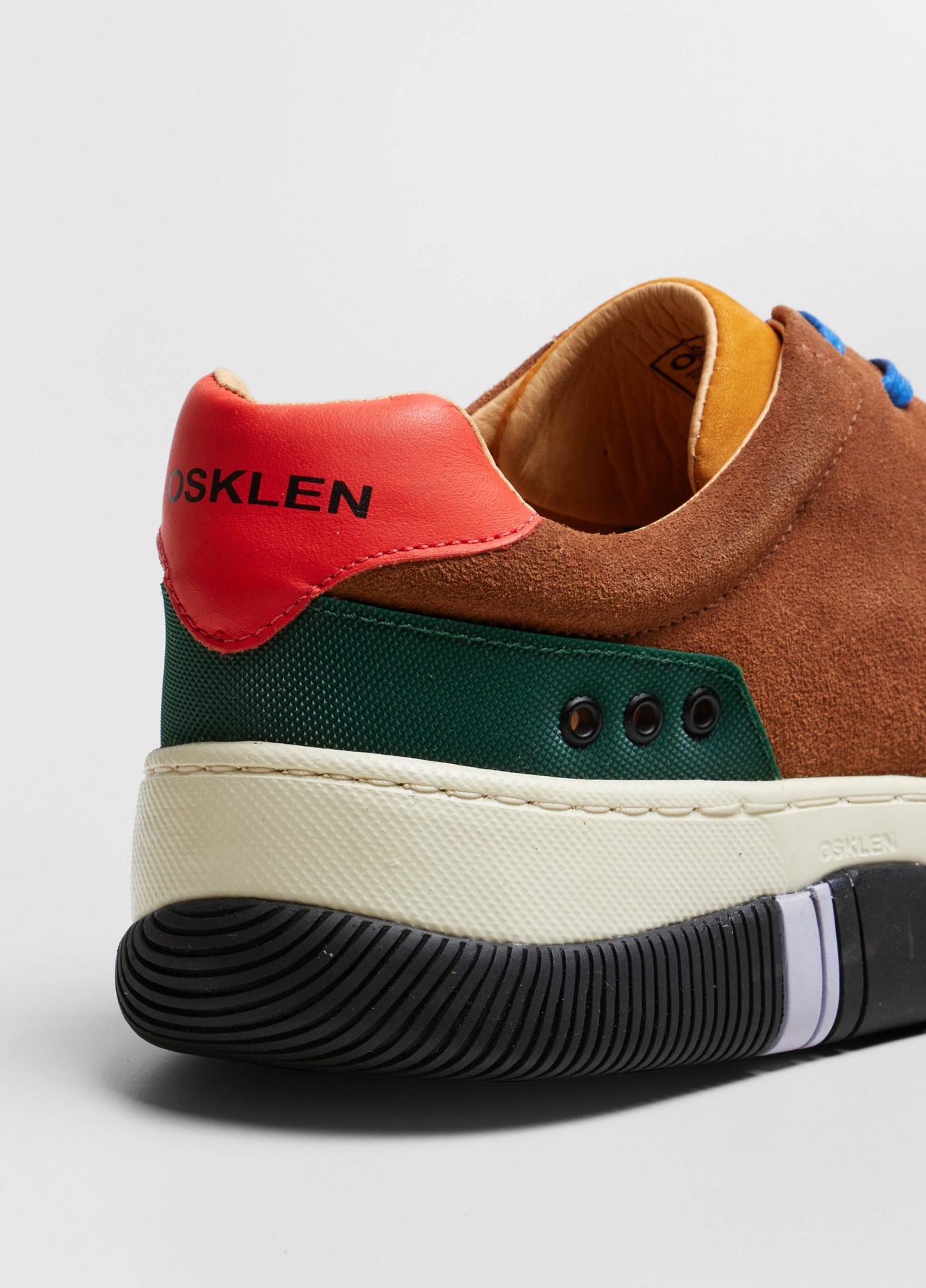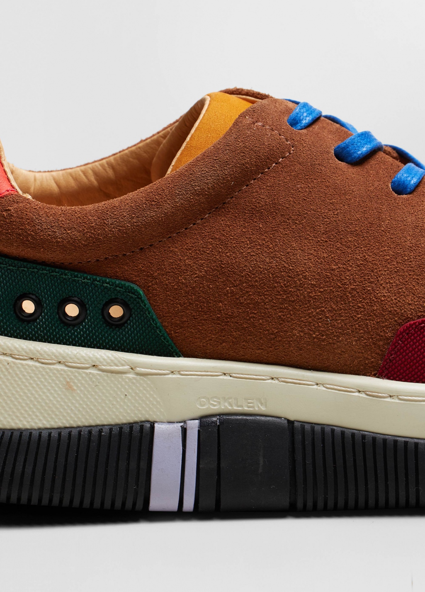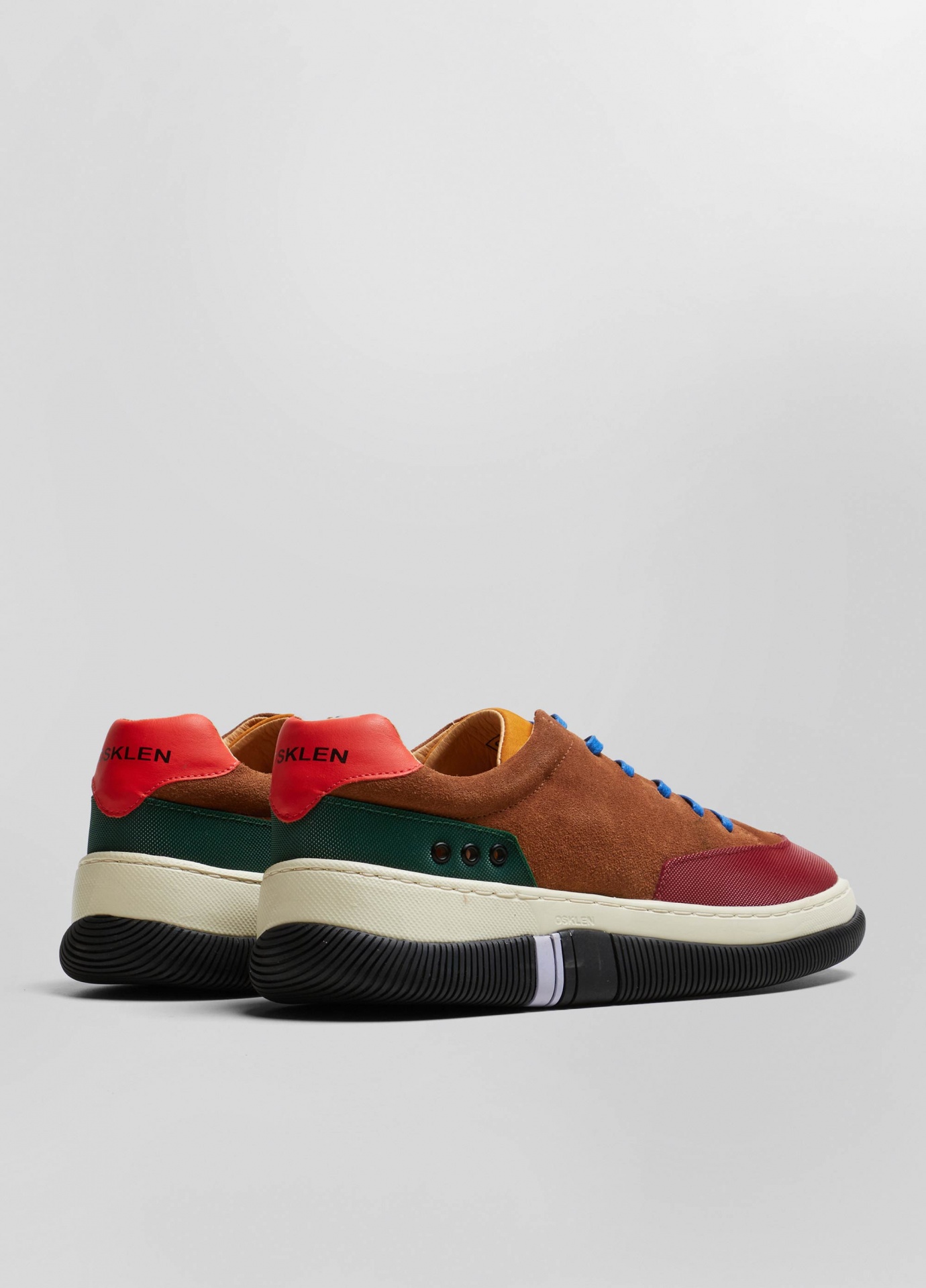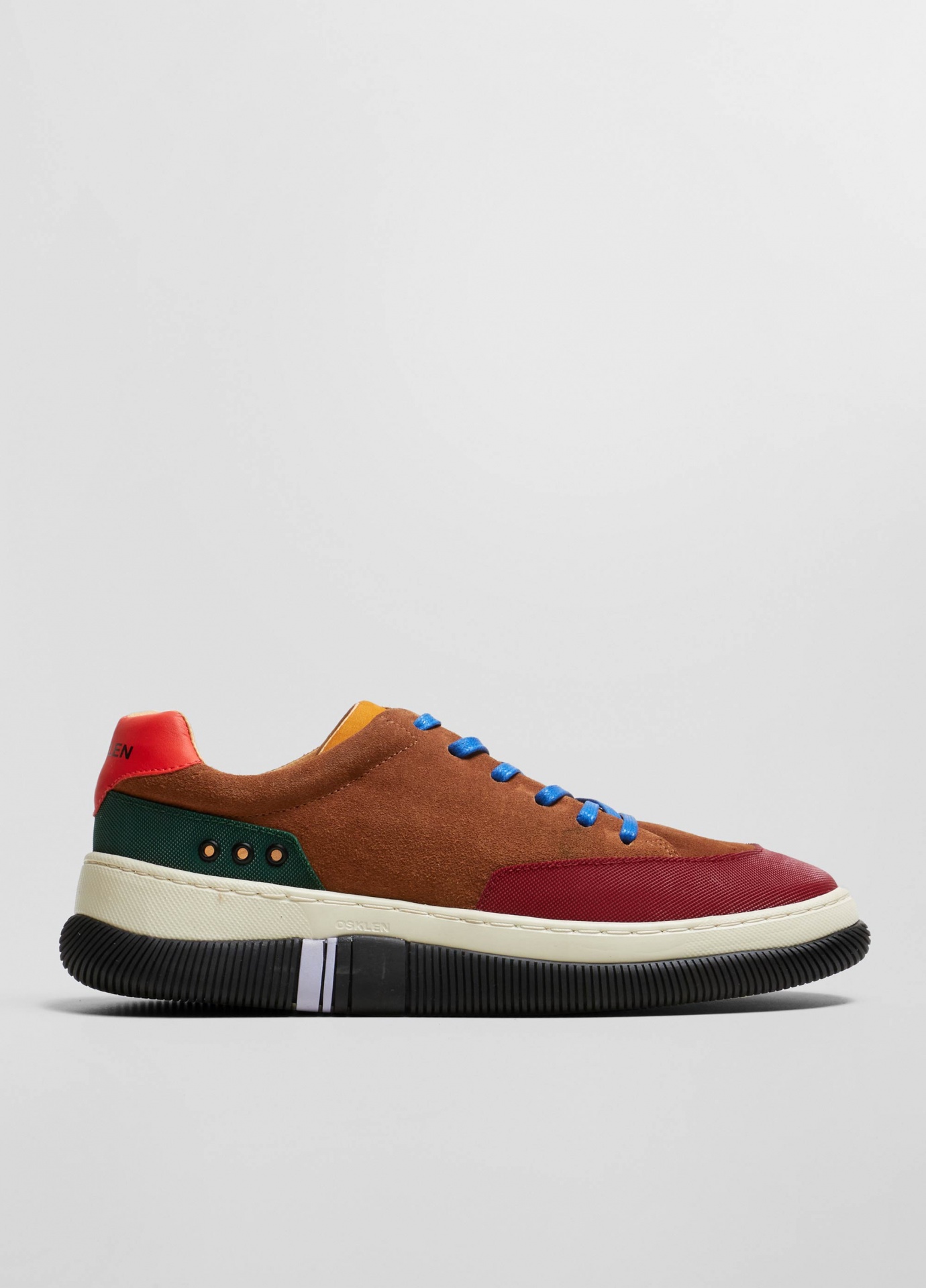 Tênis hybrid em camurça bovina com toque aveludado e recortes de borracha texturizada no bico e na traseira. Modelo de amarração com cadarço de algodão. Forro e palmilha em couro bovino. Solado de eva e borracha costurado ao cabedal com design exclusivo osklen, produzido com no mínimo 10% de material reciclado. Produto re-design waste.
