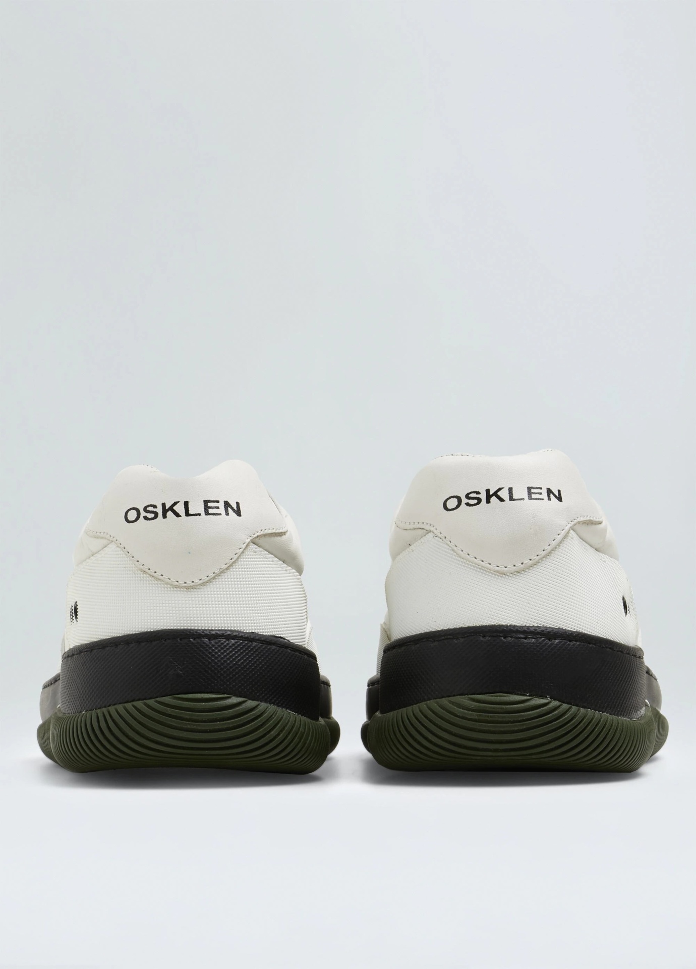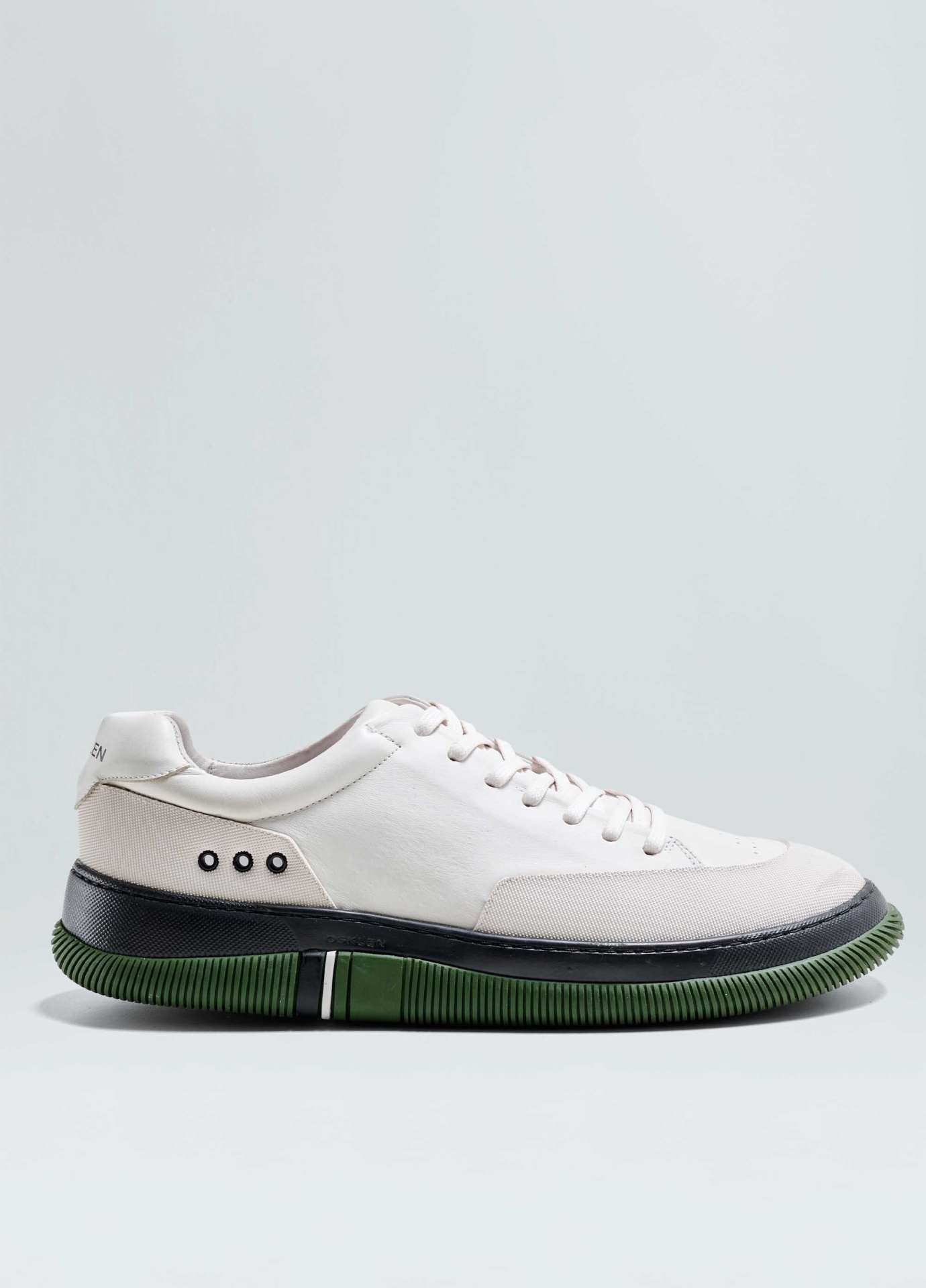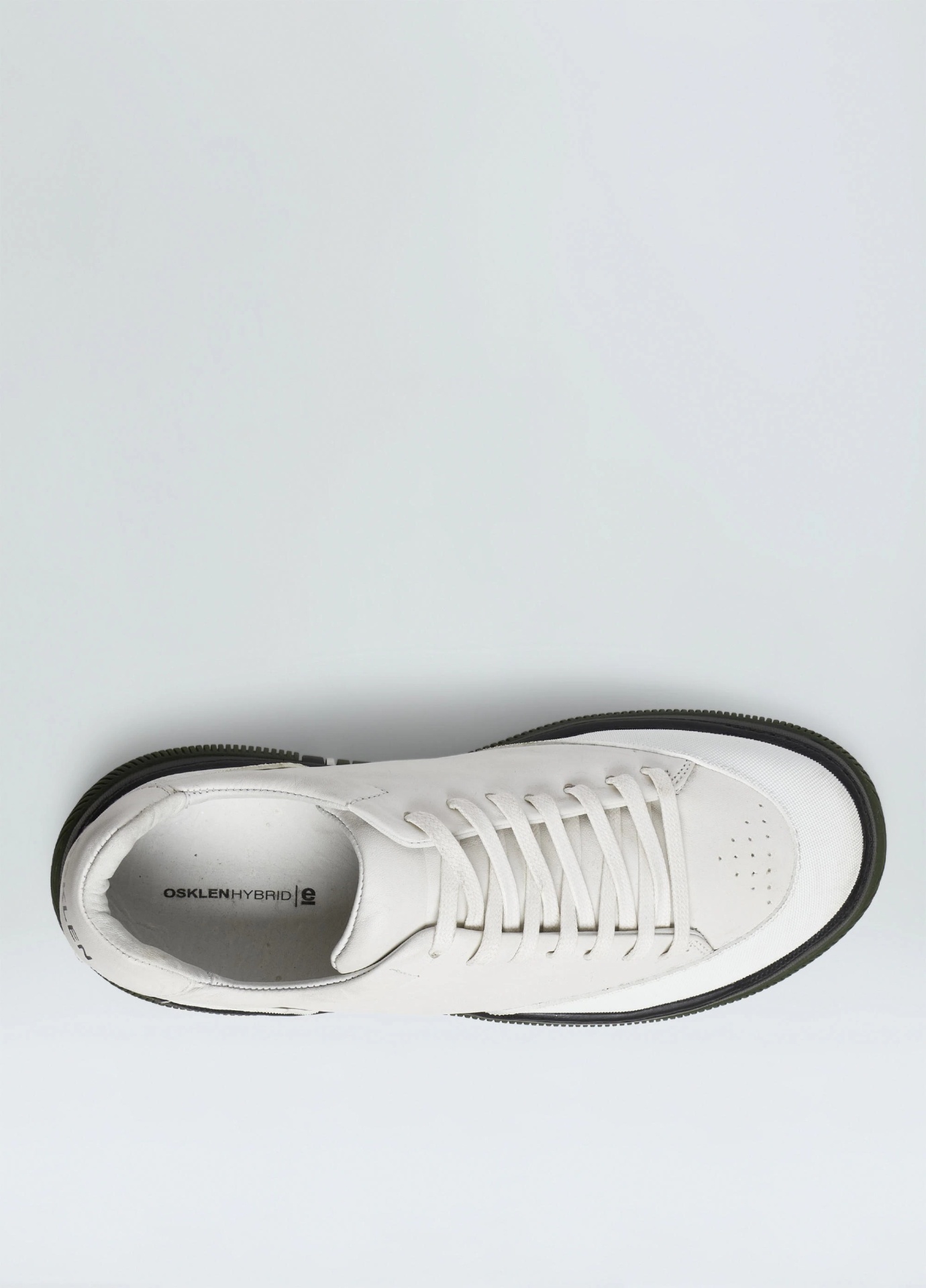 Tênis Hybrid em couro bovino com recortes de borracha texturizada no bico e na traseira. Modelo de amarração com cadarço de algodão. Forro e palmilha em couro bovino. Solado de EVA e borracha costurado ao cabedal com design exclusivo Osklen. Produto Re-Design Waste. A partir do Inverno 21 o solado passou a ser produzido com no mínimo 10% de material reciclado.
