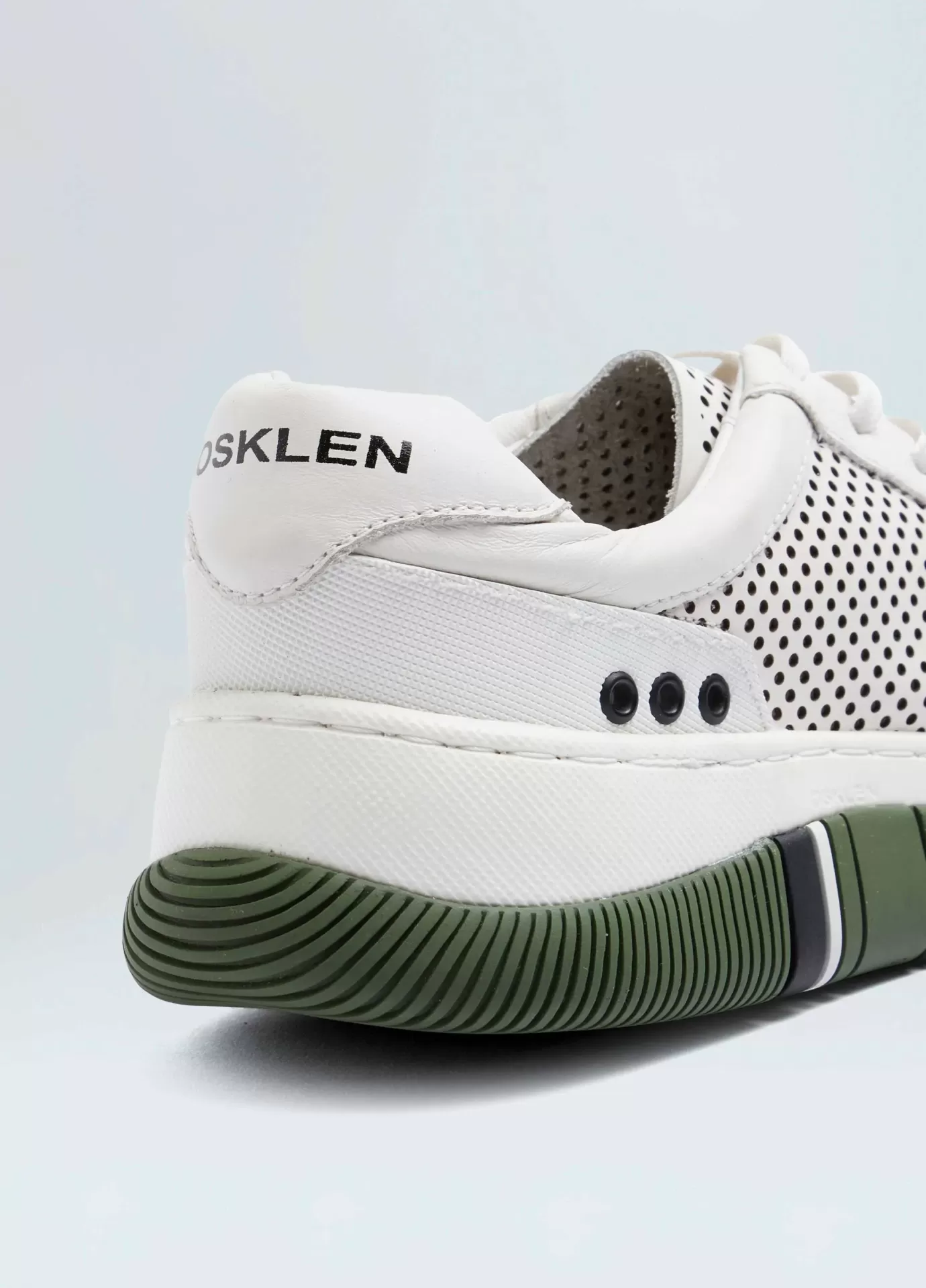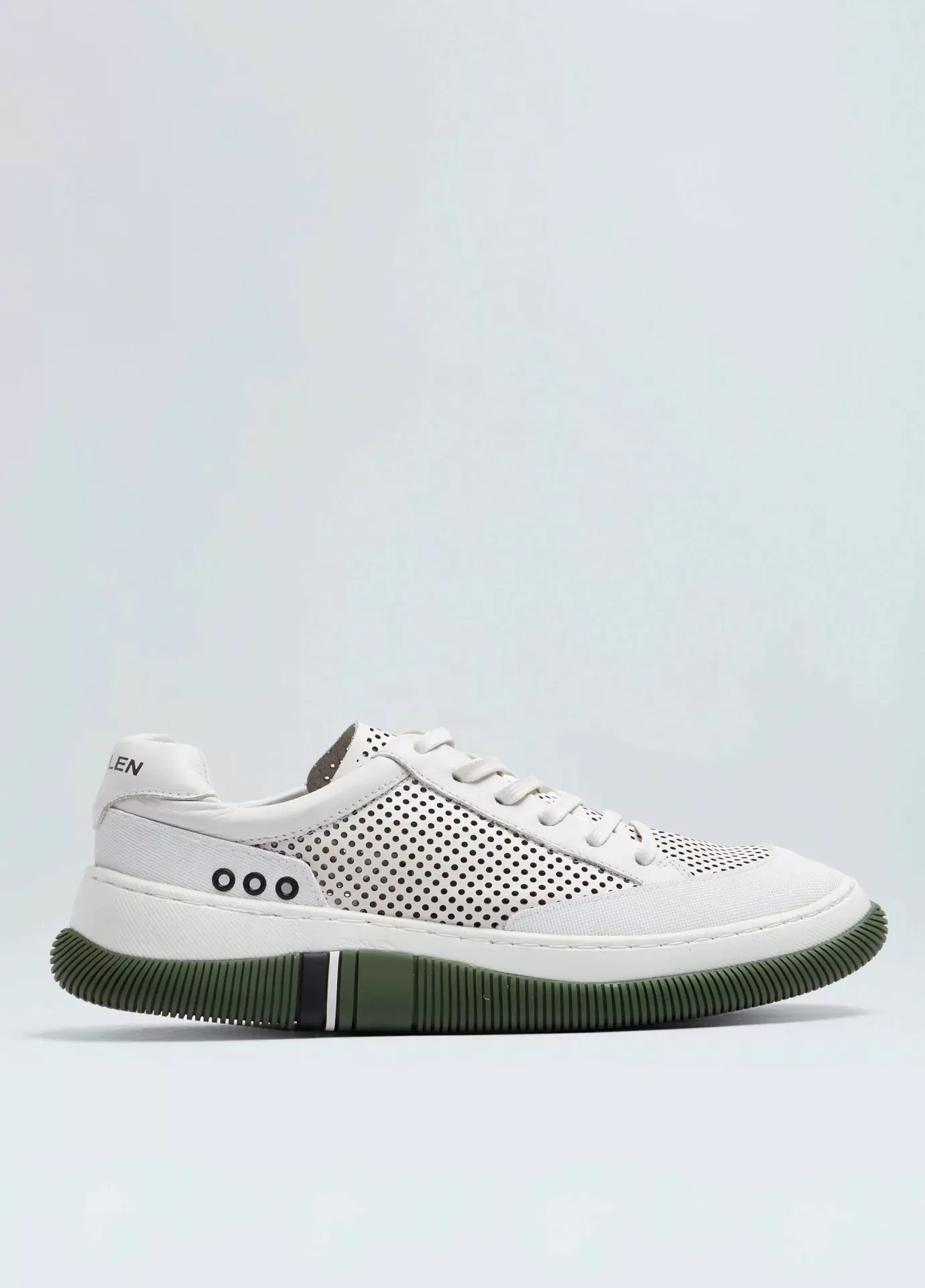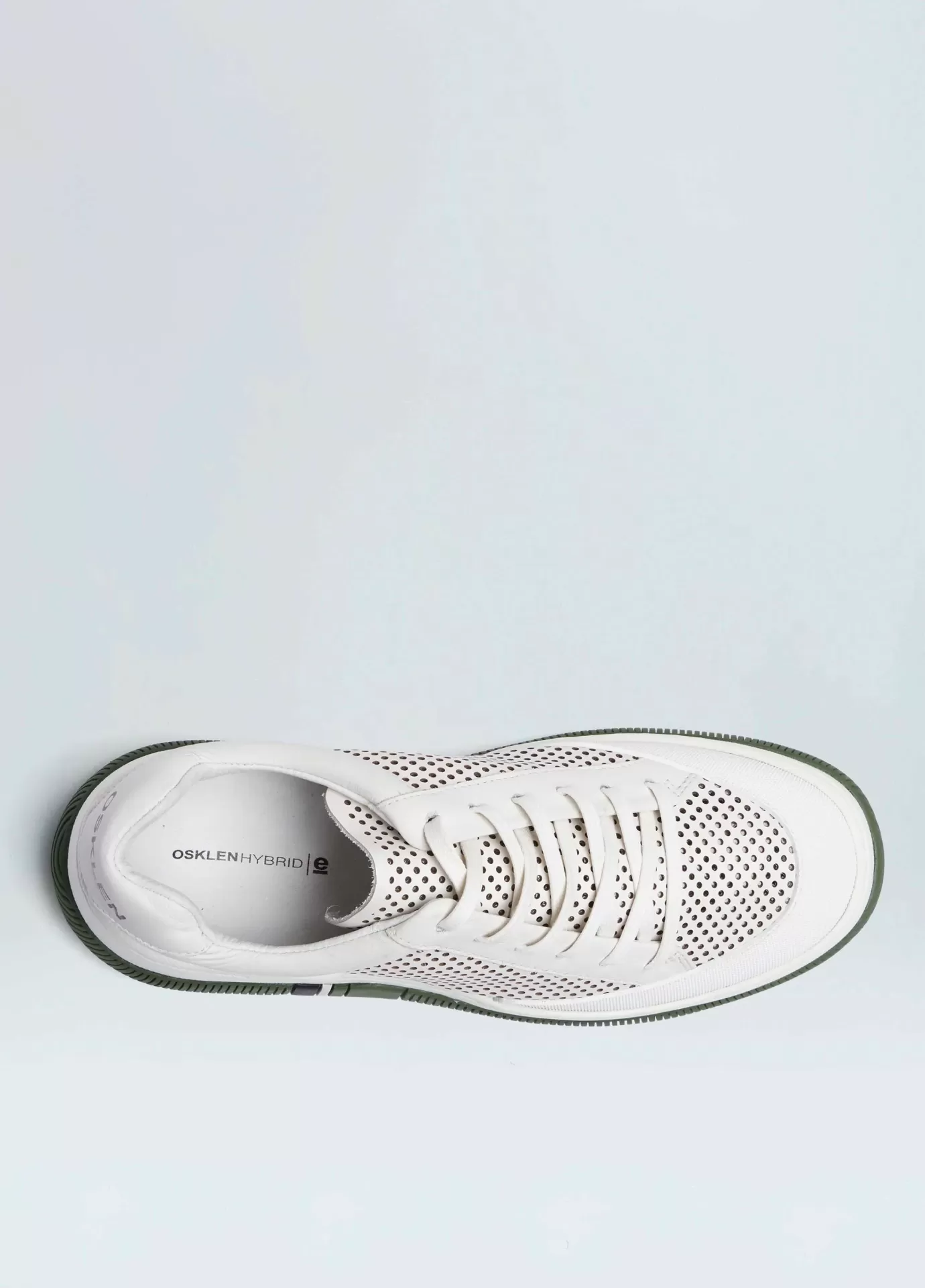 Tênis hybrid em couro com microfuros vazados a laser. modelo de amarração com cadarço de algodão. forro e palmilha em couro. solado de eva e borracha costurado ao cabedal com design exclusivo osklen. produto re-design waste. a partir do inverno 21 o solado passou a ser produzido com no mínimo 10% de material reciclado.