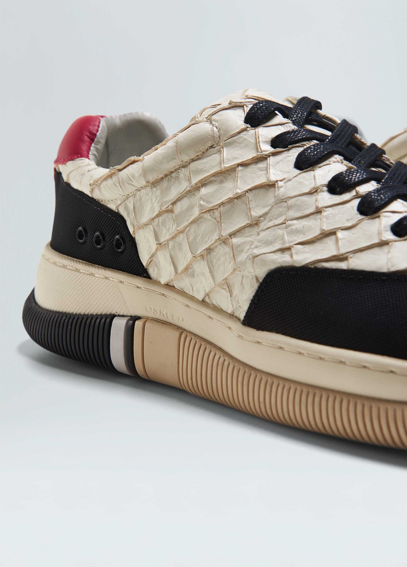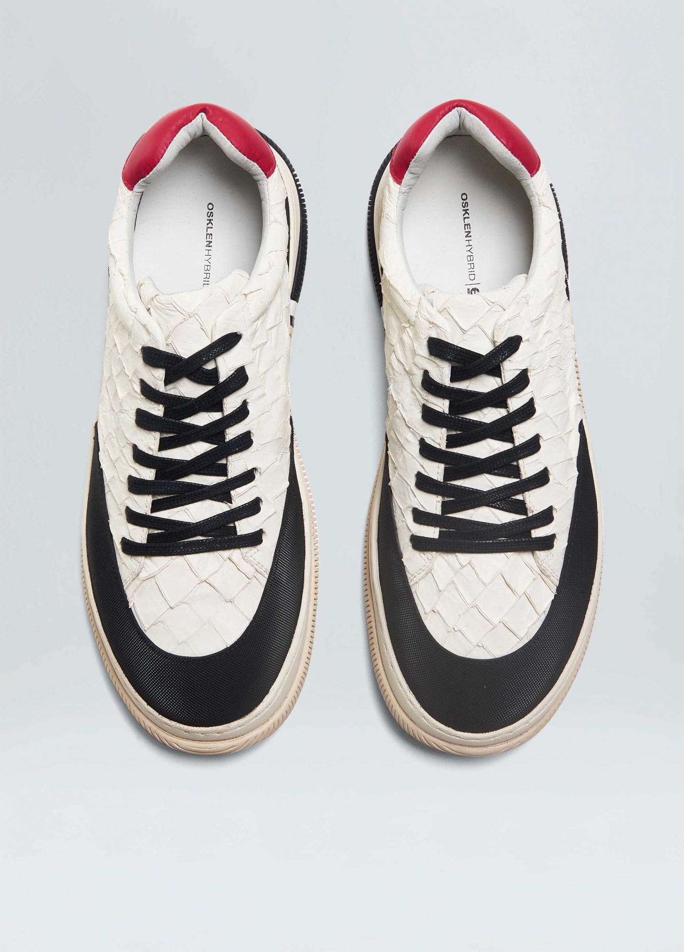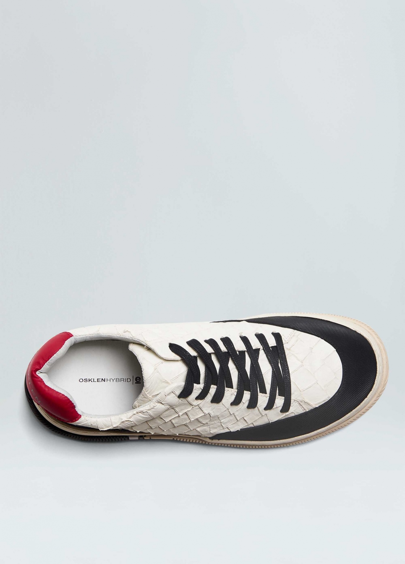 Tênis hybrid em couro de pirarucu com recortes de borracha texturizada no bico e na traseira. Produto regenerate life. A pele do peixe pirarucu usada pela osklen atende às normas rigorosas de manejo sustentável e protege a espécie do risco de extinção, além da própria floresta já que não envolve desmatamento. Modelo de amarração. Forro e palmilha em couro bovino. Solado de eva e borracha costurado ao cabedal com design exclusivo osklen, produzido com no mínimo 10% de material reciclado. Produto re-design waste.