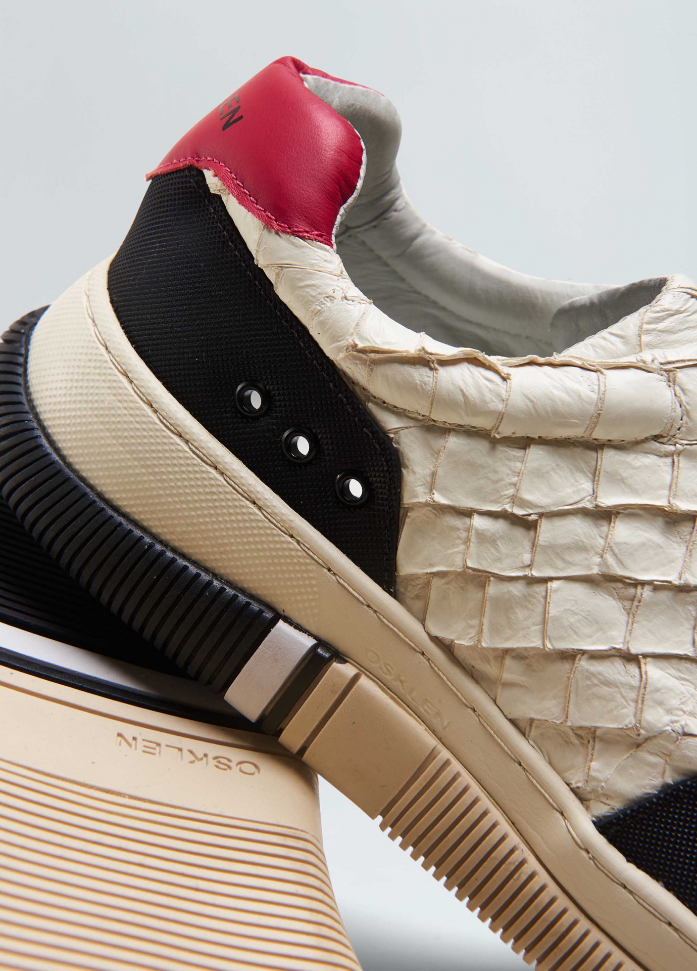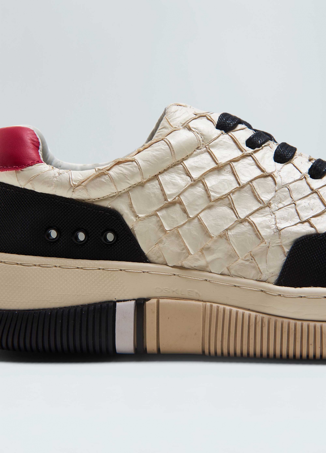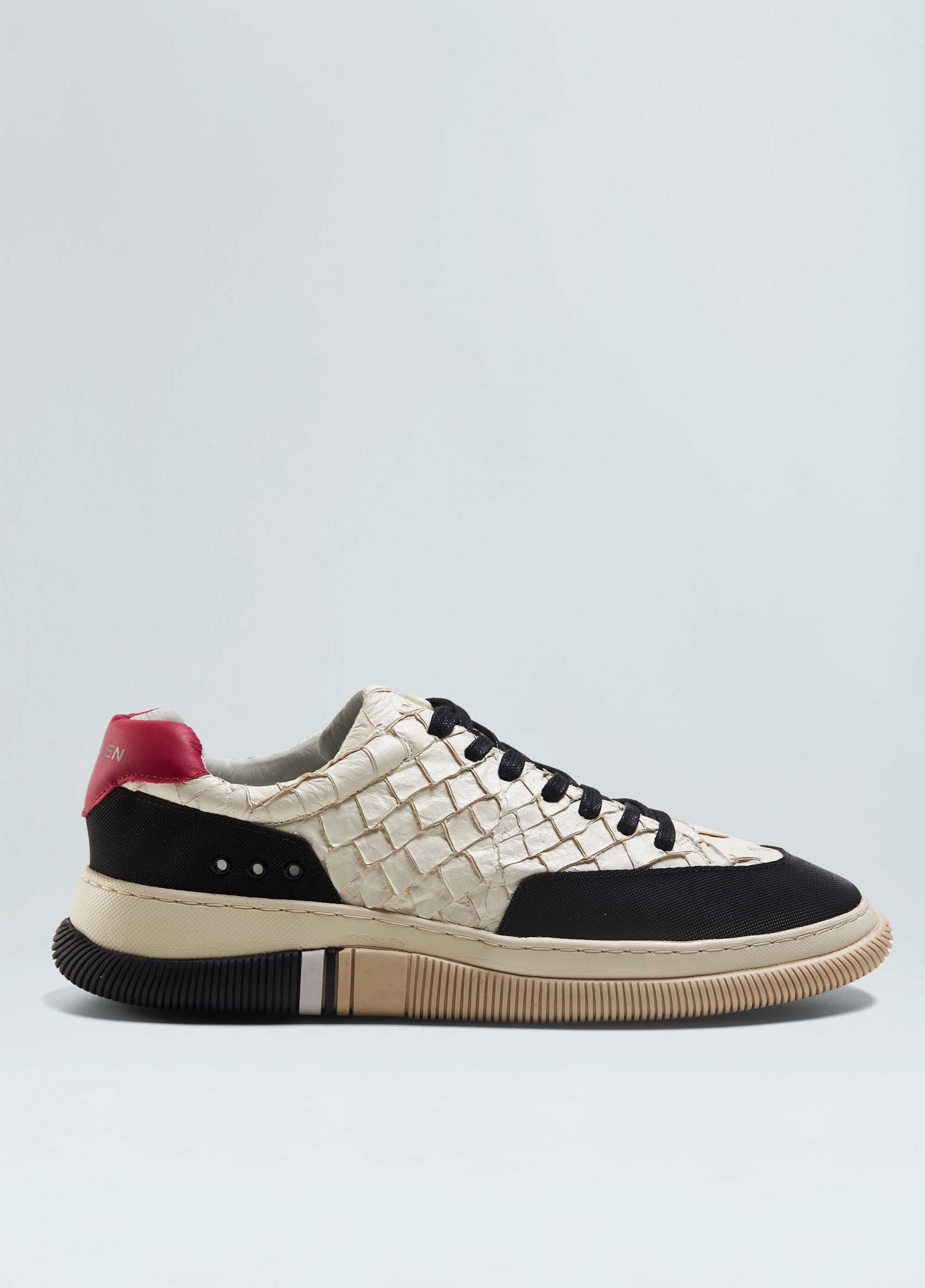 Tênis hybrid em couro de pirarucu com recortes de borracha texturizada no bico e na traseira. Produto regenerate life. A pele do peixe pirarucu usada pela osklen atende às normas rigorosas de manejo sustentável e protege a espécie do risco de extinção, além da própria floresta já que não envolve desmatamento. Modelo de amarração. Forro e palmilha em couro bovino. Solado de eva e borracha costurado ao cabedal com design exclusivo osklen, produzido com no mínimo 10% de material reciclado. Produto re-design waste.