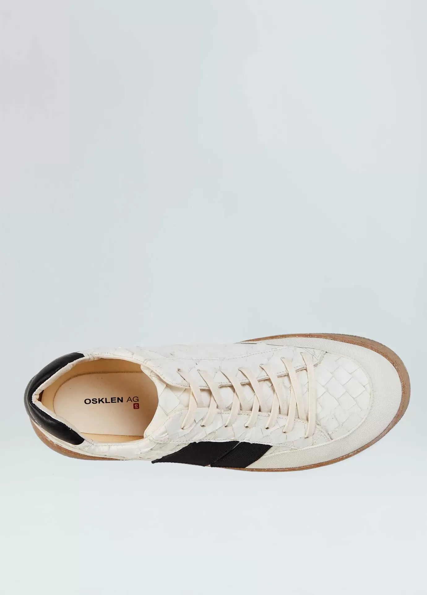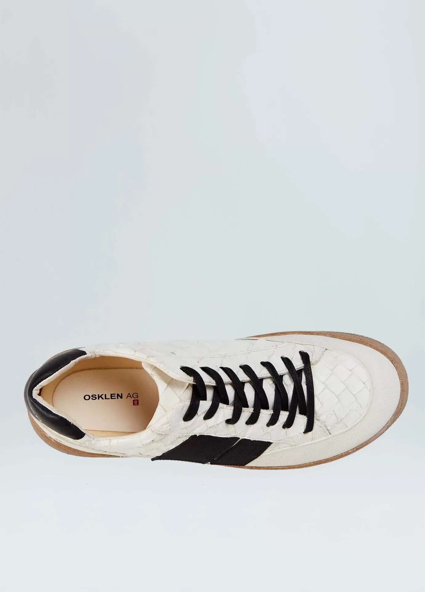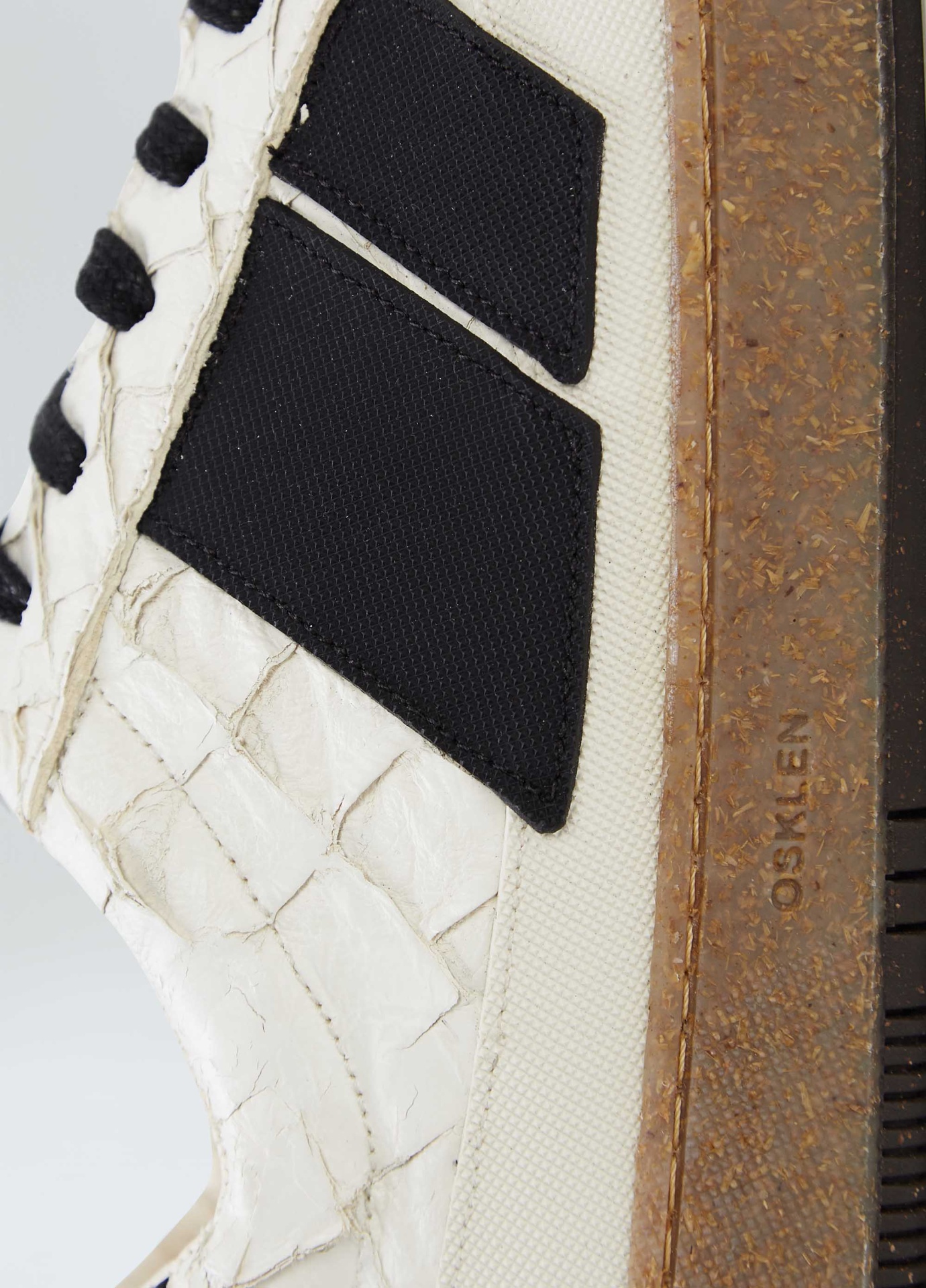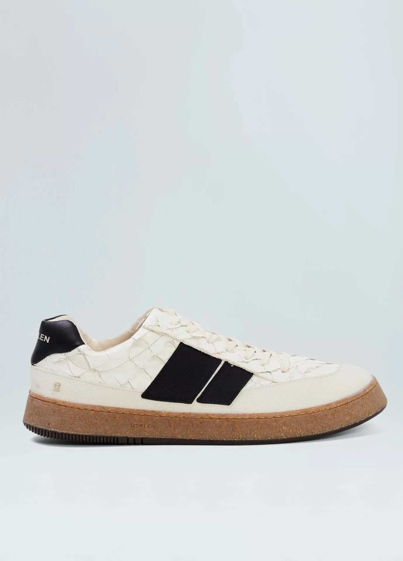 Tênis em couro de Pirarucu com detalhe traseiro em couro bovino chrome free rastreado e certificado. Assinatura lateral e recorte da base em borracha texturizada feita com látex natural da Amazônia. Modelo de amarração com cadarço de algodão. Parte interna e palmilha de EVA verde forrados com couro bovino chrome free rastreado e certificado. Solado Soho de borracha feita com látex natural da Amazônia e resíduos reciclados, design exclusivo Osklen. Esse produto carrega as 3 bandeiras de sustentabilidade da marca: Regenerate Life, Respect our People, e Re-Design Waste.Ténis AG