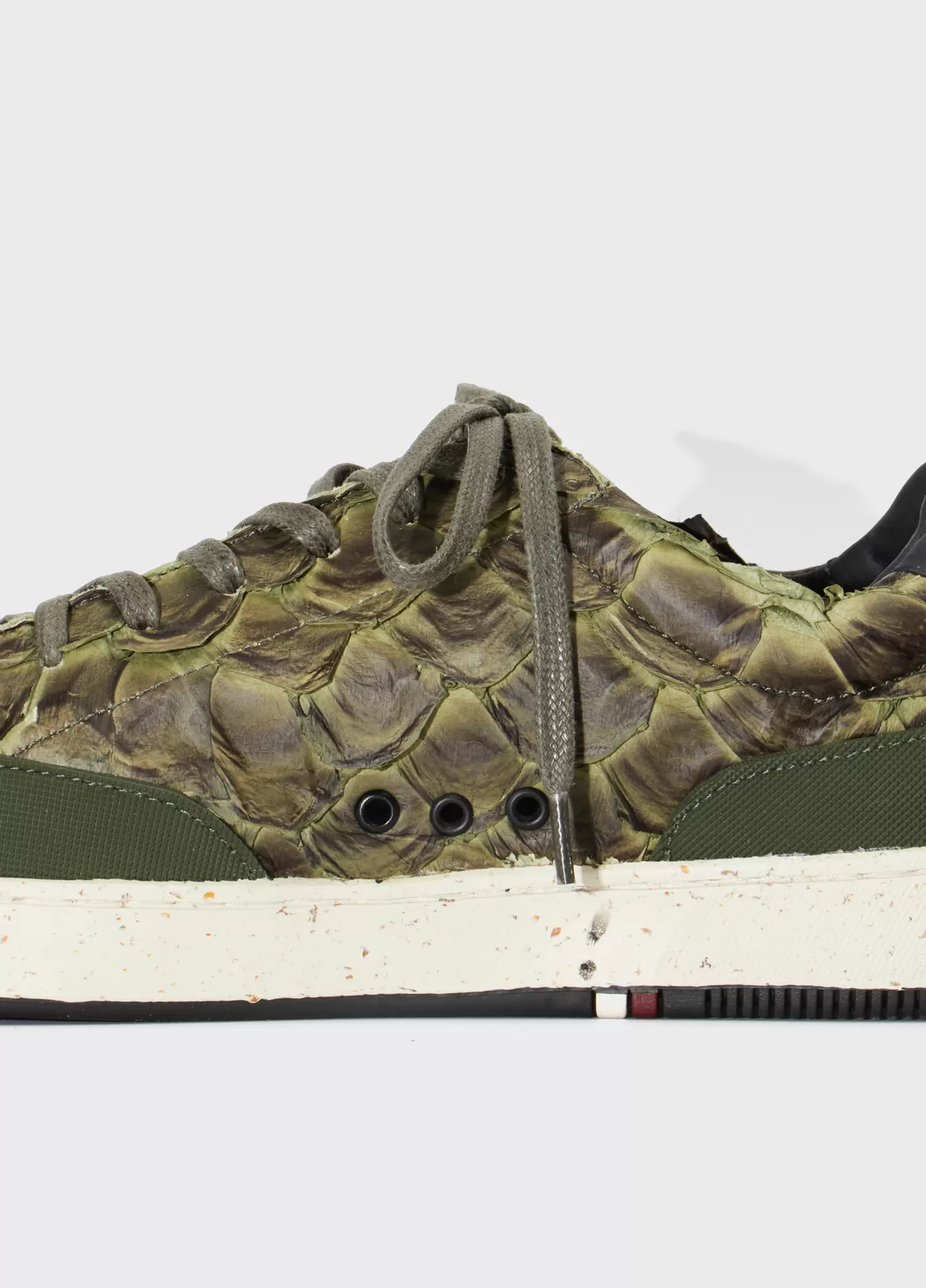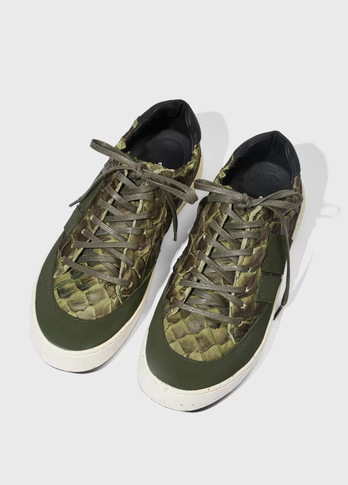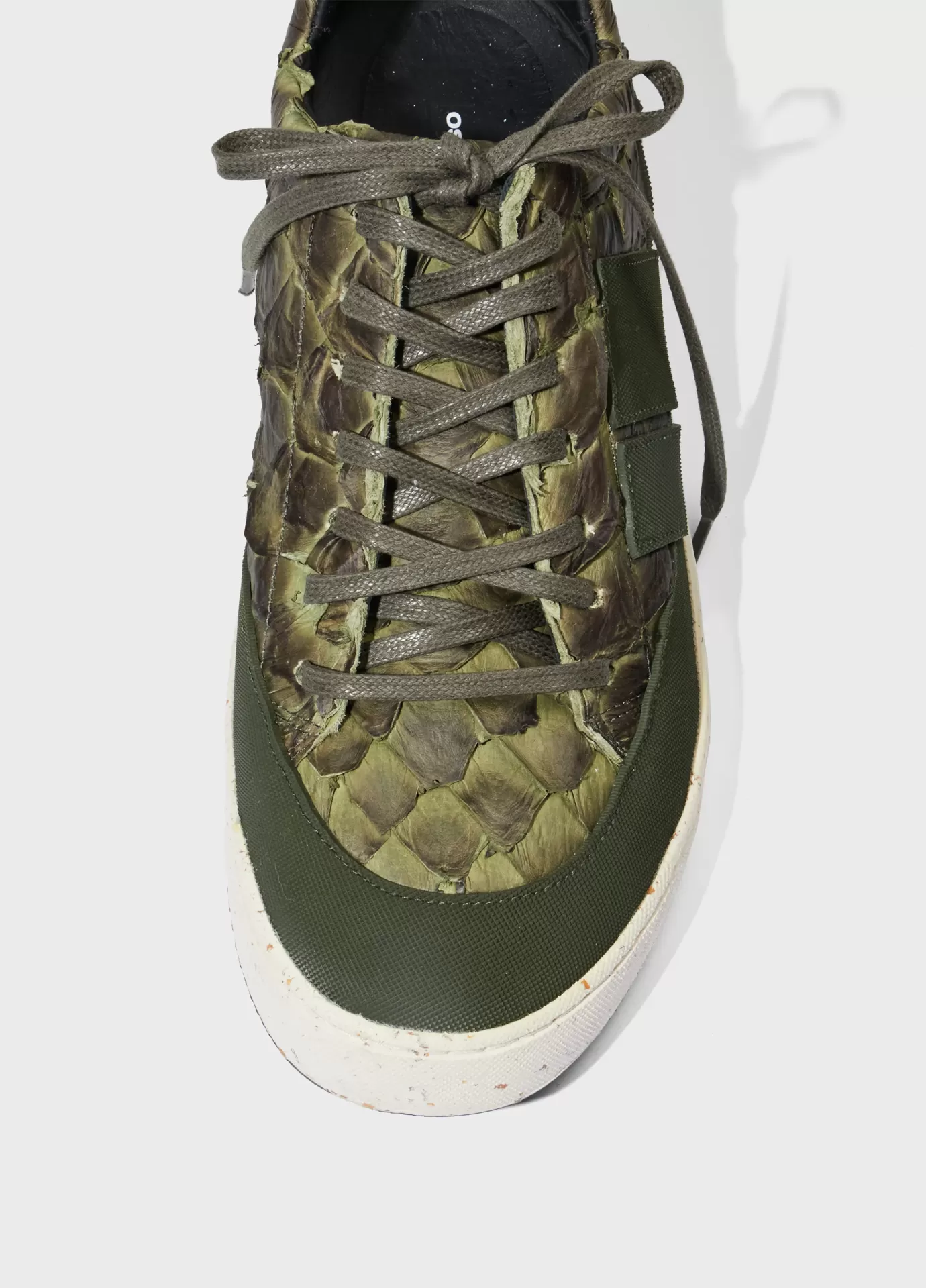 Tênis em couro de Pirarucu com detalhe traseiro em couro bovino chrome free rastreado e certificado. Assinatura lateral e recorte da base em borracha texturizada feita com látex natural da Amazônia. Modelo de amarração com cadarço de algodão. Parte interna e palmilha de EVA verde forrados com couro bovino chrome free rastreado e certificado. Solado Soho de borracha feita com látex natural da Amazônia e resíduos reciclados, design exclusivo Osklen. Esse produto carrega as 3 bandeiras de sustentabilidade da marca: Regenerate Life, Respect our People, e Re-Design Waste.Ténis AG