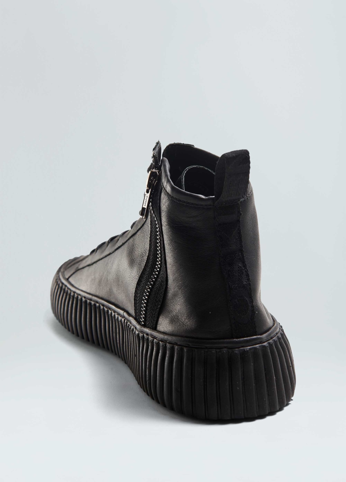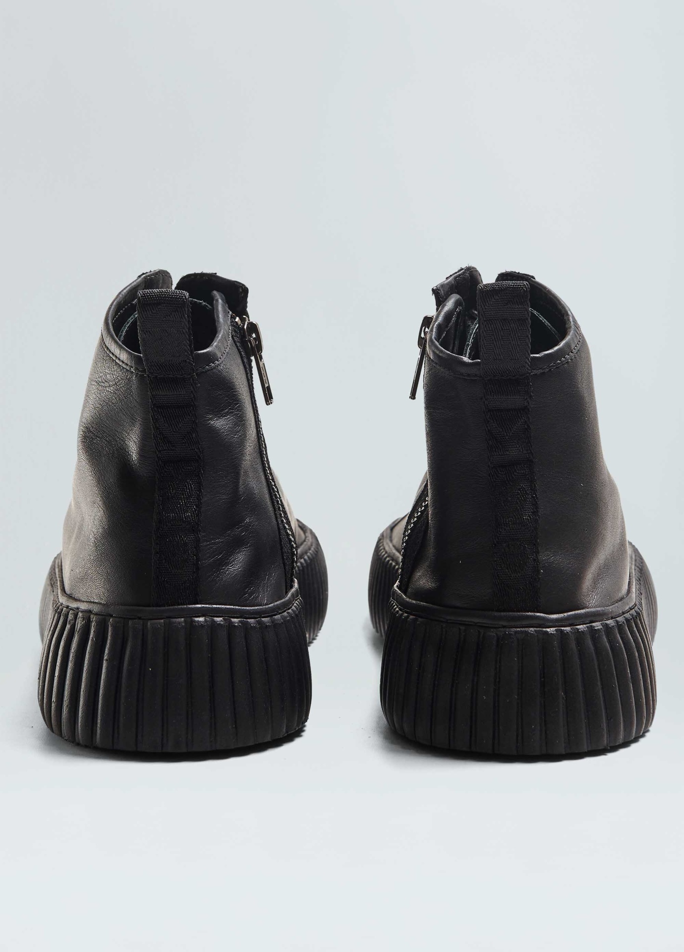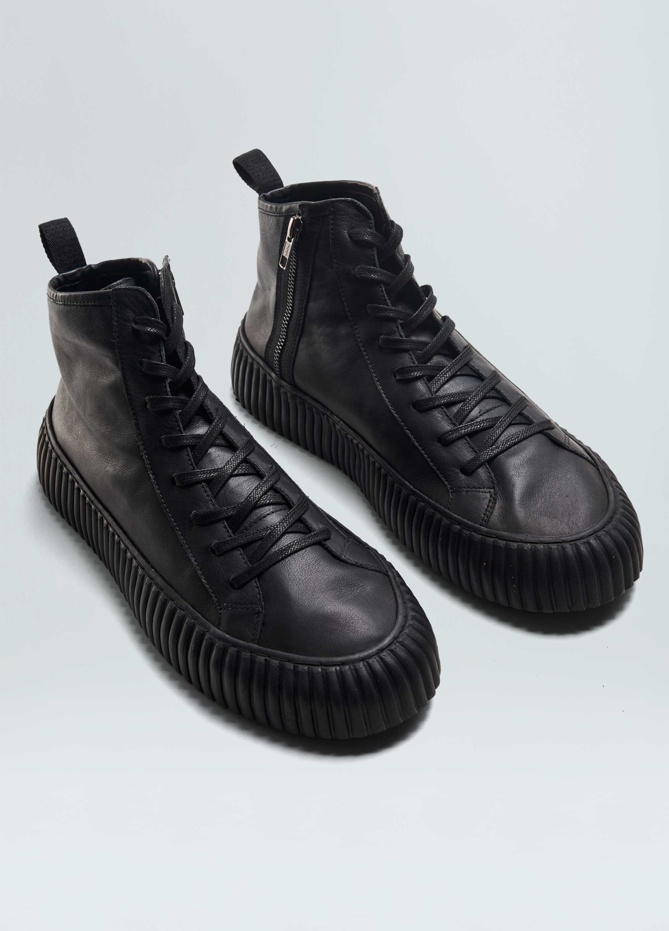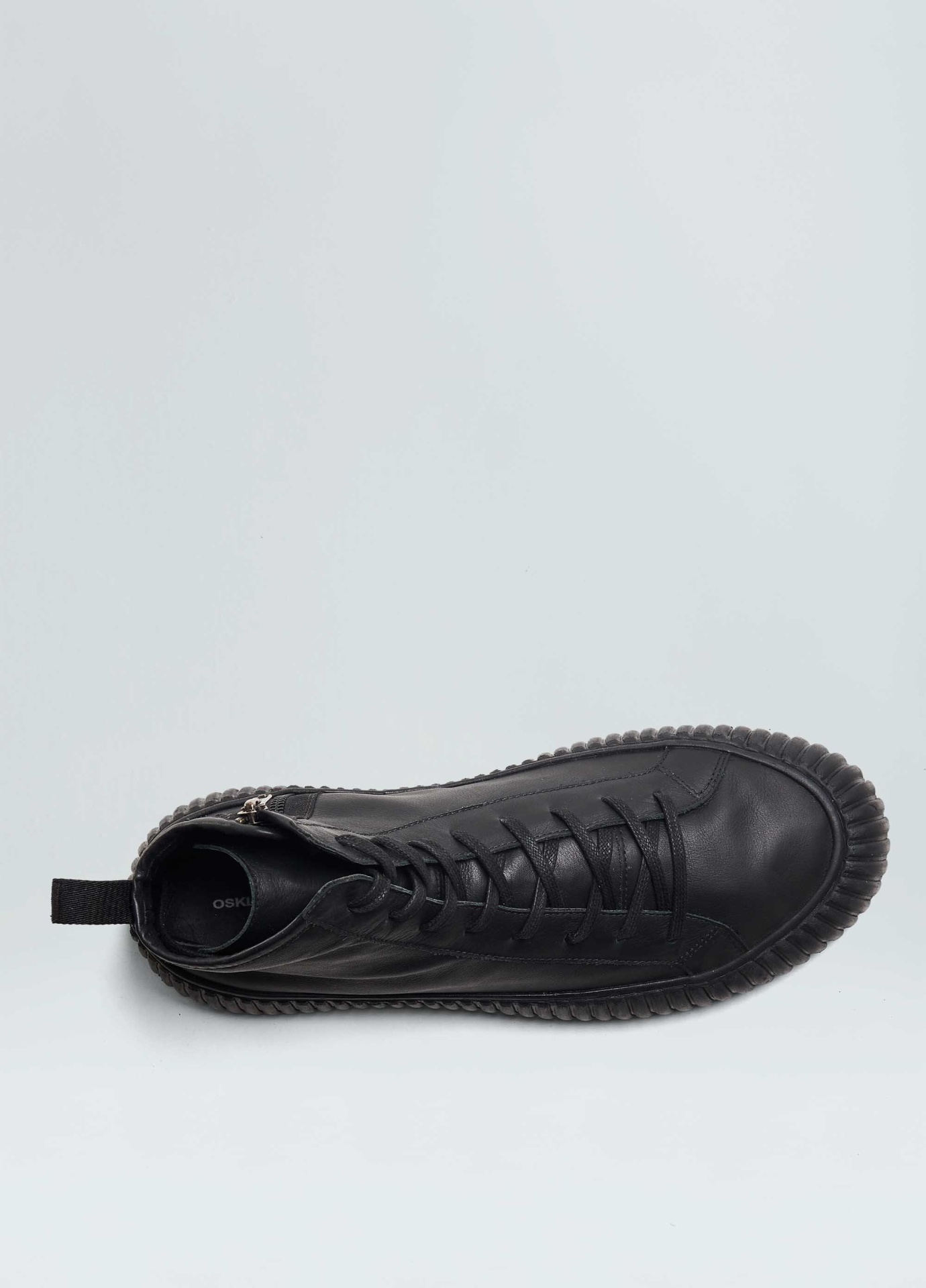 Tênis vulcanizado cano alto em couro bovino. Fita puxador personalizada Osklen. Modelo de amarração com cadarço de algodão e zíper na lateral interna para facilitar o calce. Forro e palmilha em couro bovino. Solado flatform de borracha costurado ao cabedal com design exclusivo Osklen, produzido com no mínimo 10% de material reciclado. Produto Re-Design Waste.