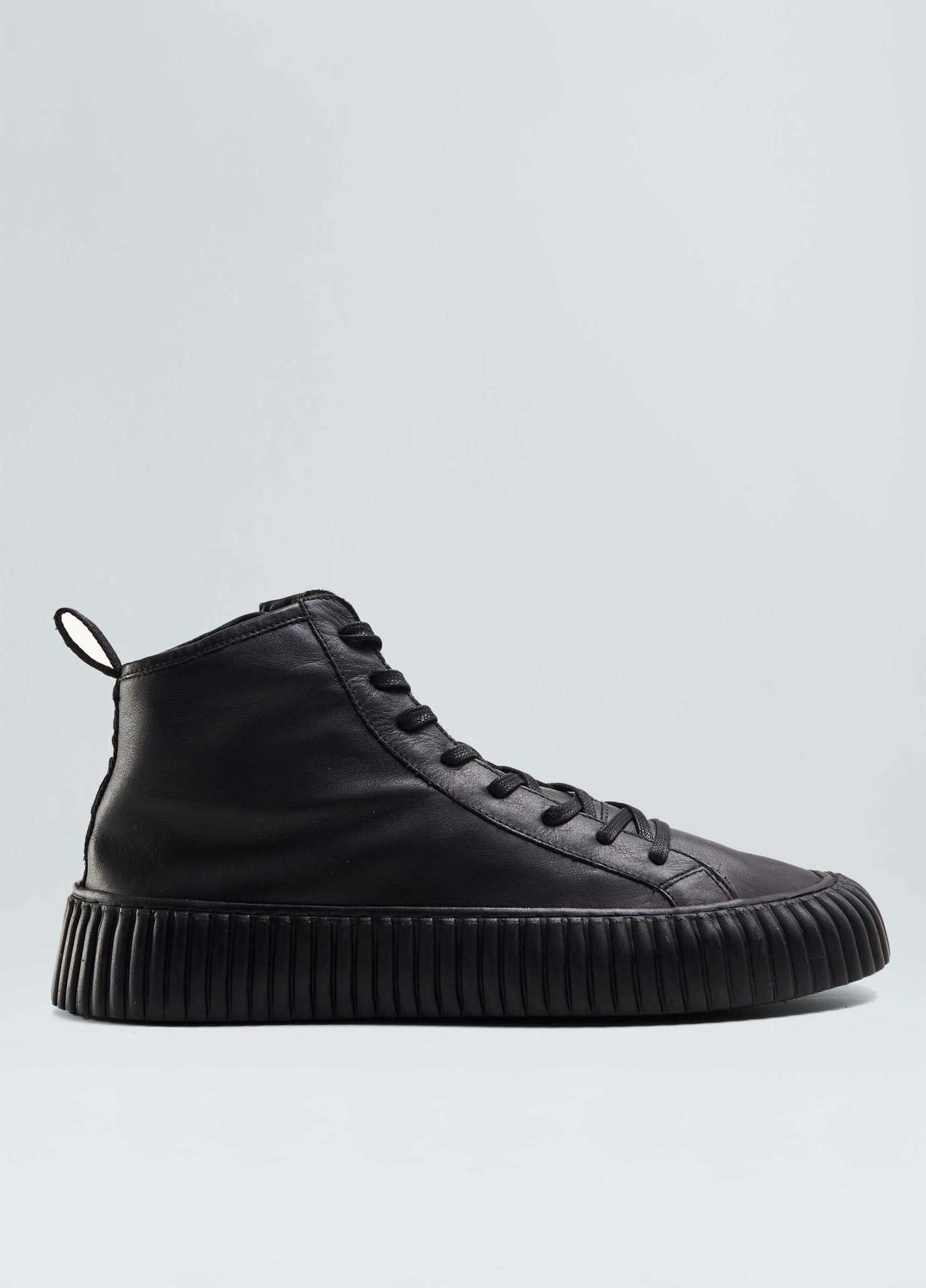 descriçãoTênis vulcanizado cano alto em couro bovino. Fita puxador personalizada Oskl