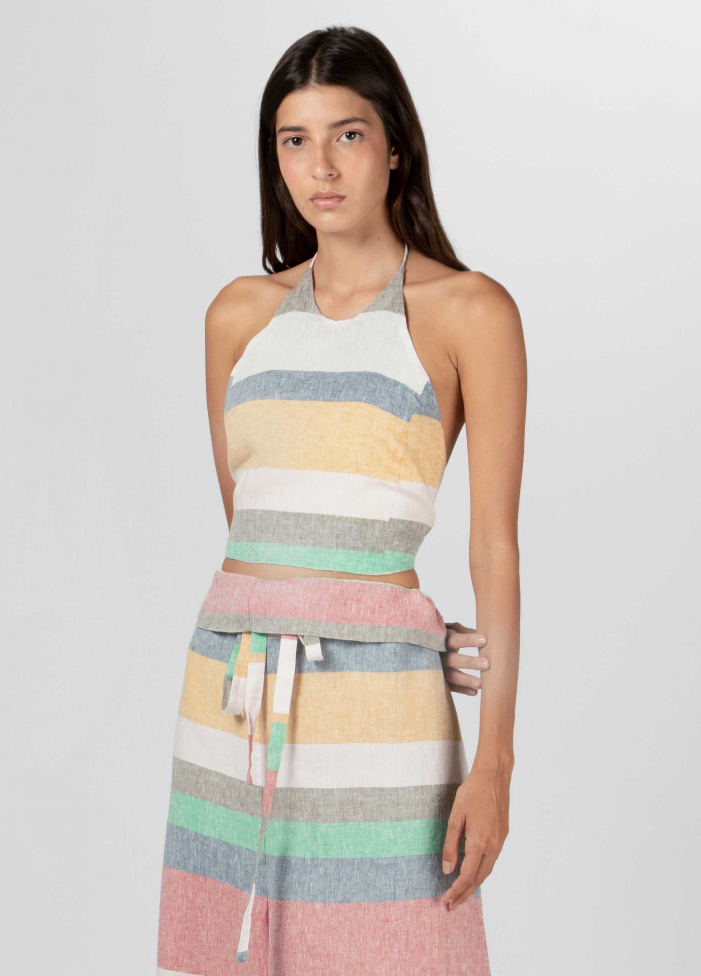 Top frente única, cropped, com amarração costas, listrado em fio tinto colorido em 100% linho. Fibras Nobres: Produto da linha fibras nobres.