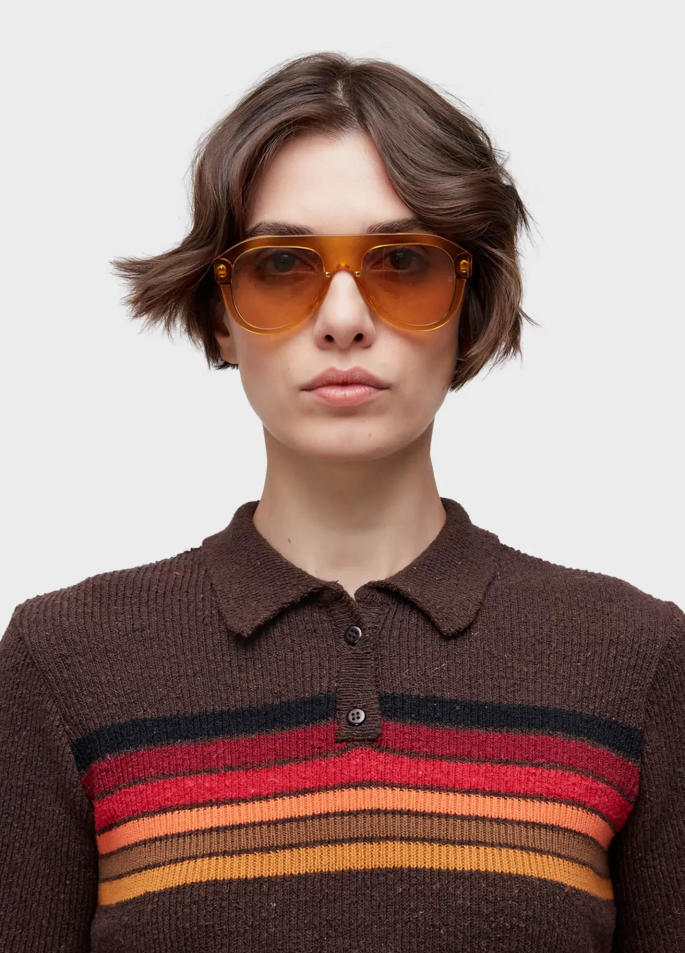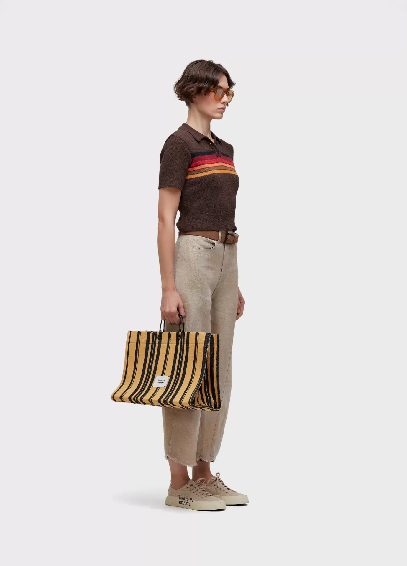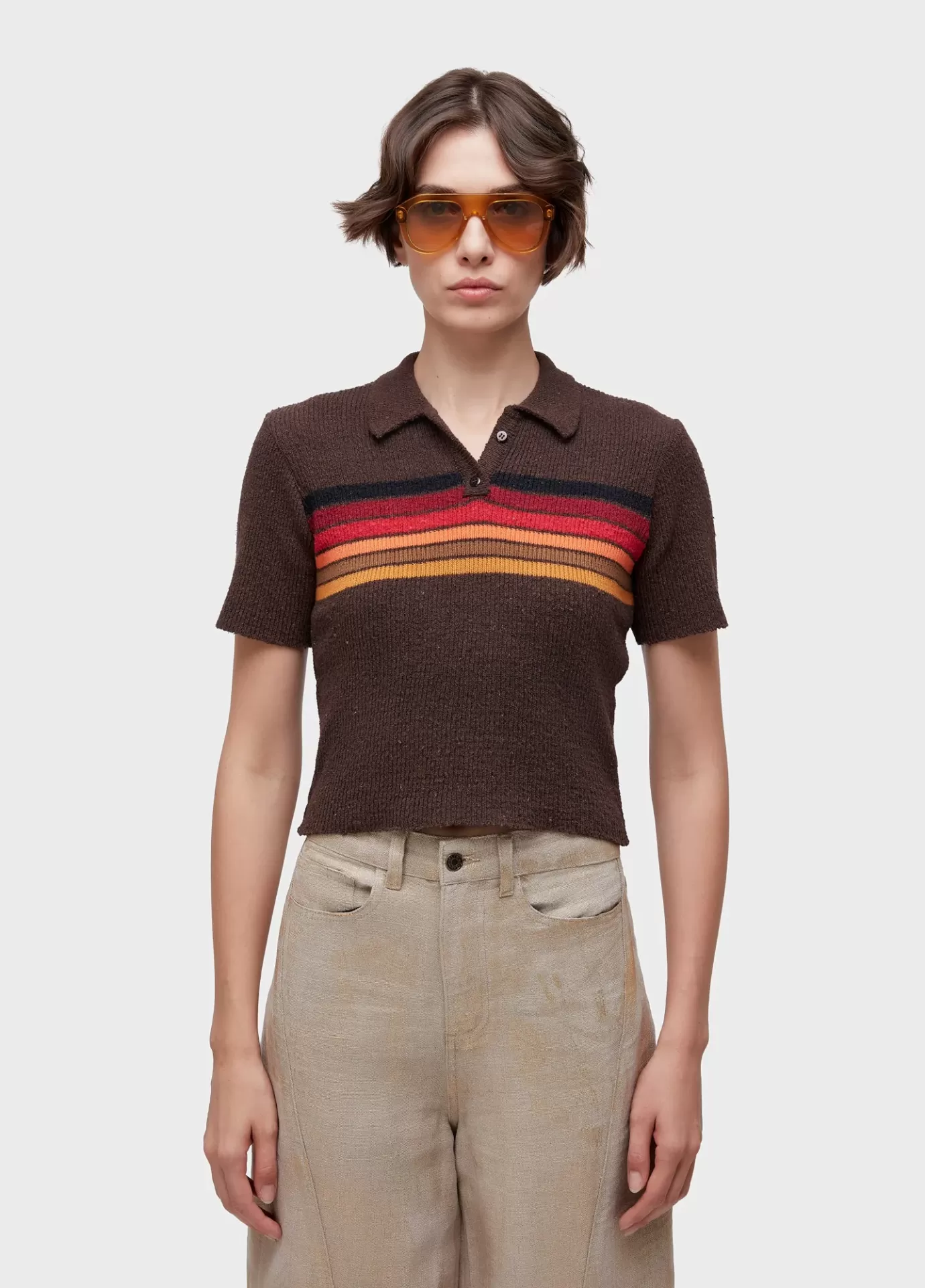 Blusa polo listrada de tricot, desenvolvida com fio de algodão reciclado. A peça poss