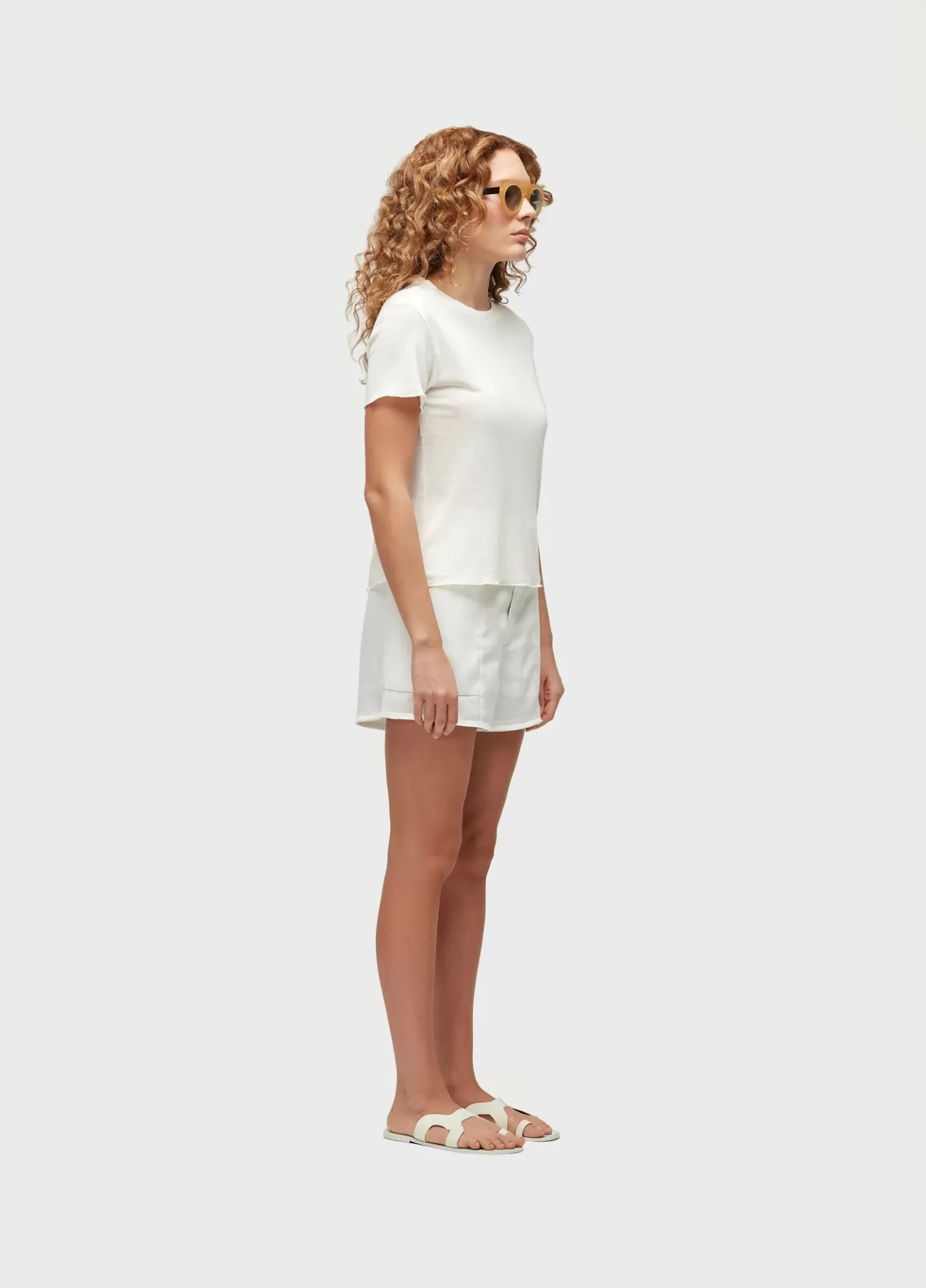 T-shirt feminina em malha de linho com viscose; Modelagem reta; Estampa Brazilian So