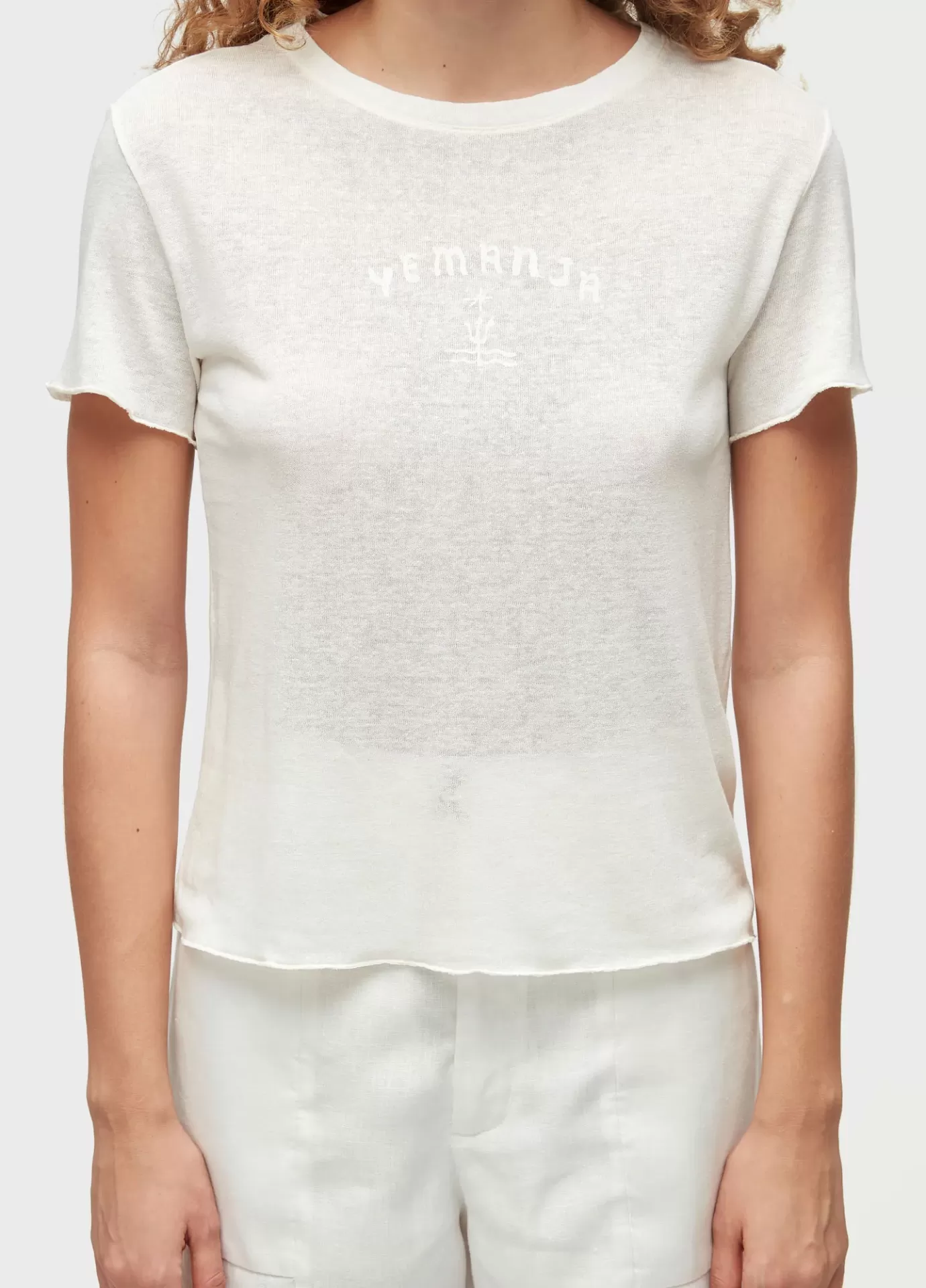 T-shirt feminina em malha de linho com viscose; Modelagem reta; Estampa Iemanjá, exclusiva Osklen. Produzida com malha de viscose. Bandeira RL - Viscose-e