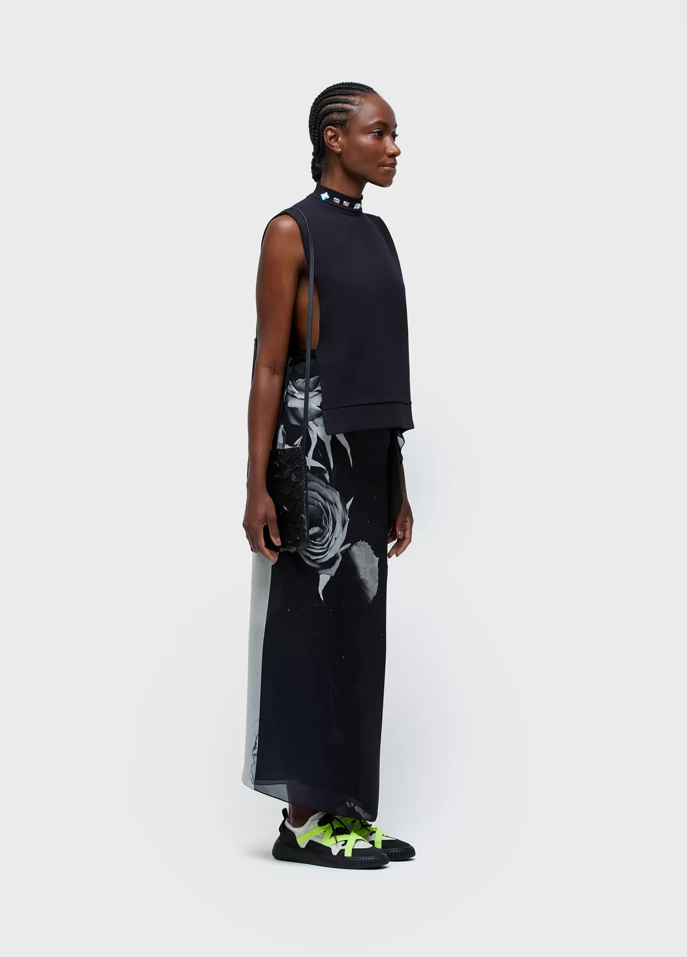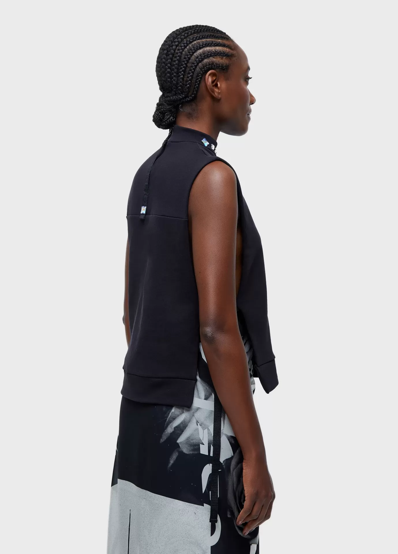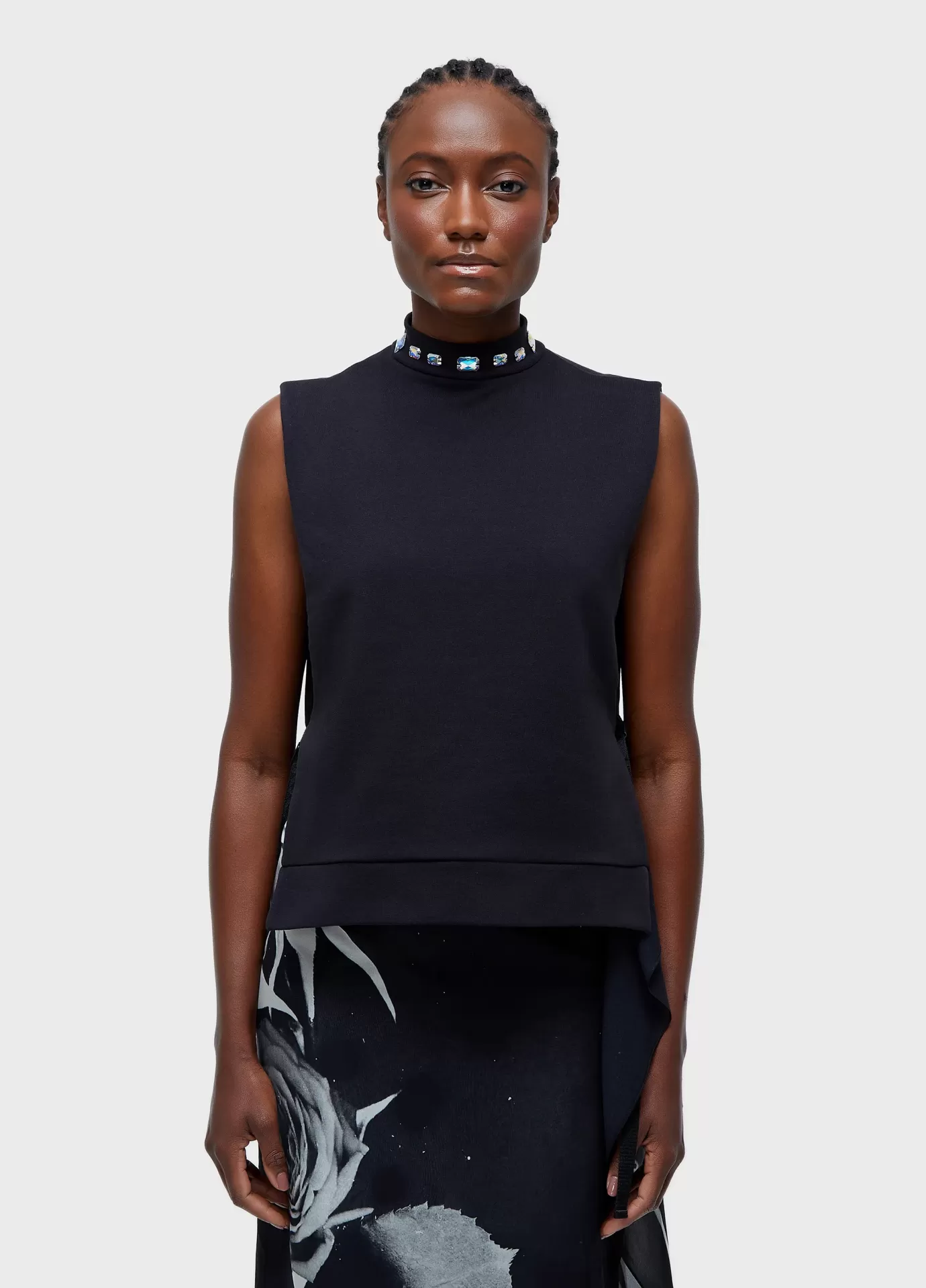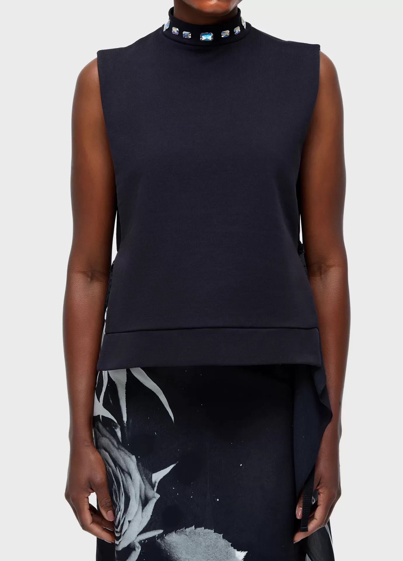 Colete de moletom com bordado de pedras swarovski. reguladores de metais e fitas pers
