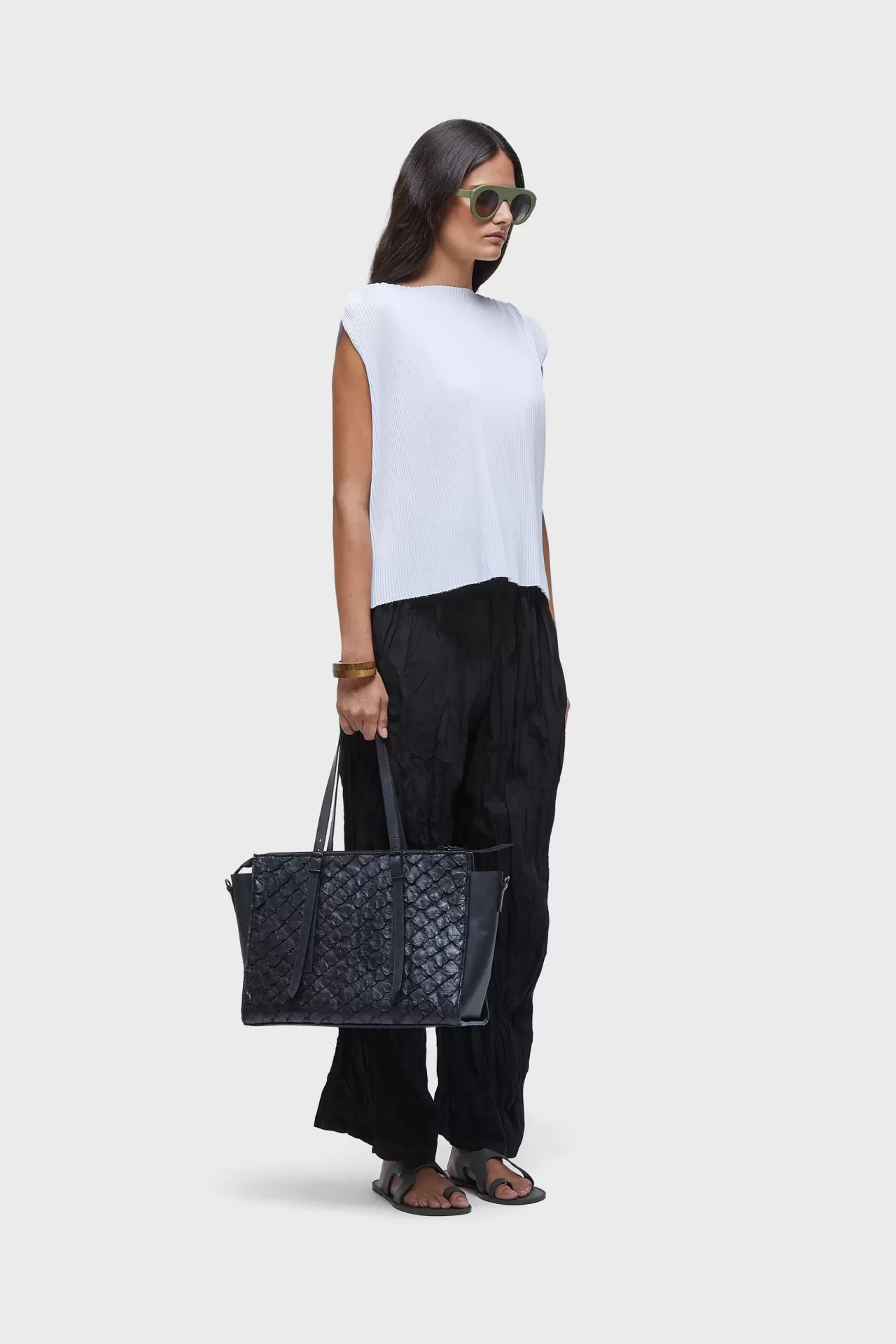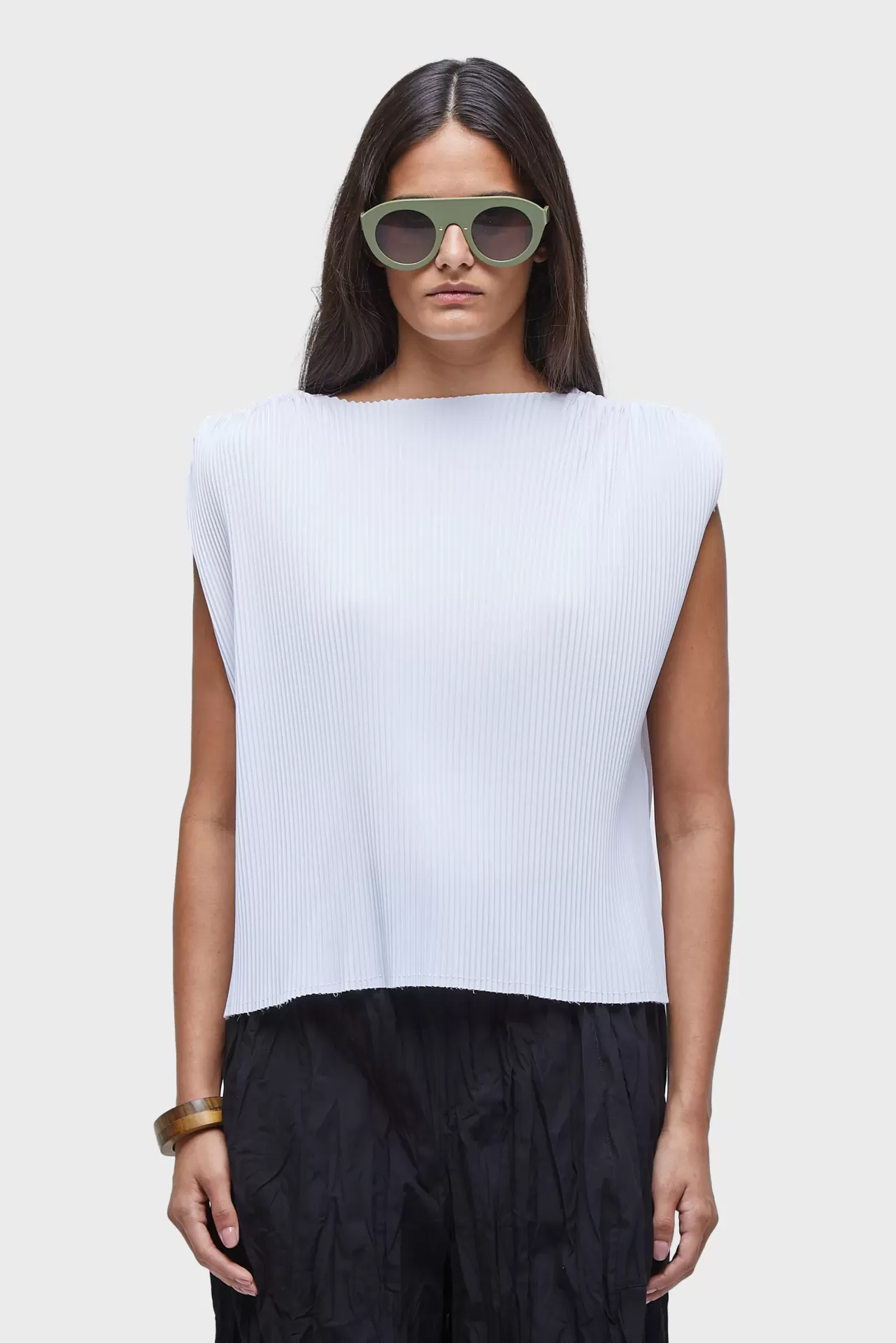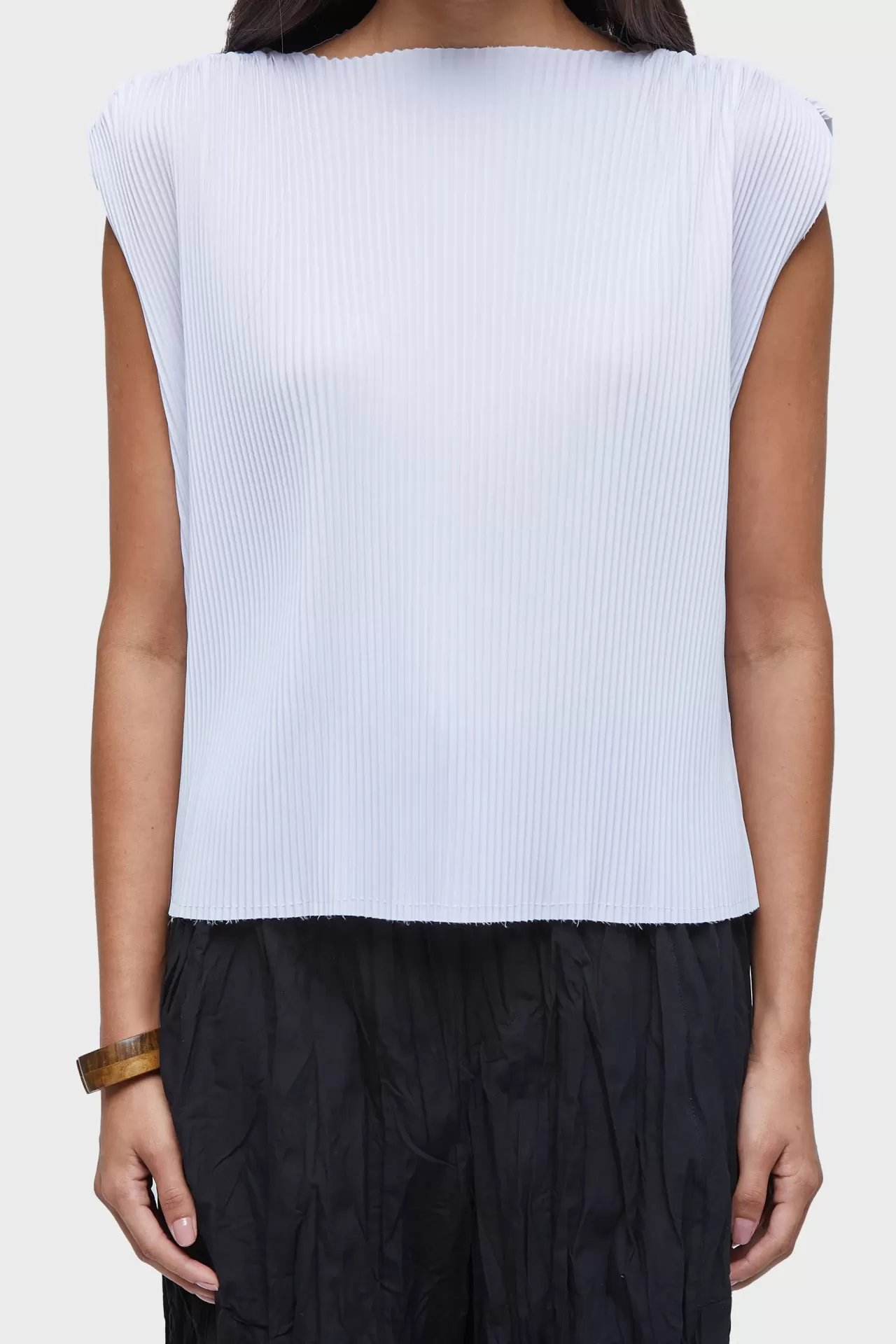 Blusa sem mangas de gola subidinha. comprimento regular. caimento reto. peça plissada