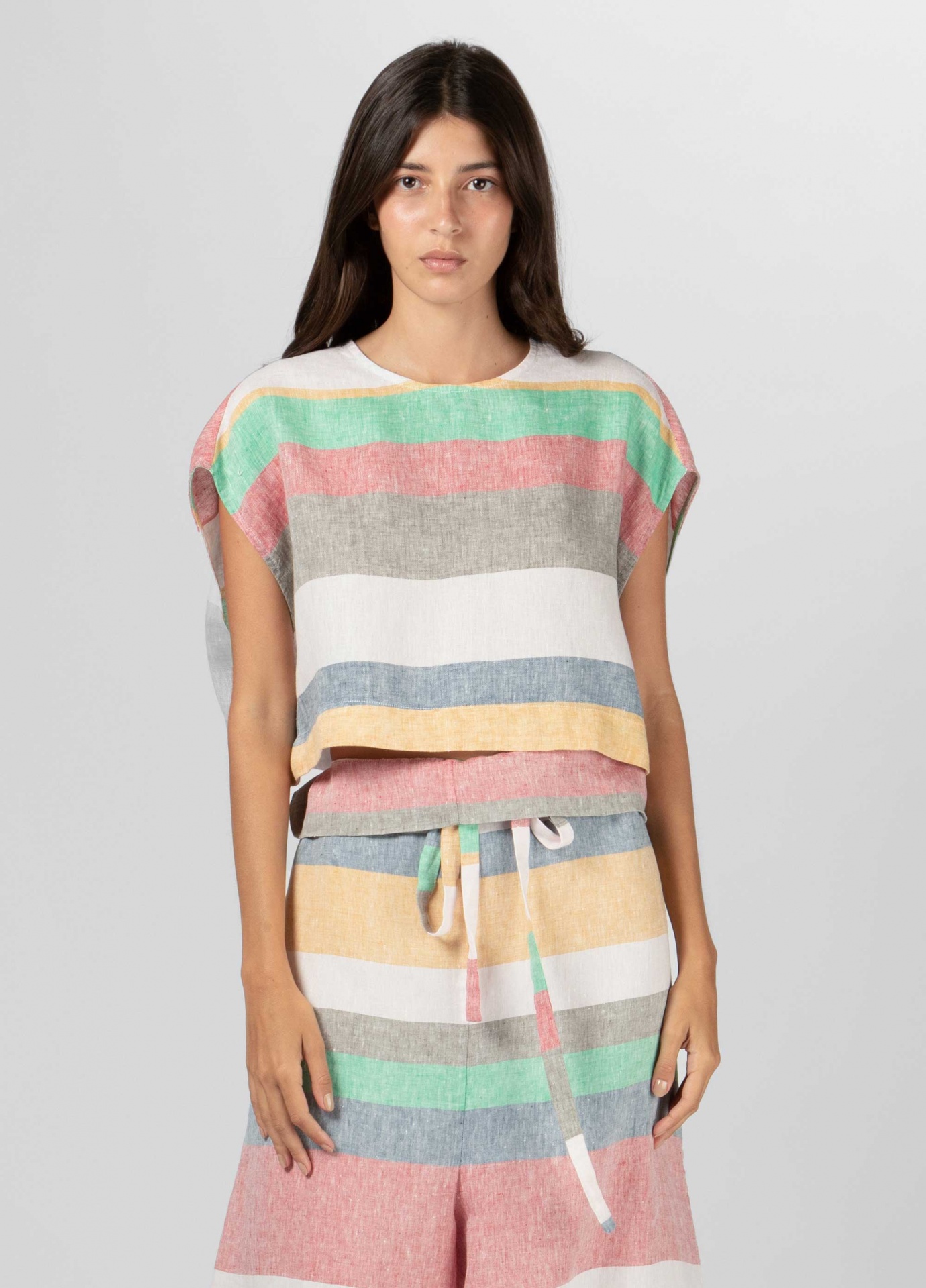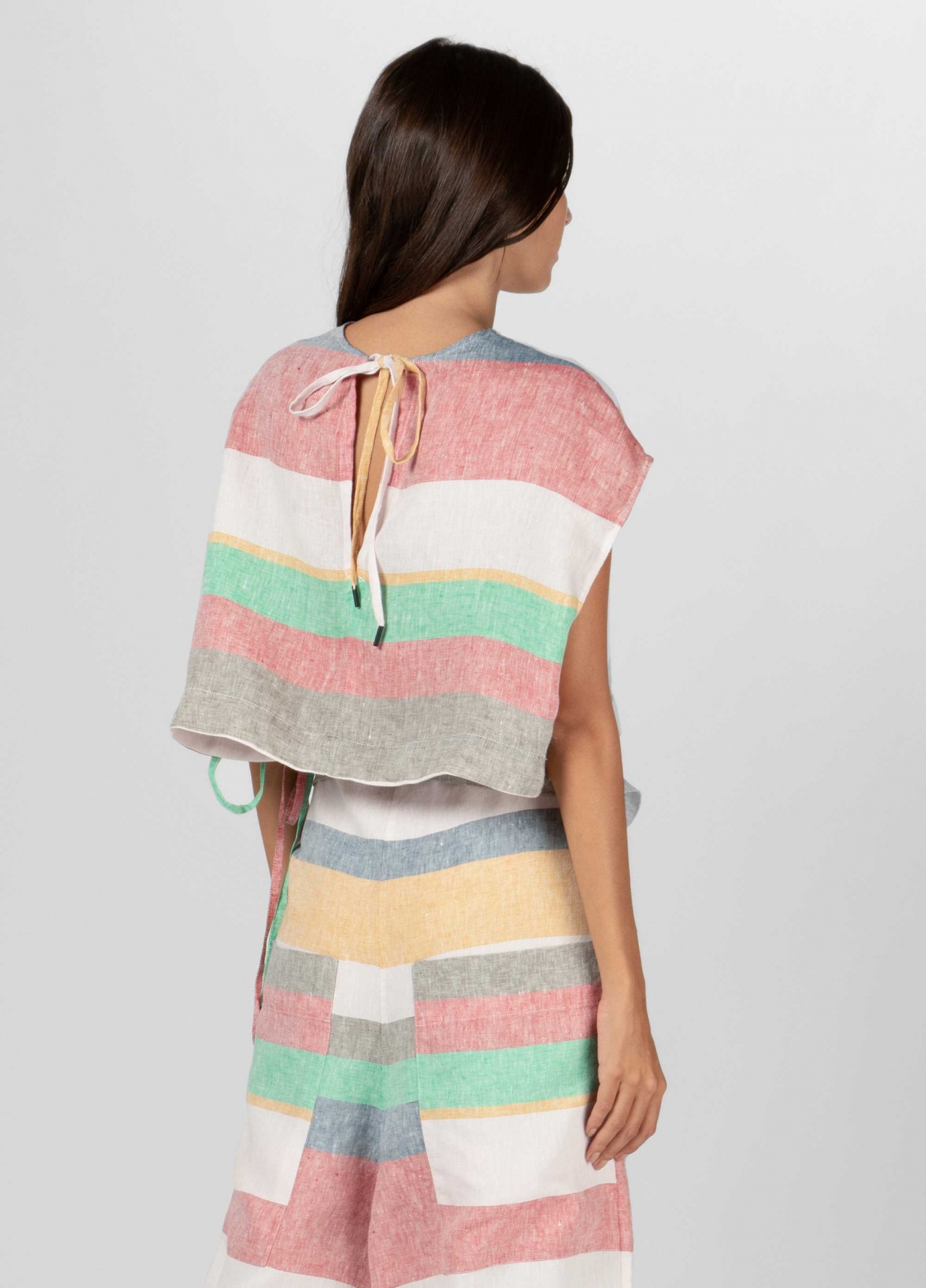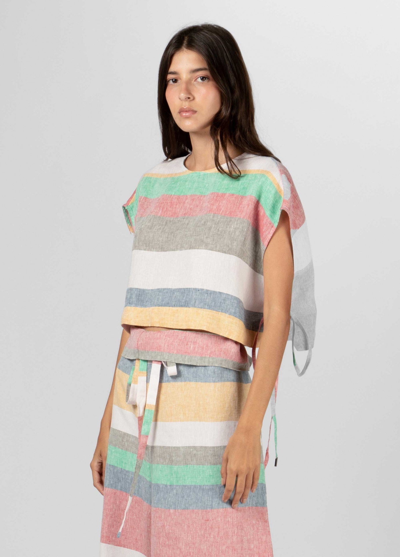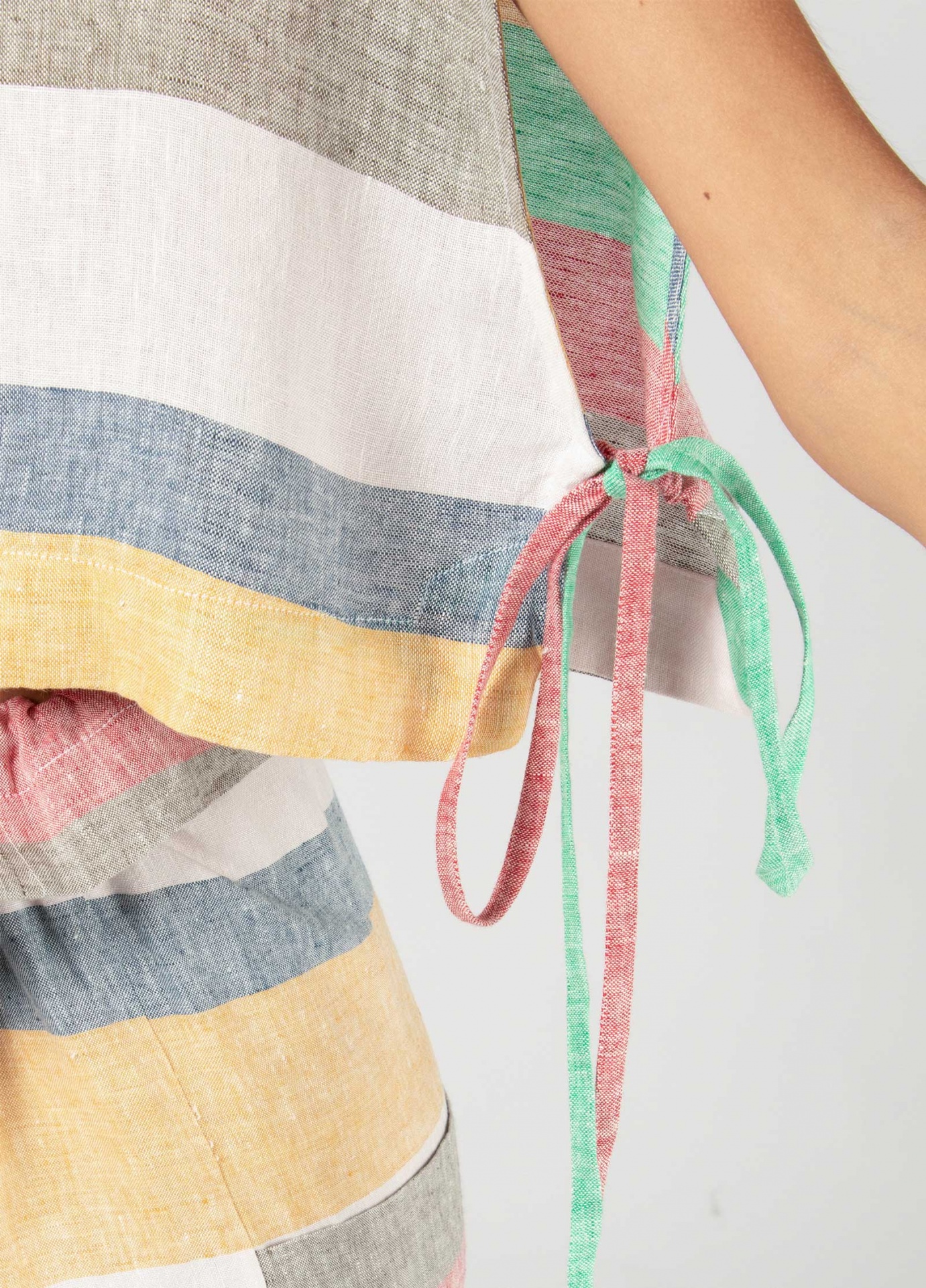 Top feminino, cropped, com amarração nas costas e na lateral, listrado em fio tinto colorido em 100% linho. Fibras Nobres: Produto da linha fibras nobres.